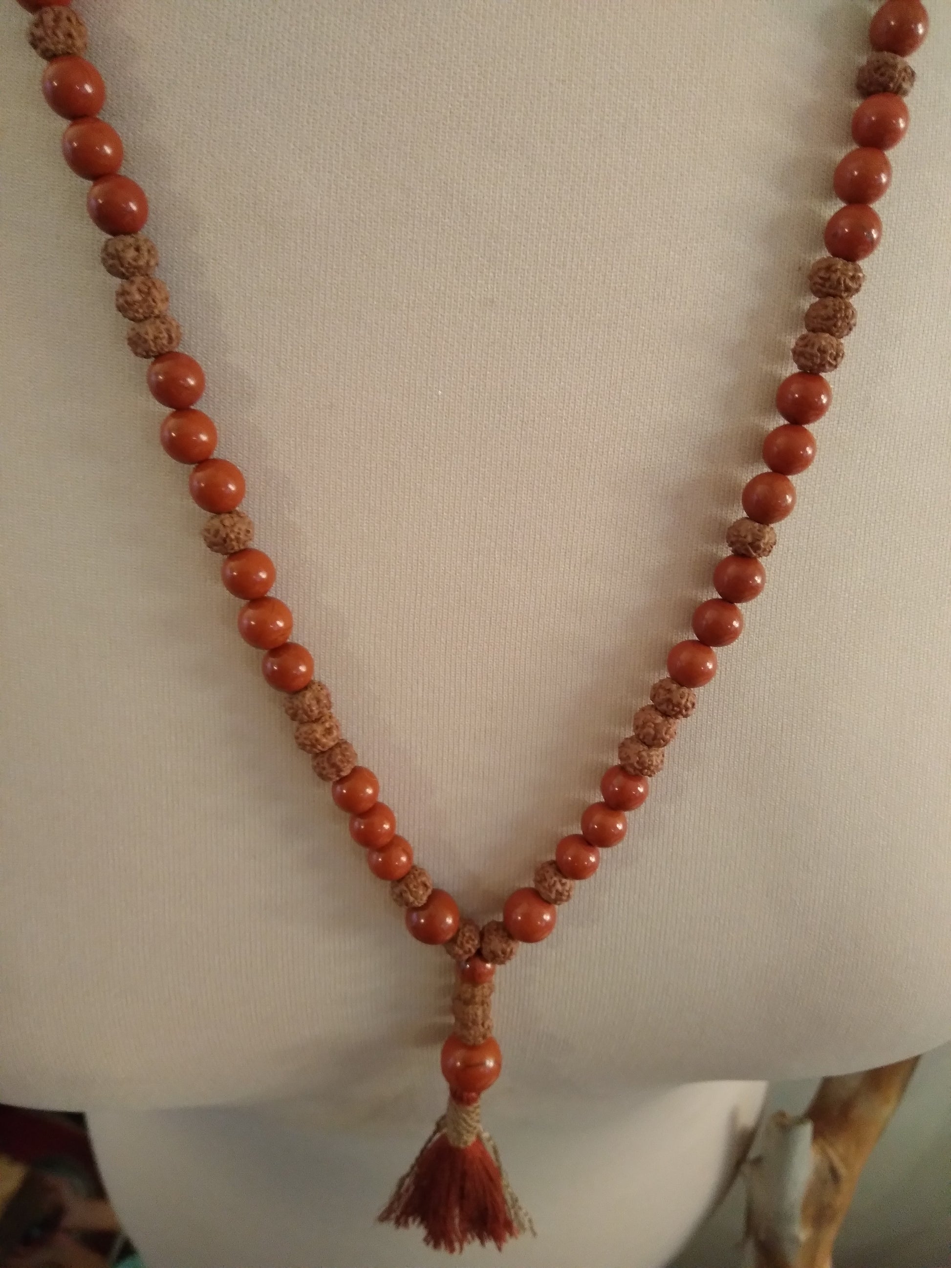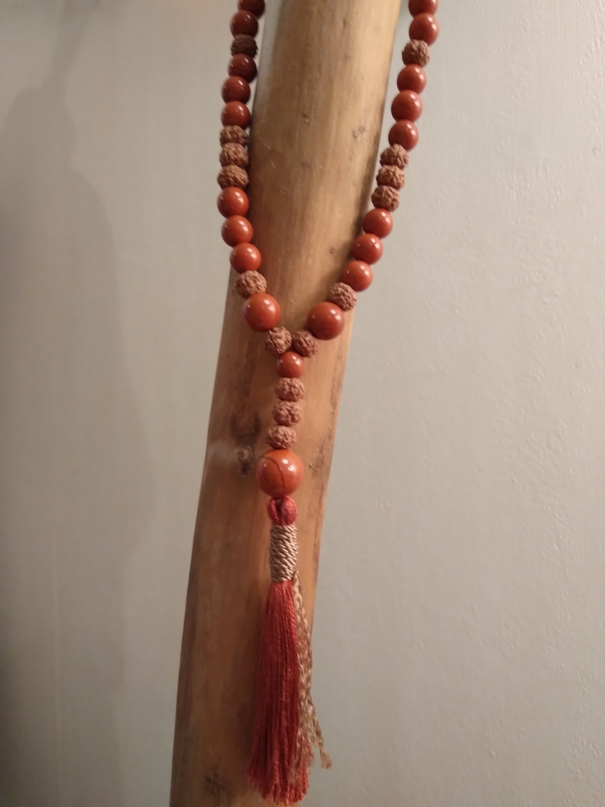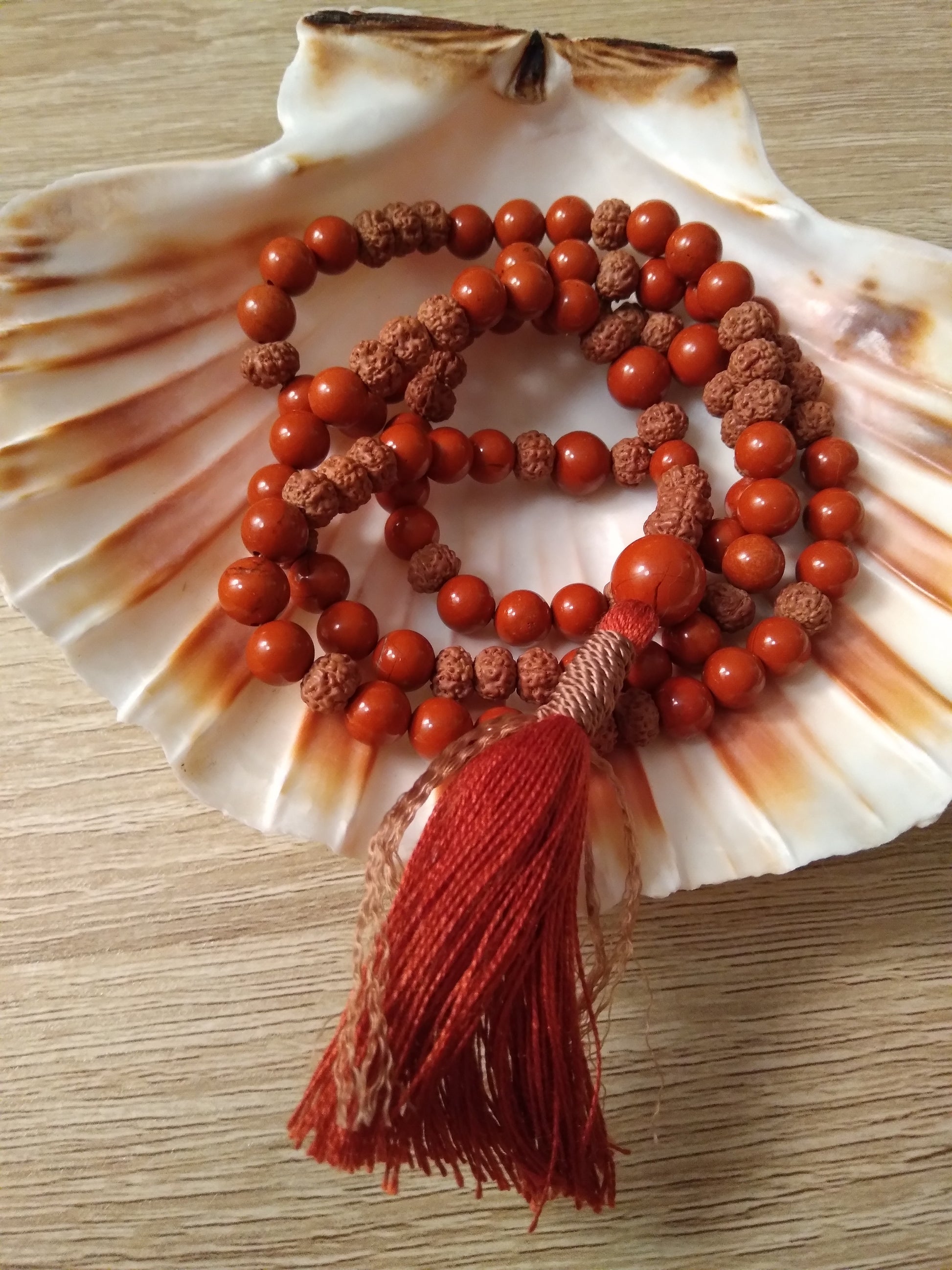 Mala en jaspe rouge et graines de rudraksha "Ancrage"
