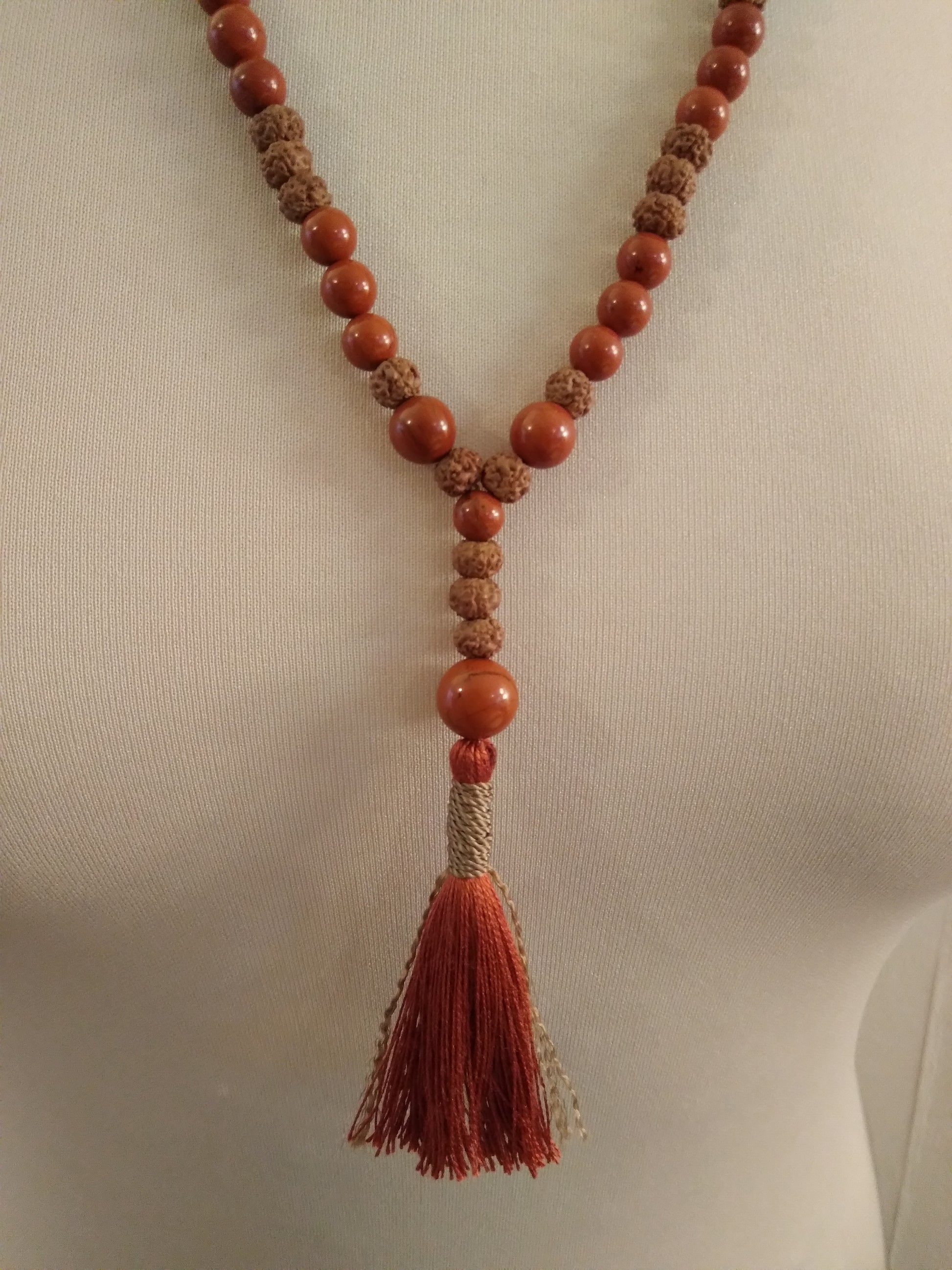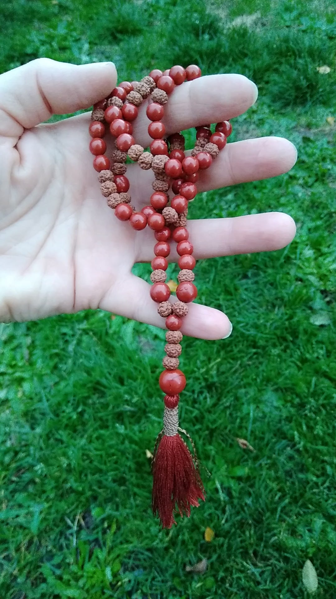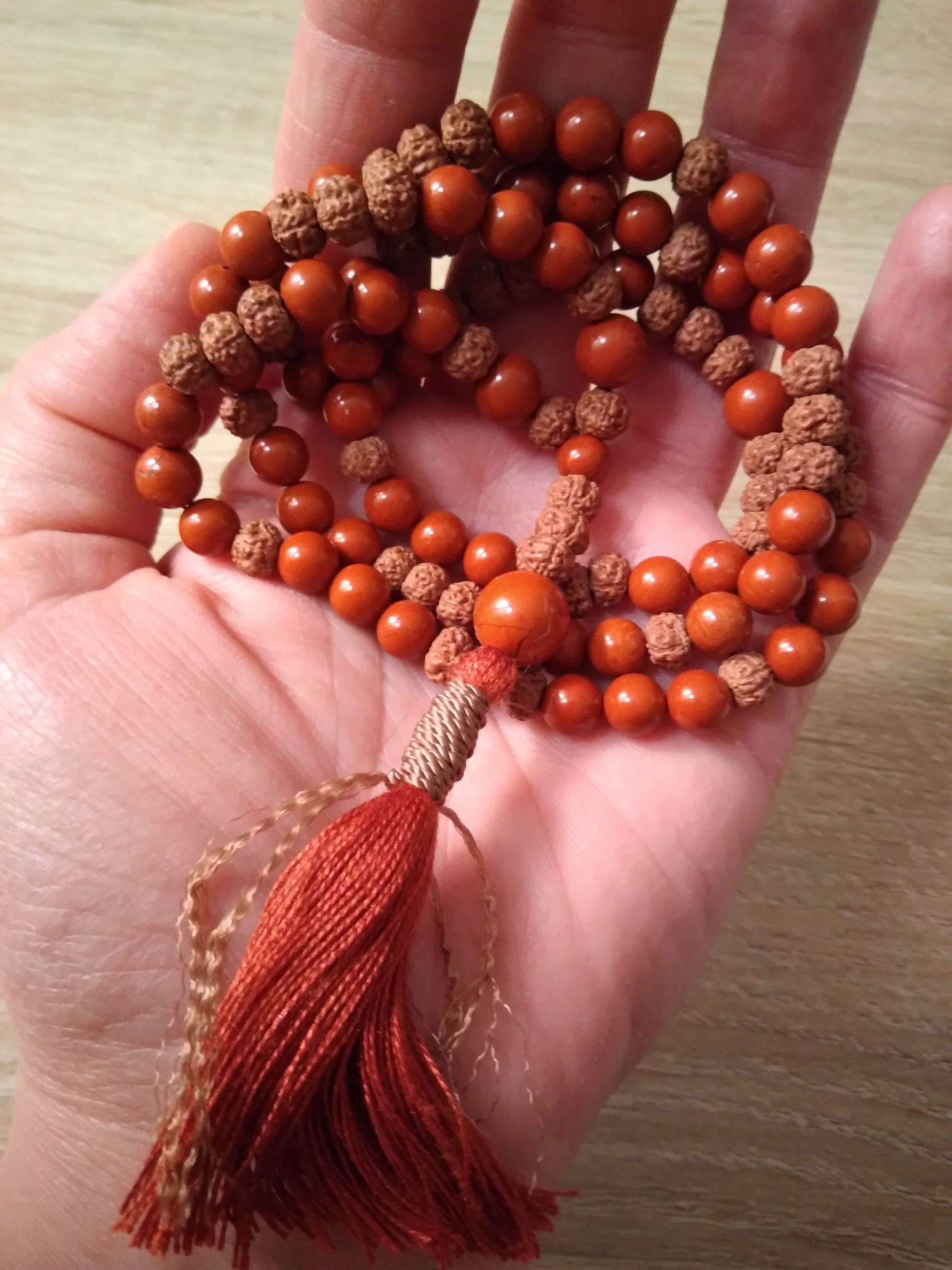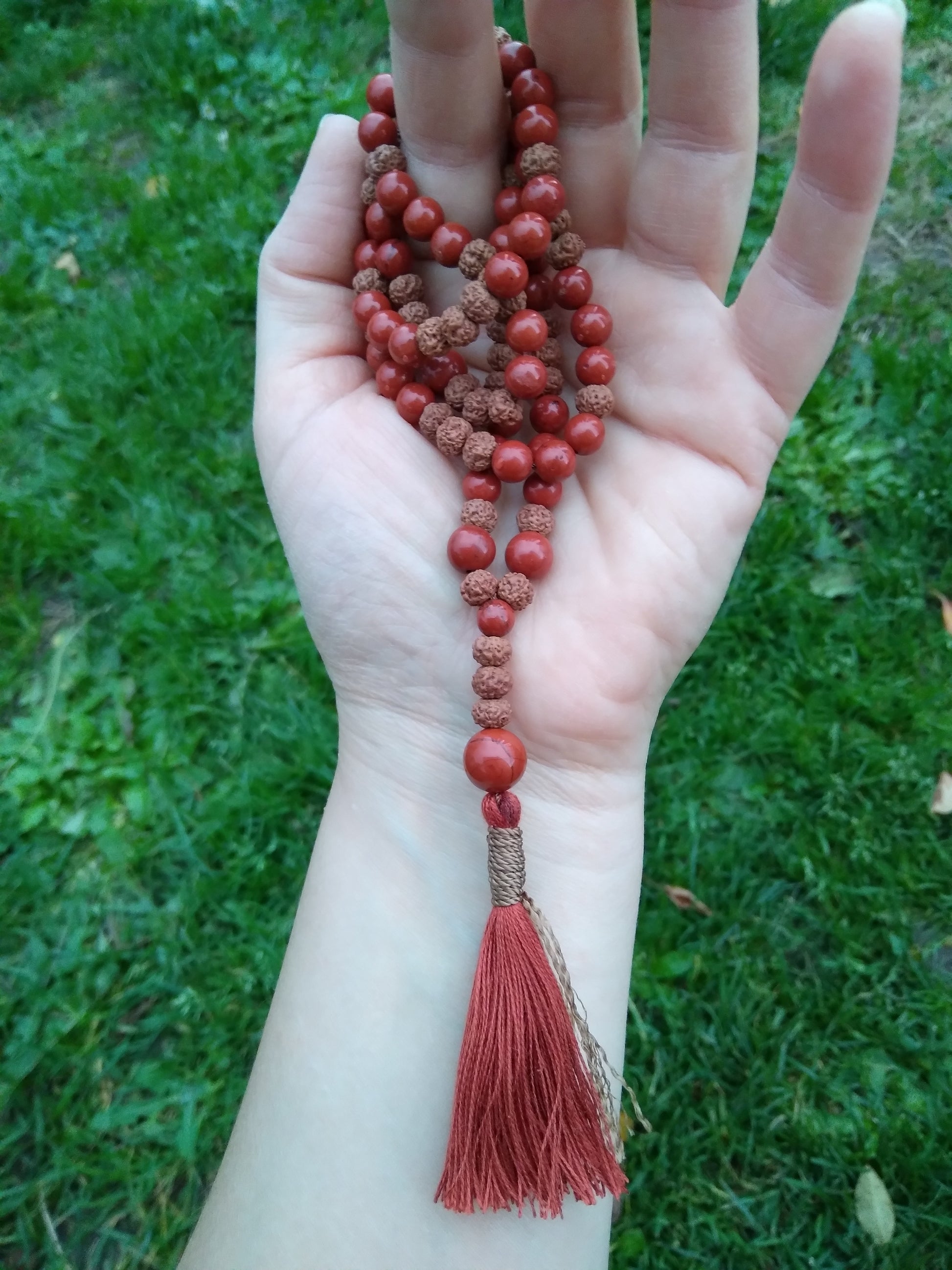 Mala en jaspe rouge et graines de rudraksha "Ancrage"