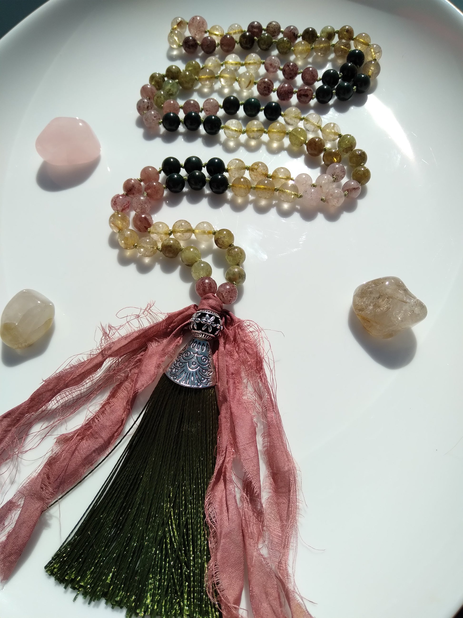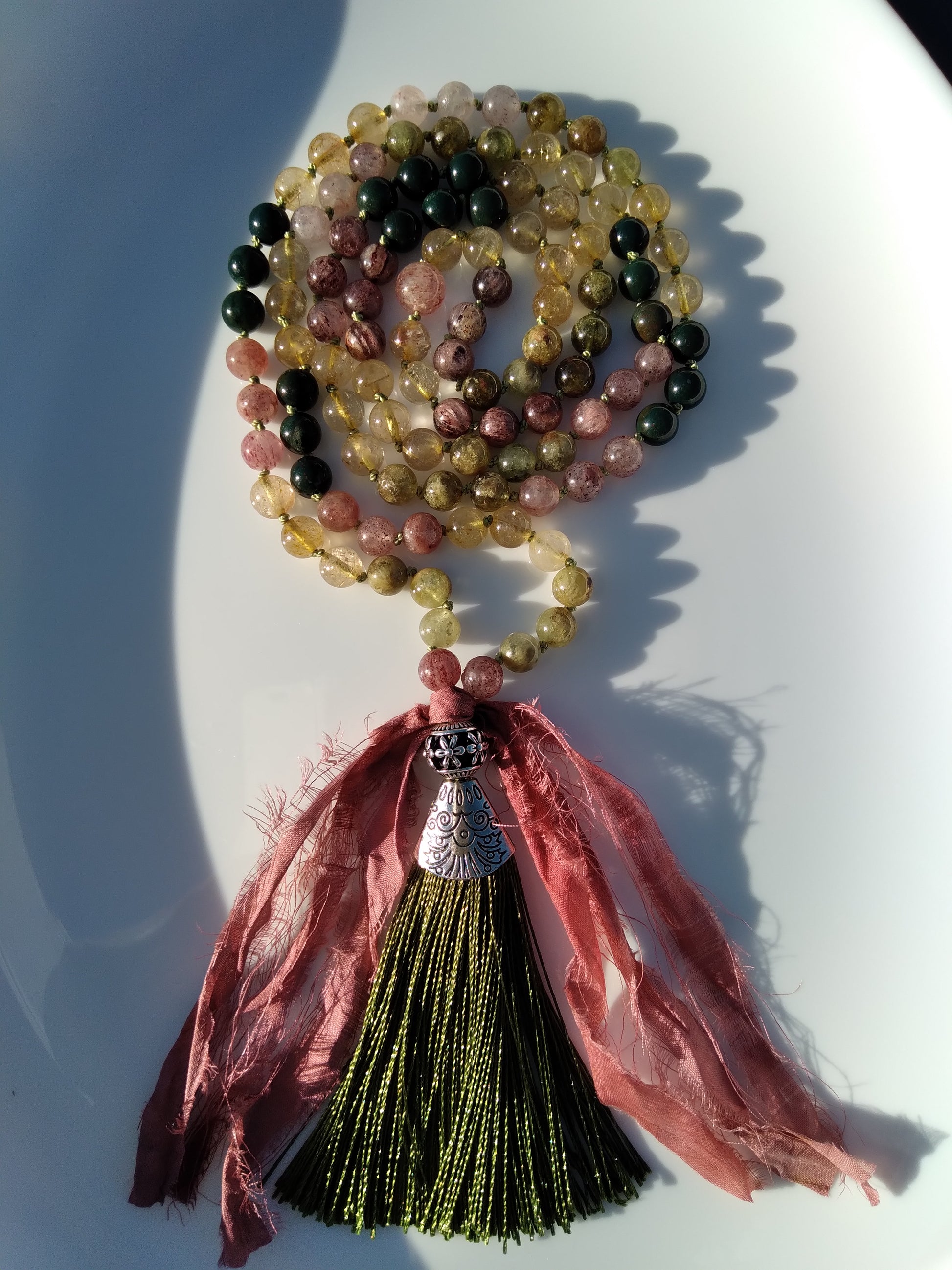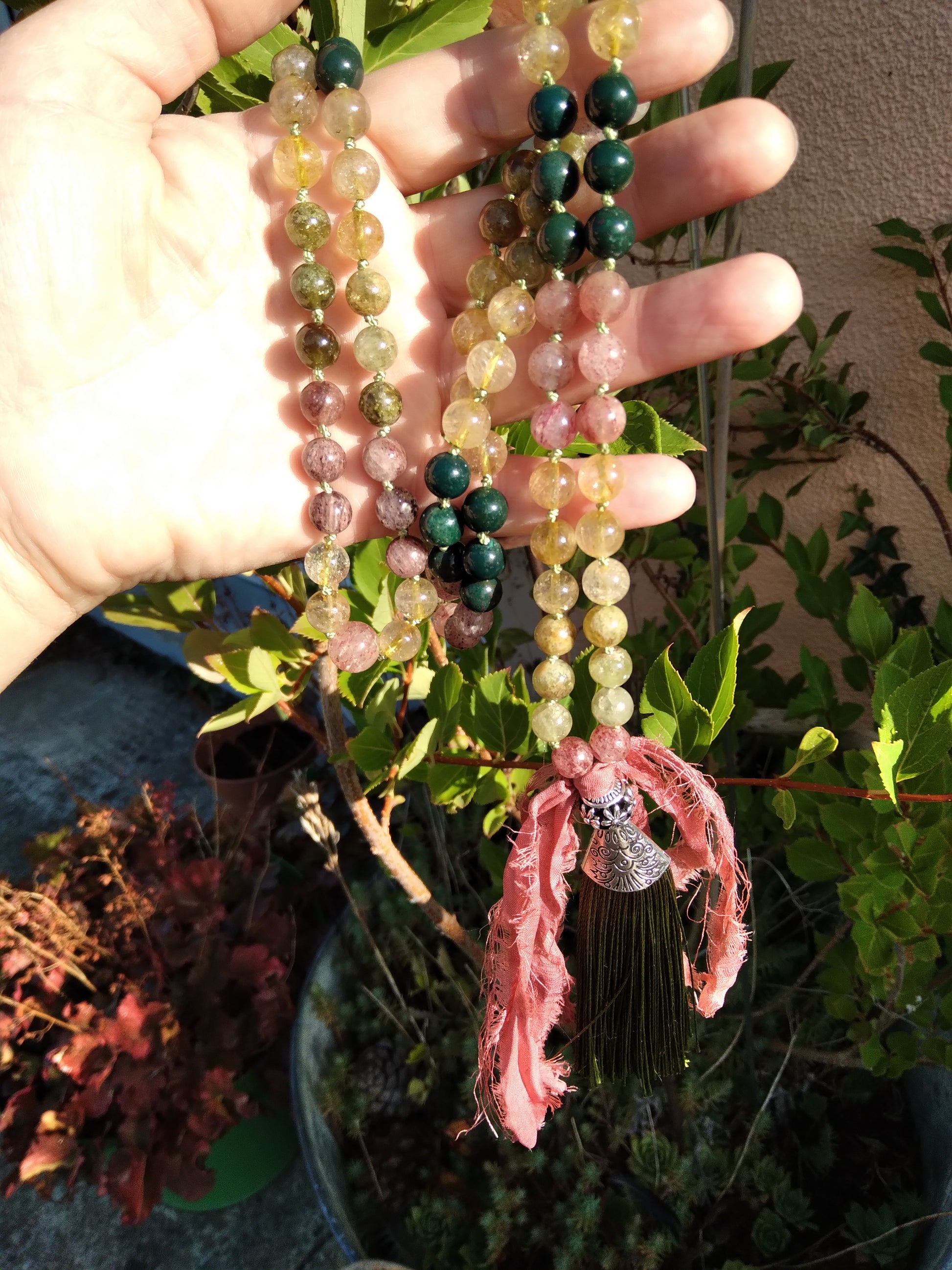Mala en quartz fraise, grenat vert, quartz rutile et héliotrope