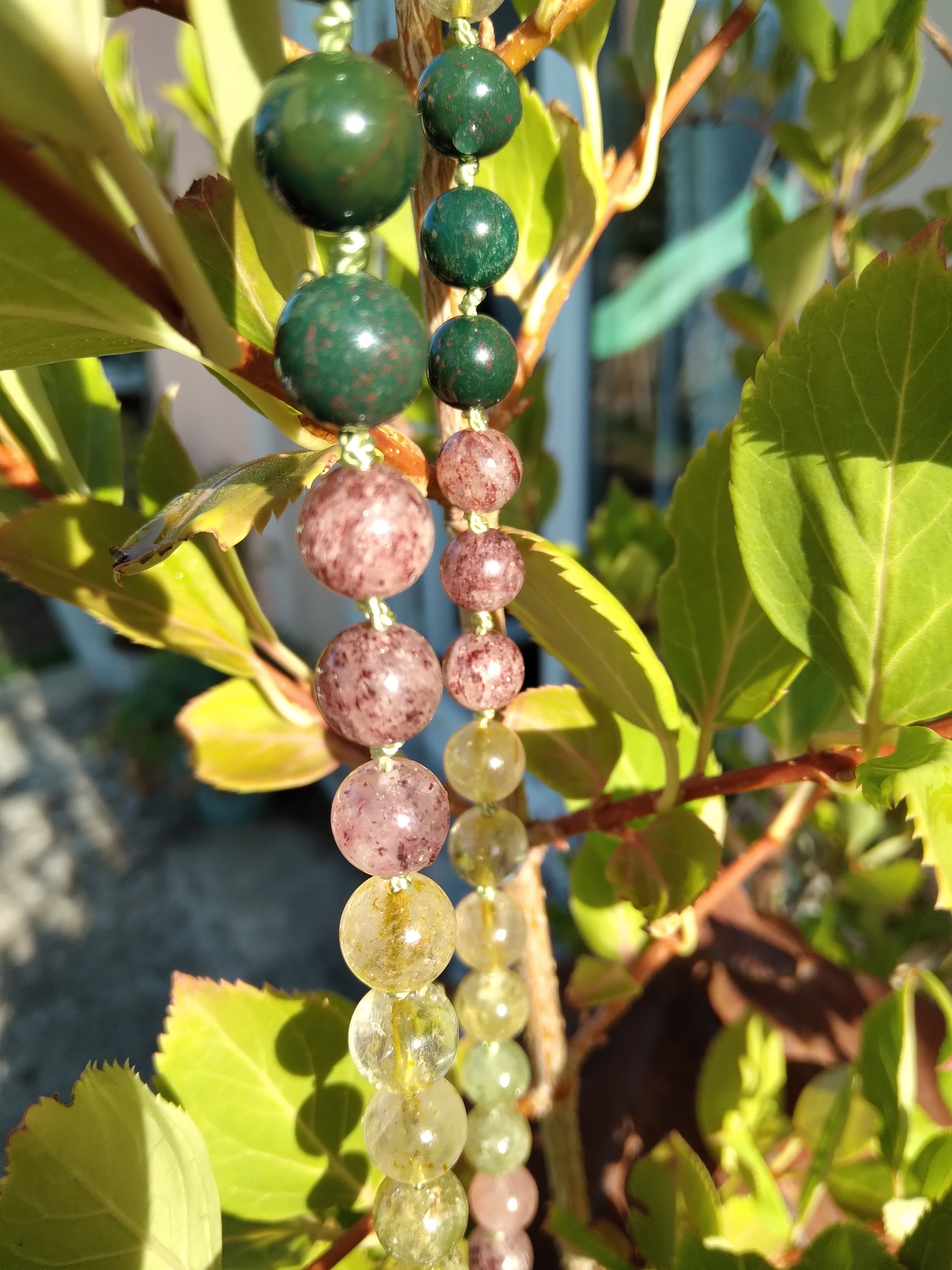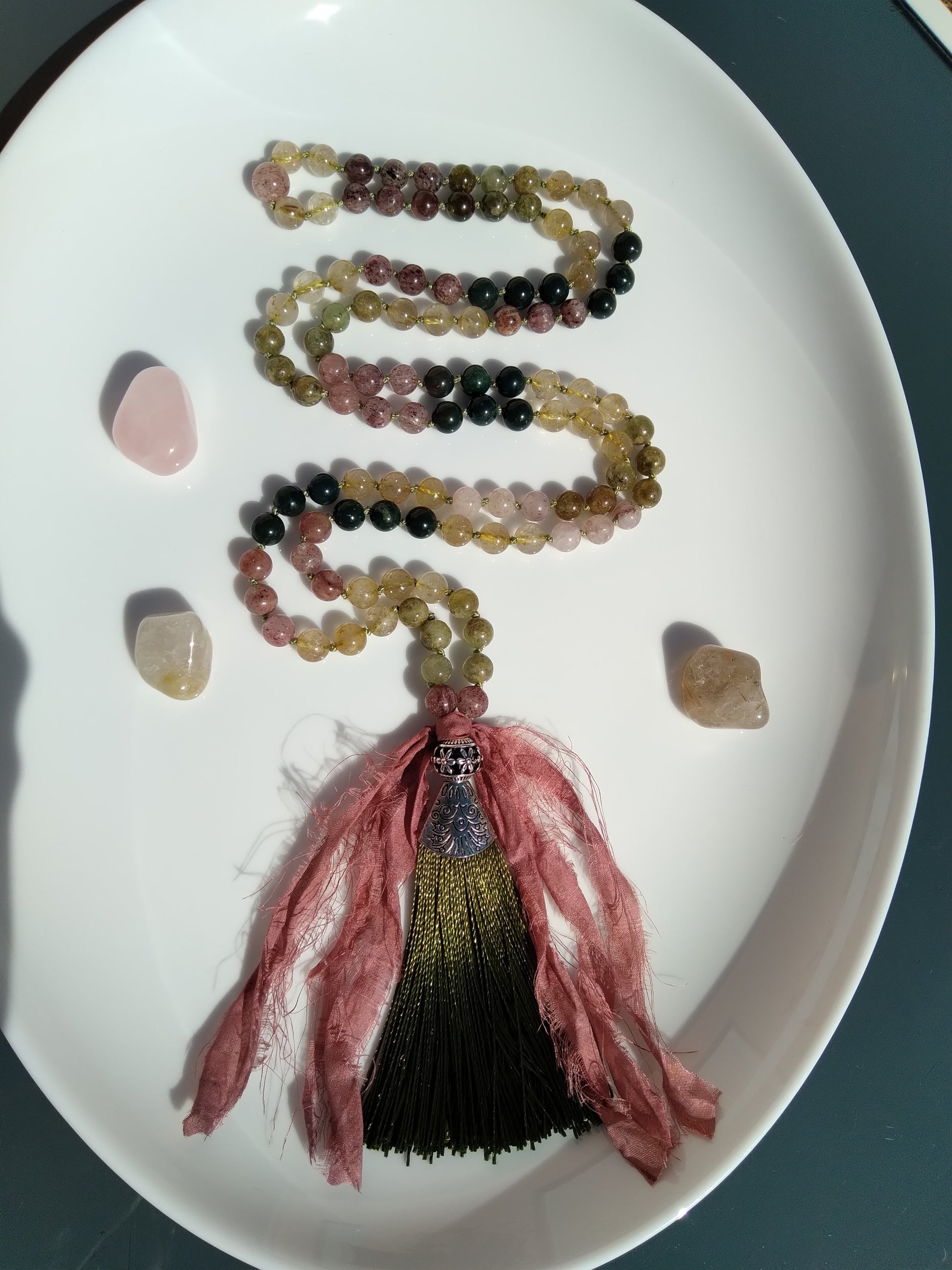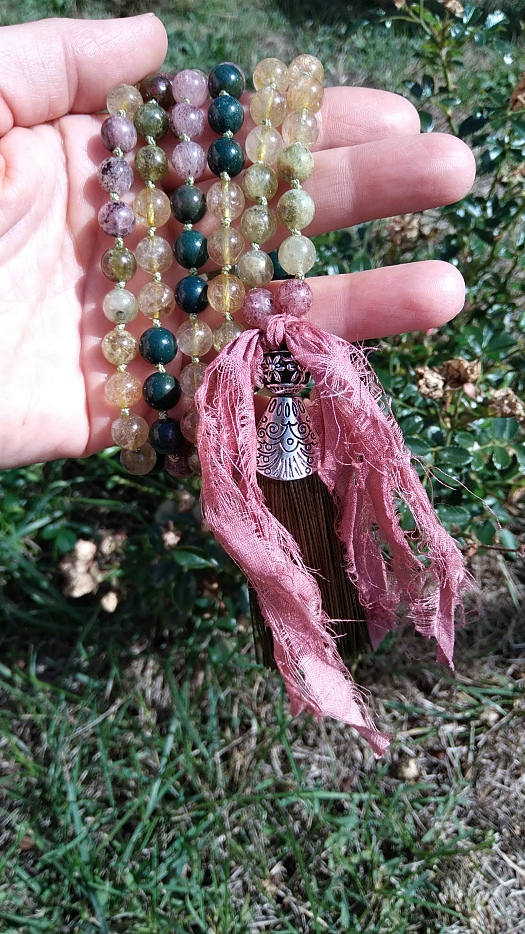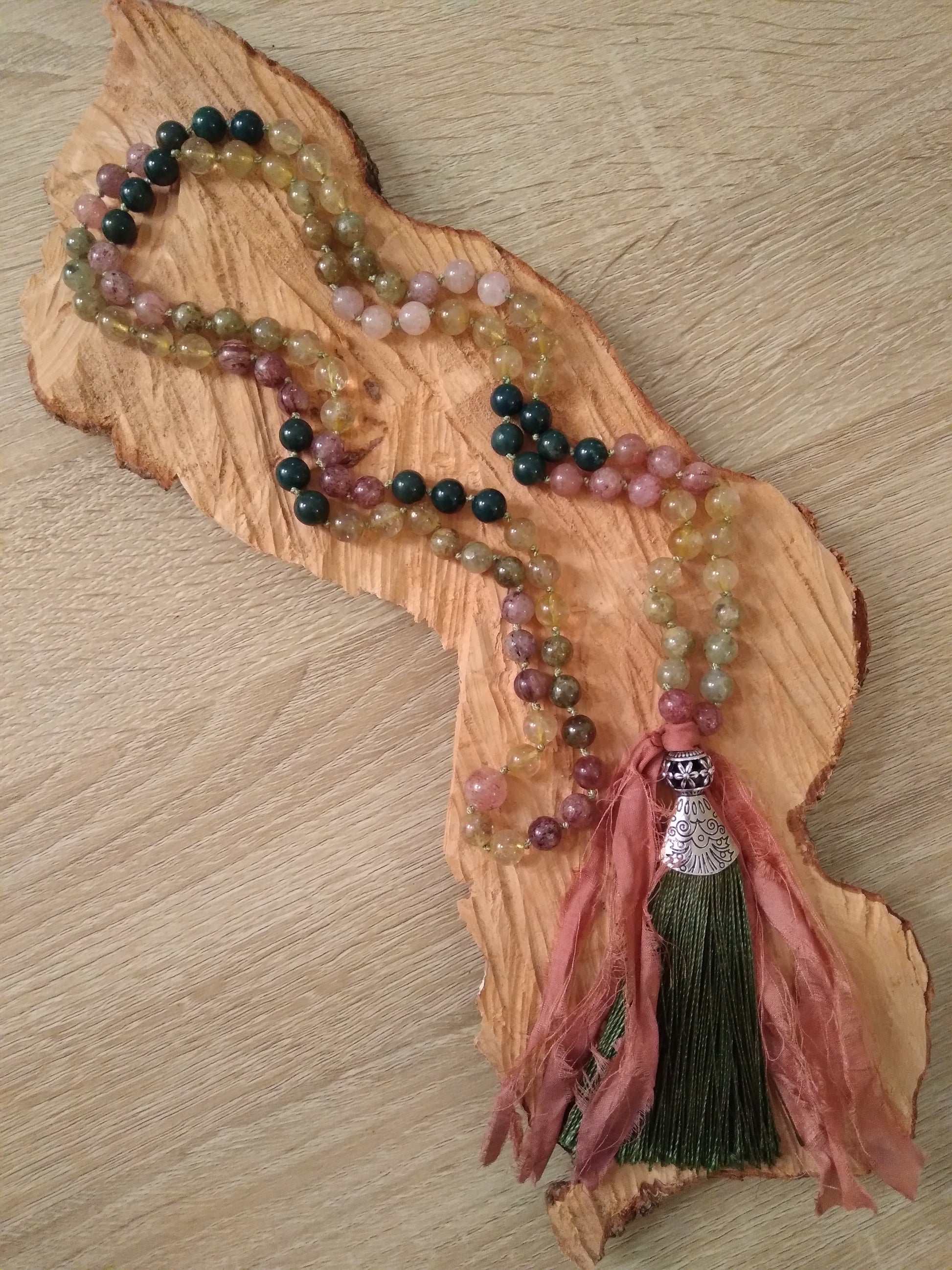 Mala en quartz fraise, grenat vert, quartz rutile et héliotrope