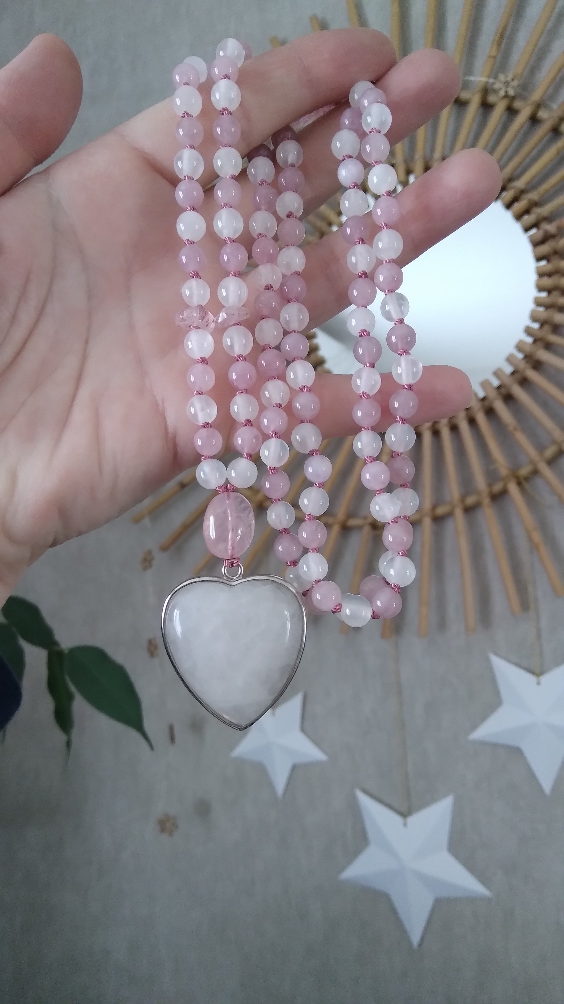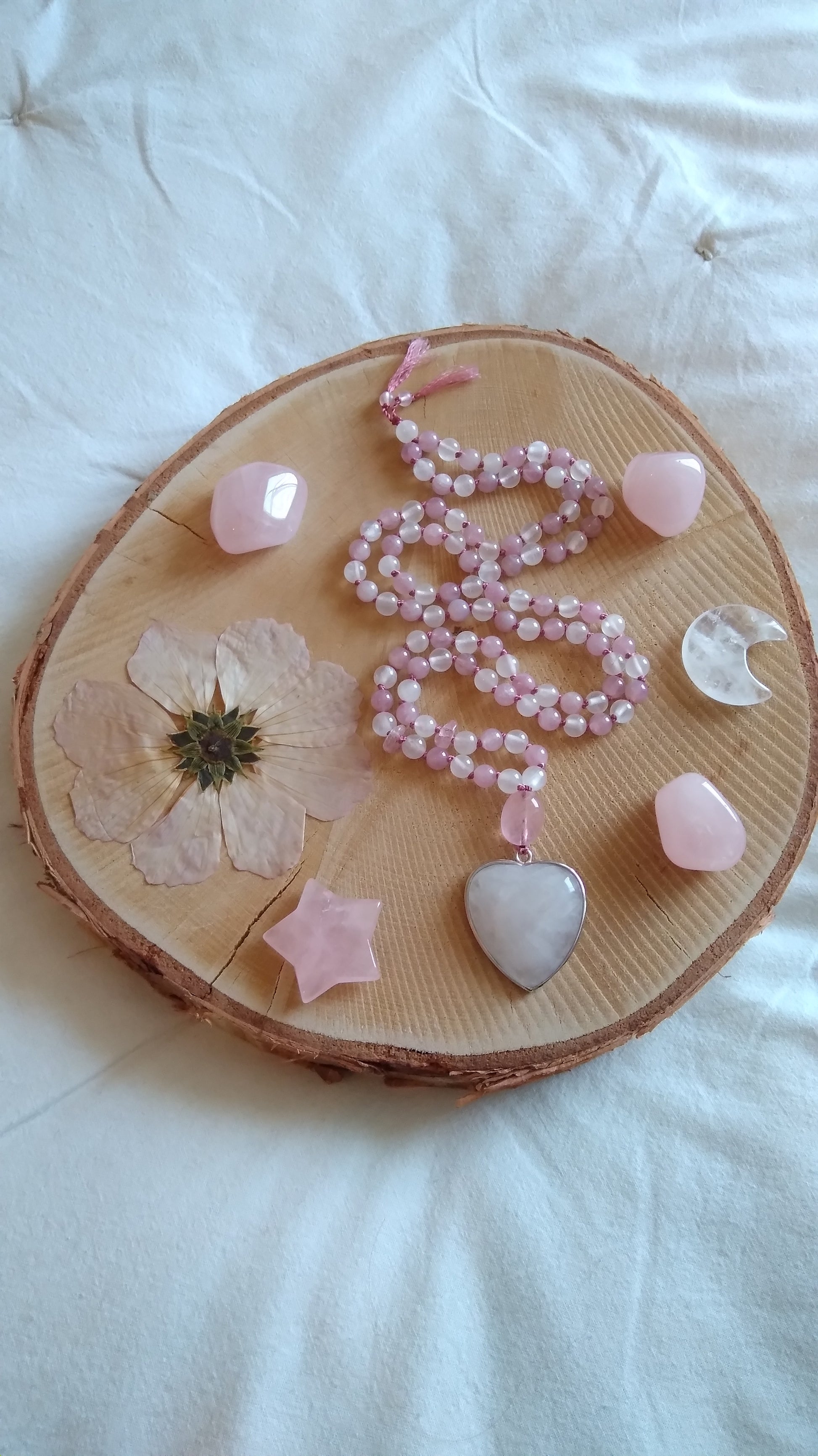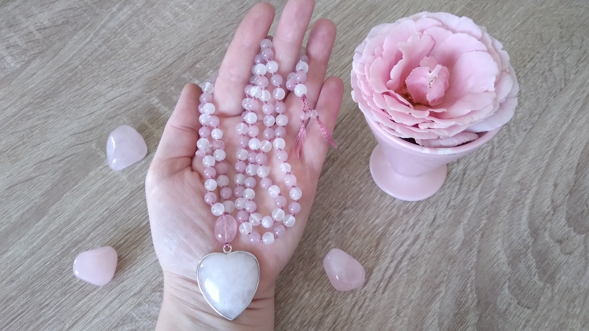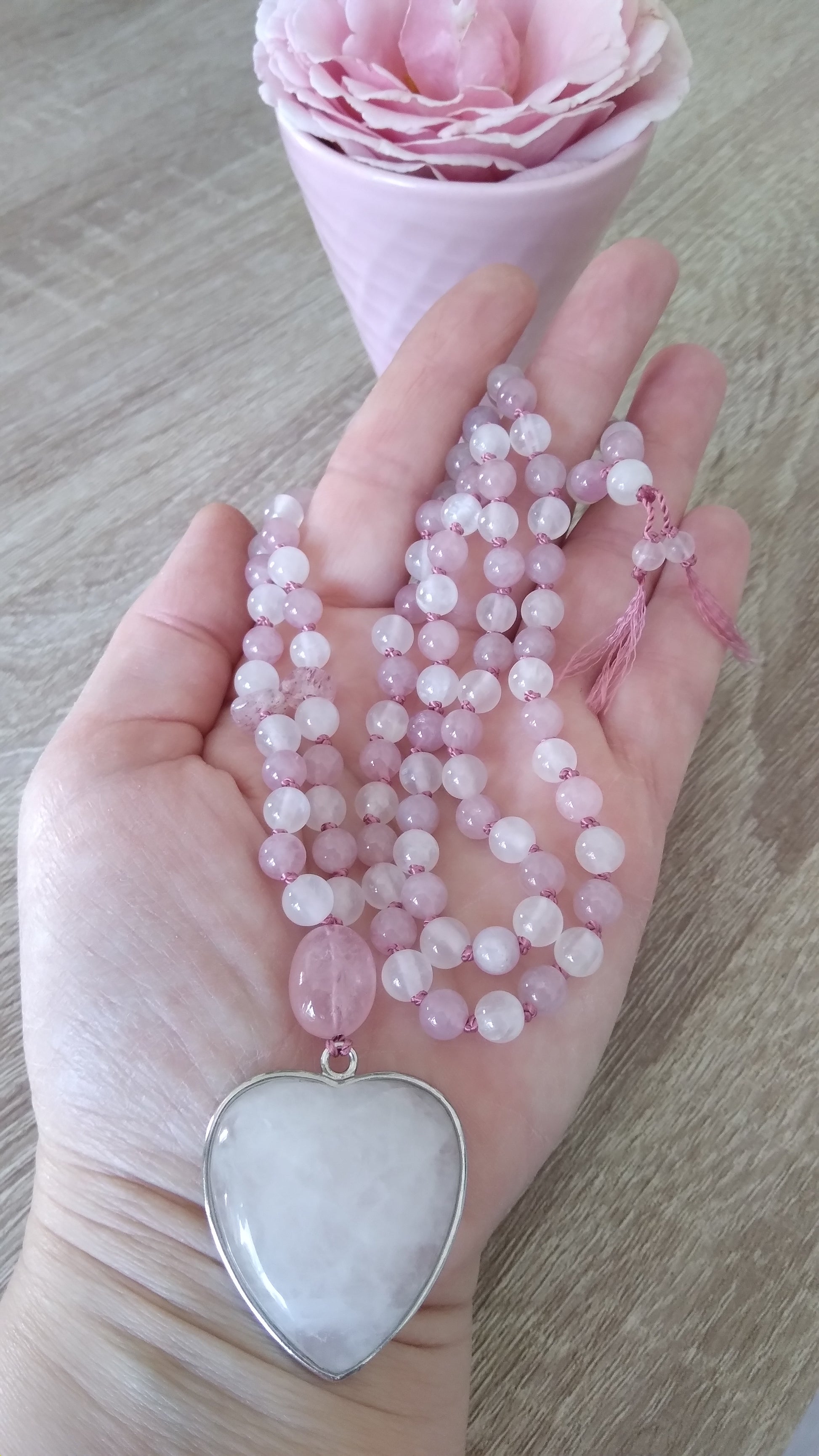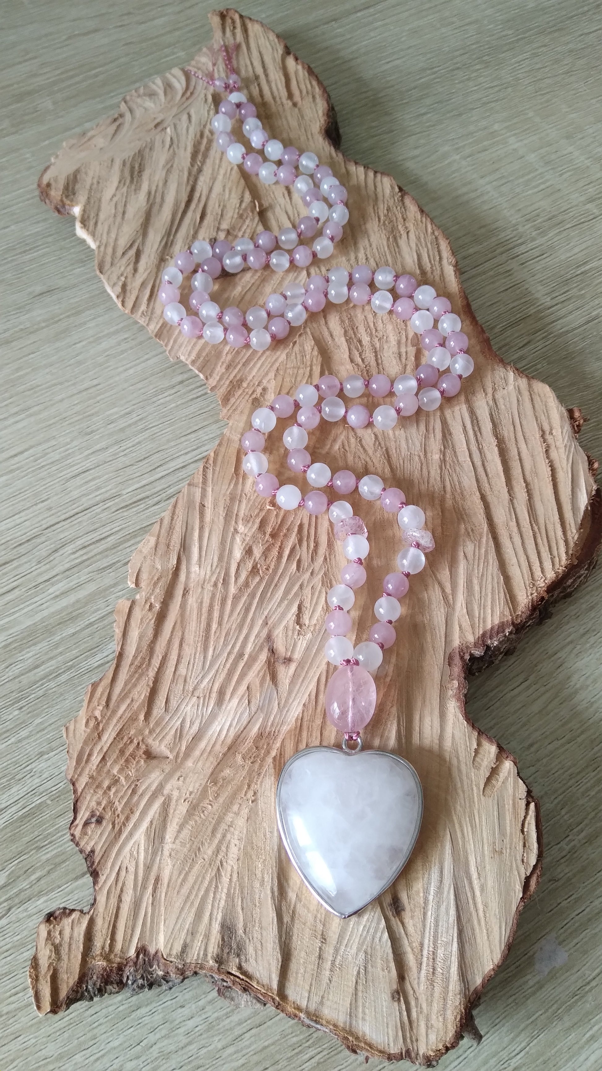 Mala en quartz rose, sélénite et morganite "Soin du cœur"