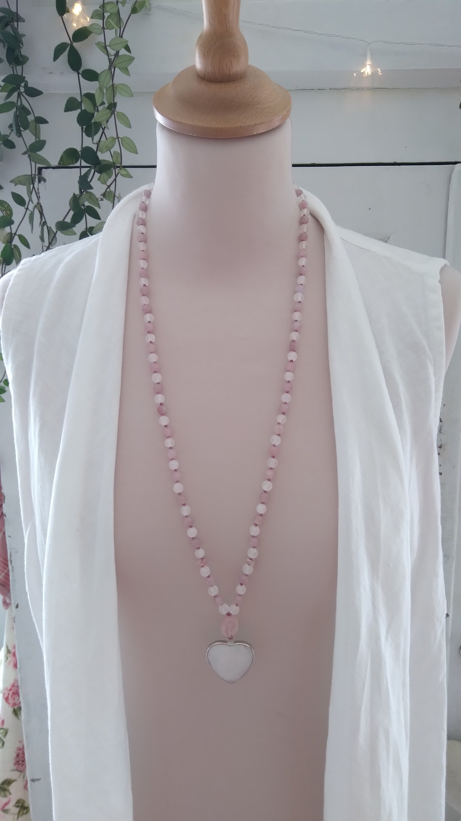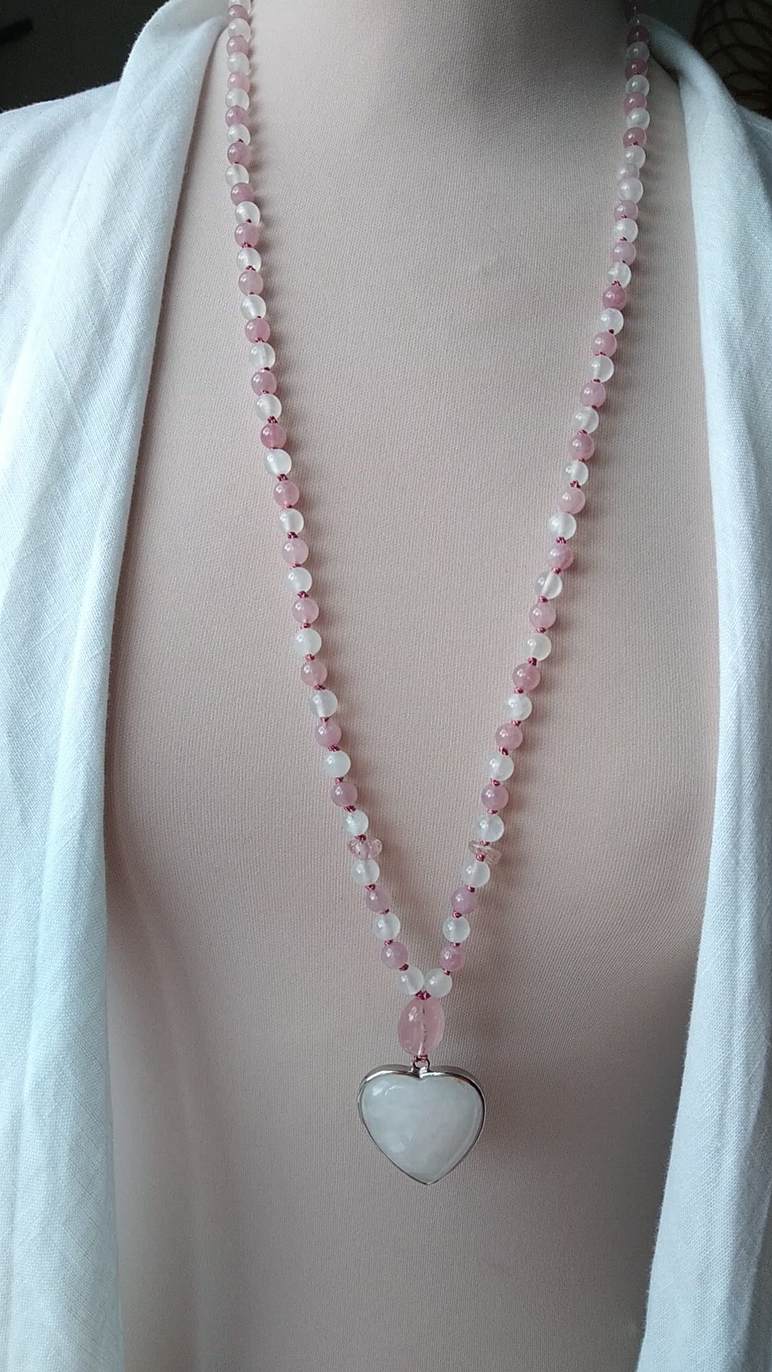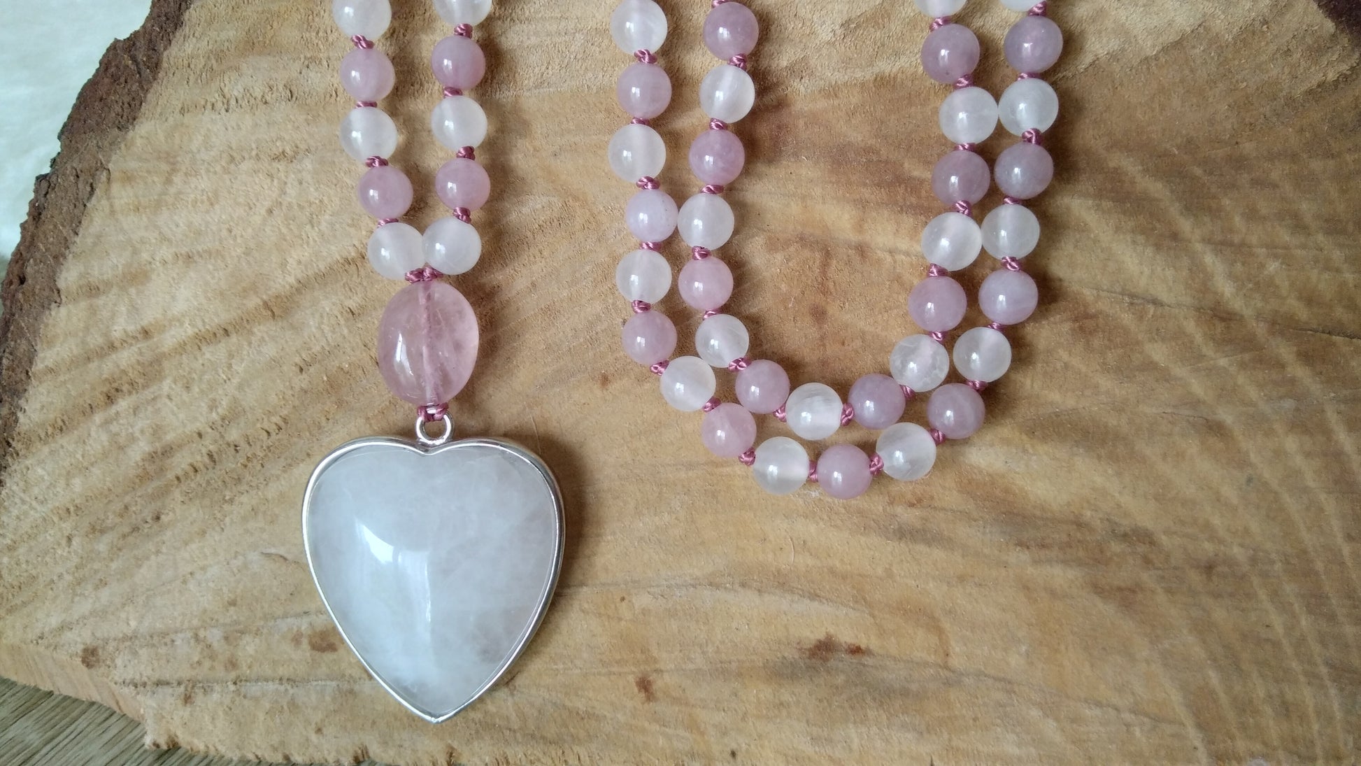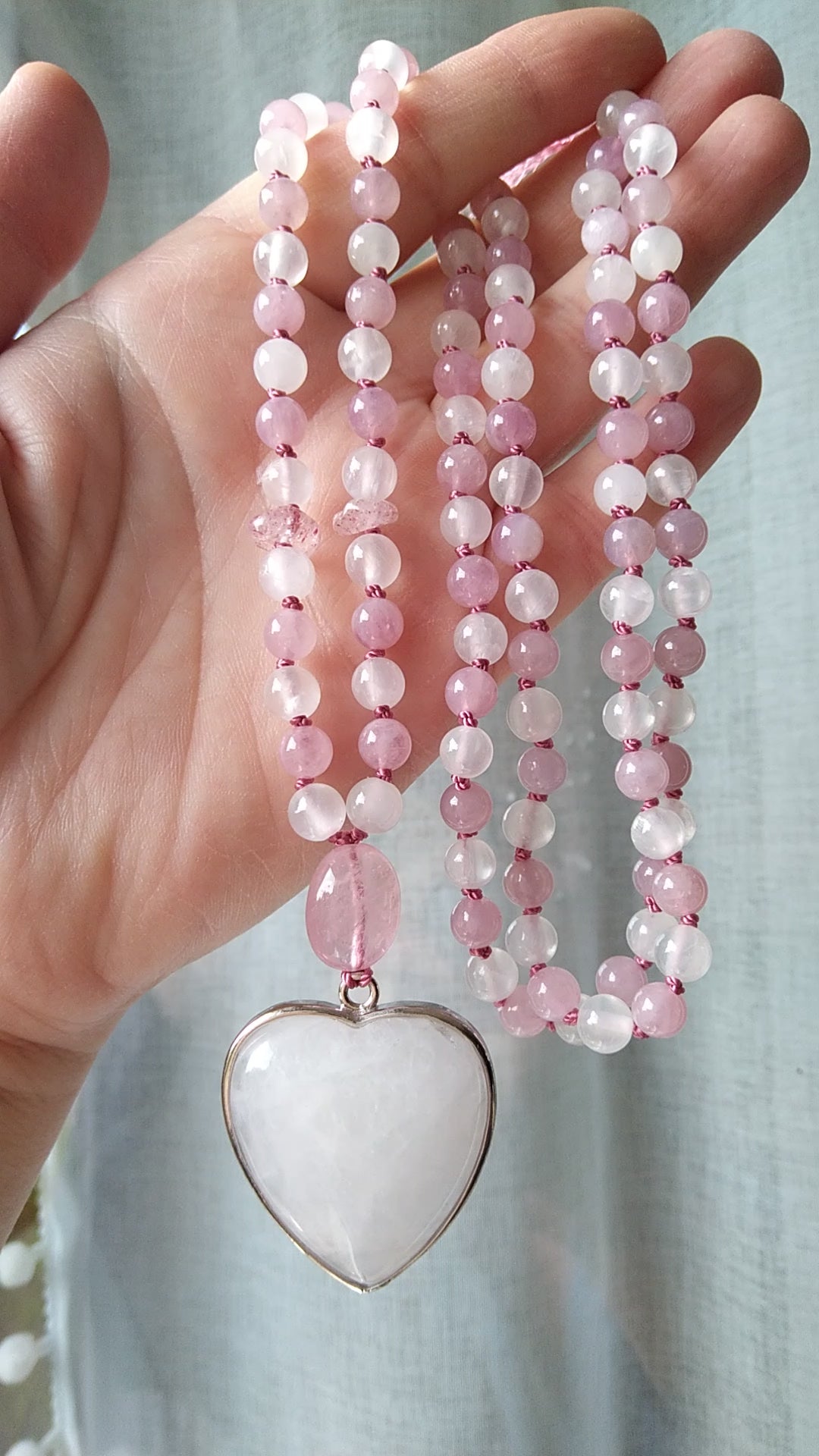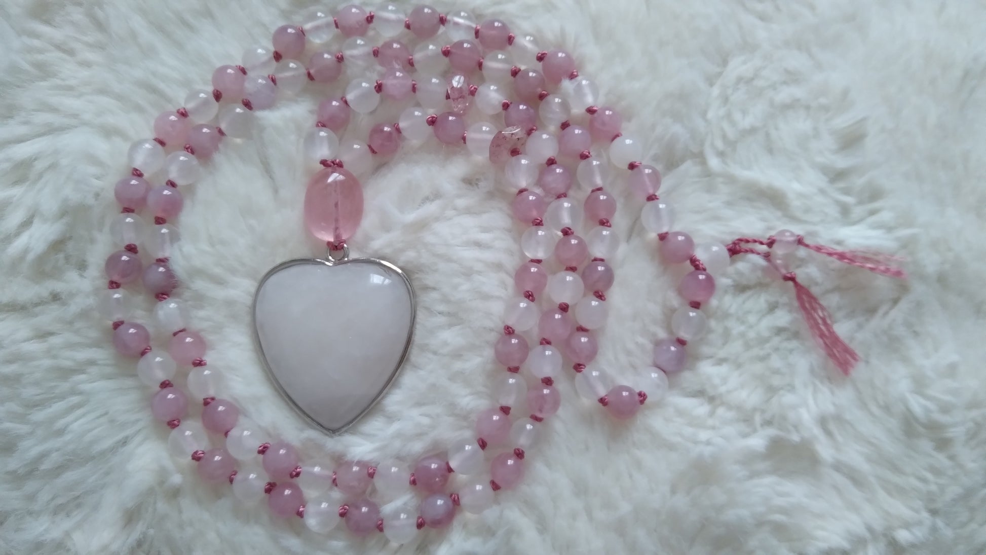 Mala en quartz rose, sélénite et morganite "Soin du cœur"