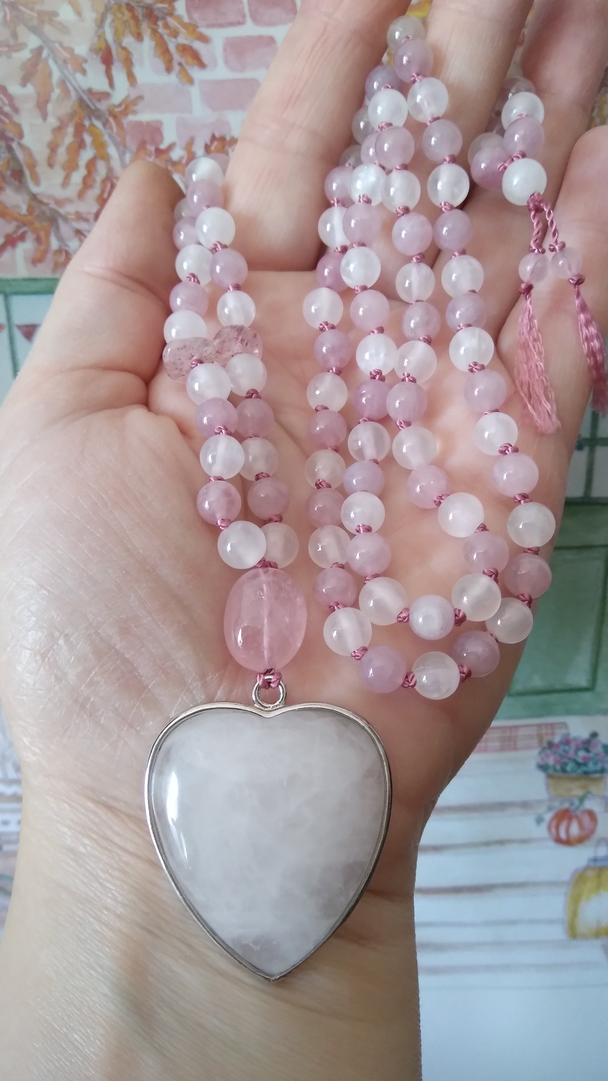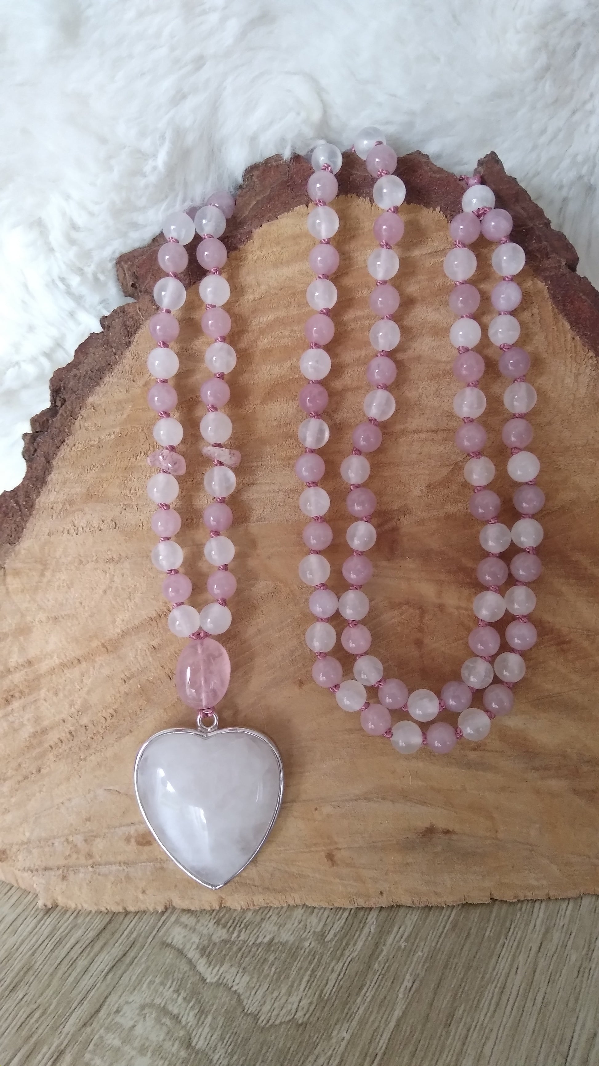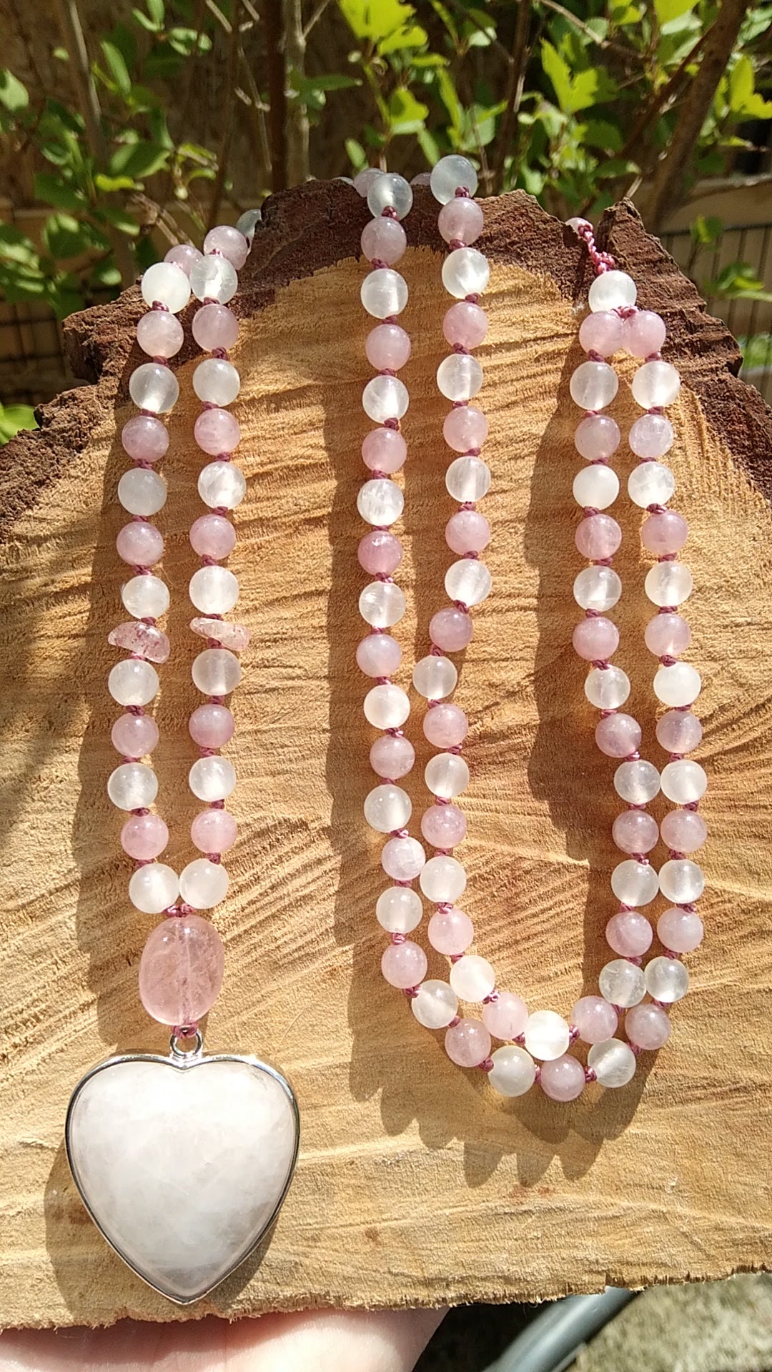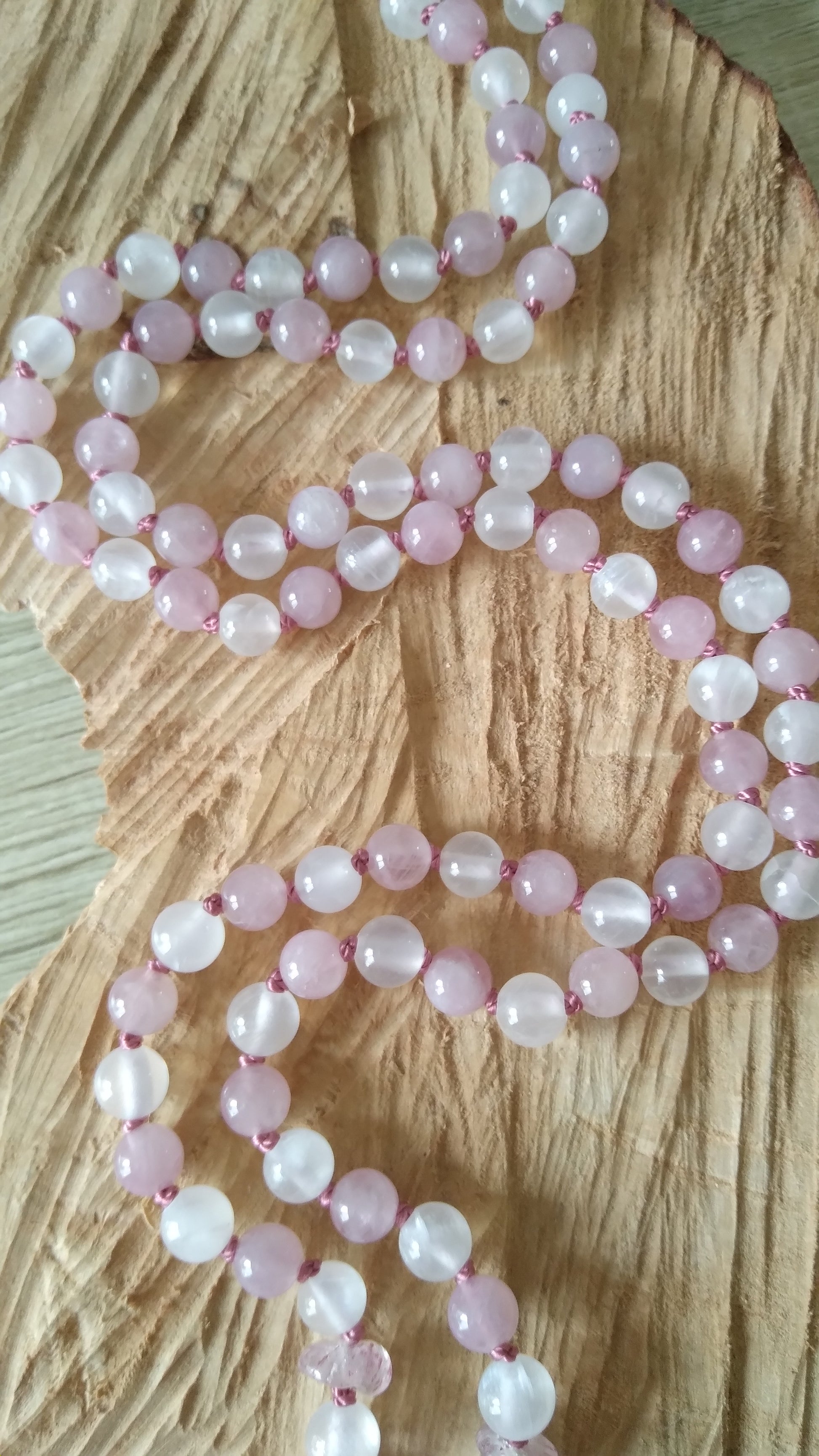 Mala en quartz rose, quartz fraise, morganite et sélénite
