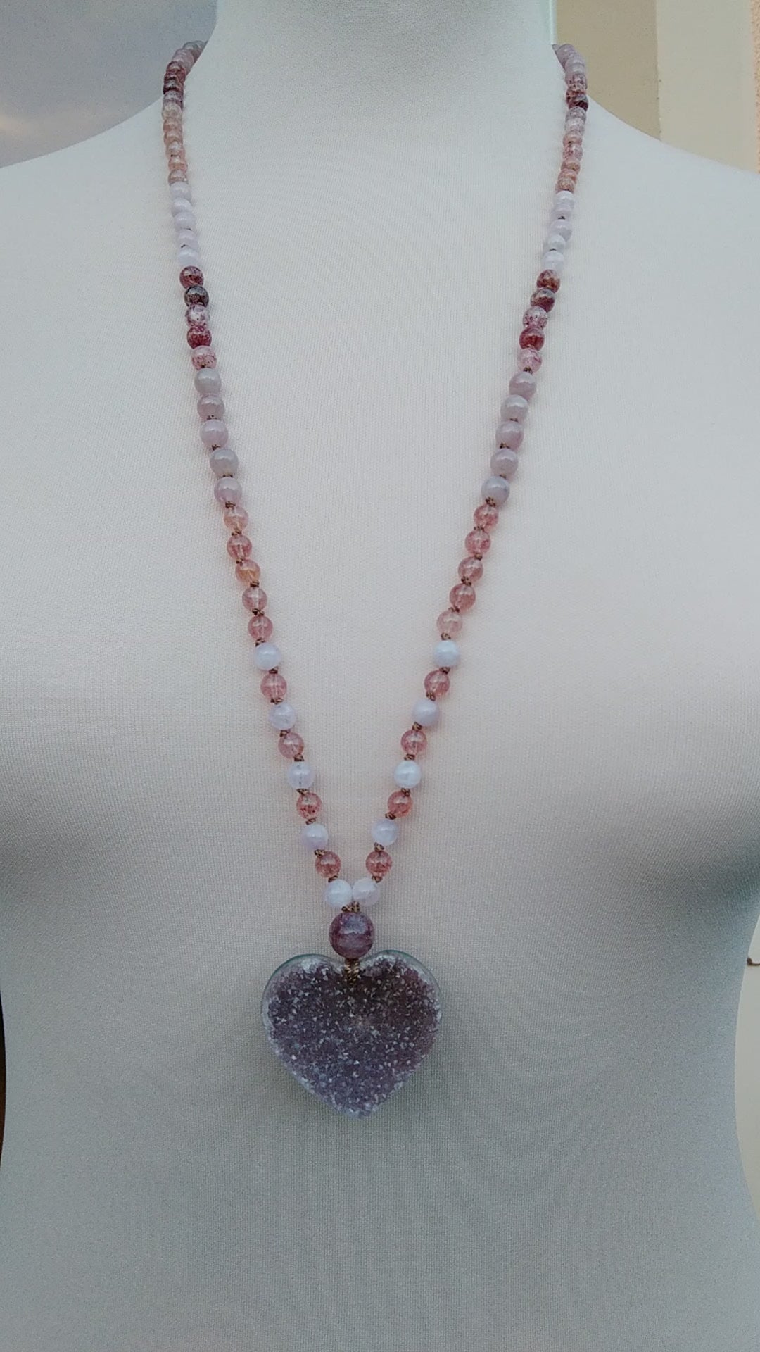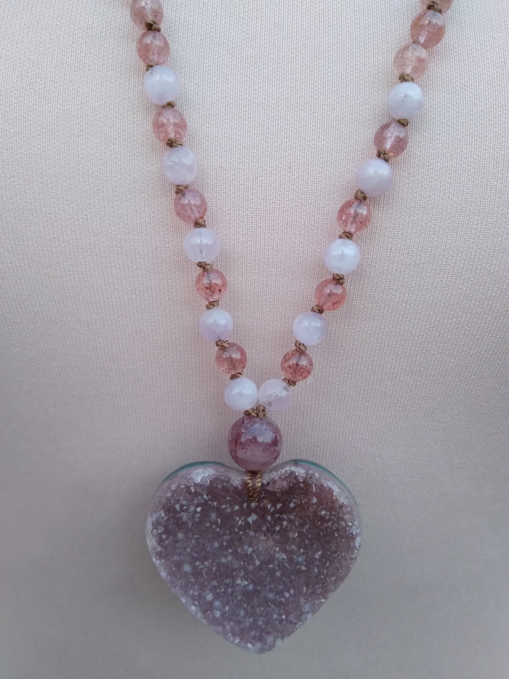 Mala en quartz rose, quartz fraise, kunzite et améthyste brute "Bonheur"