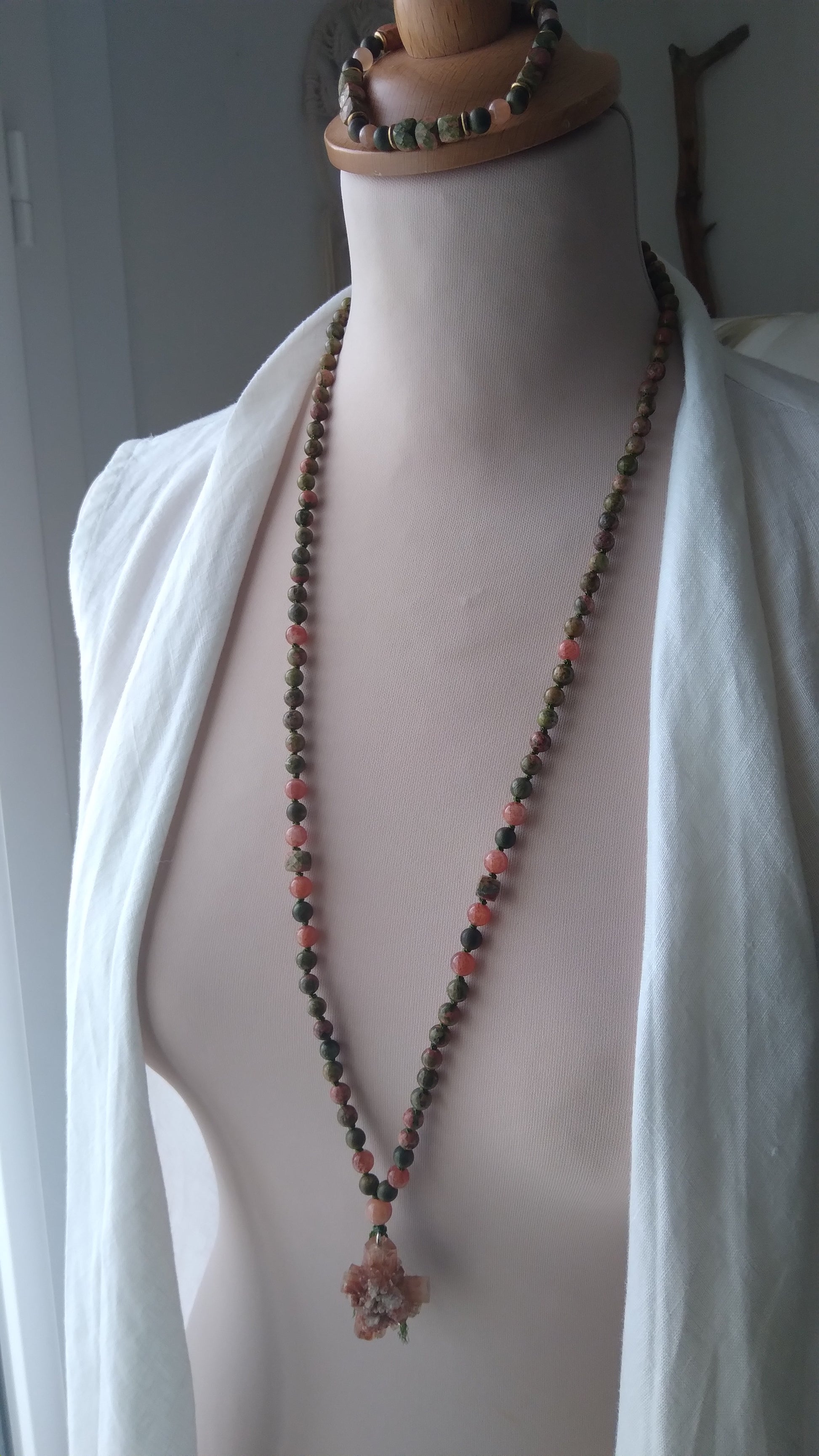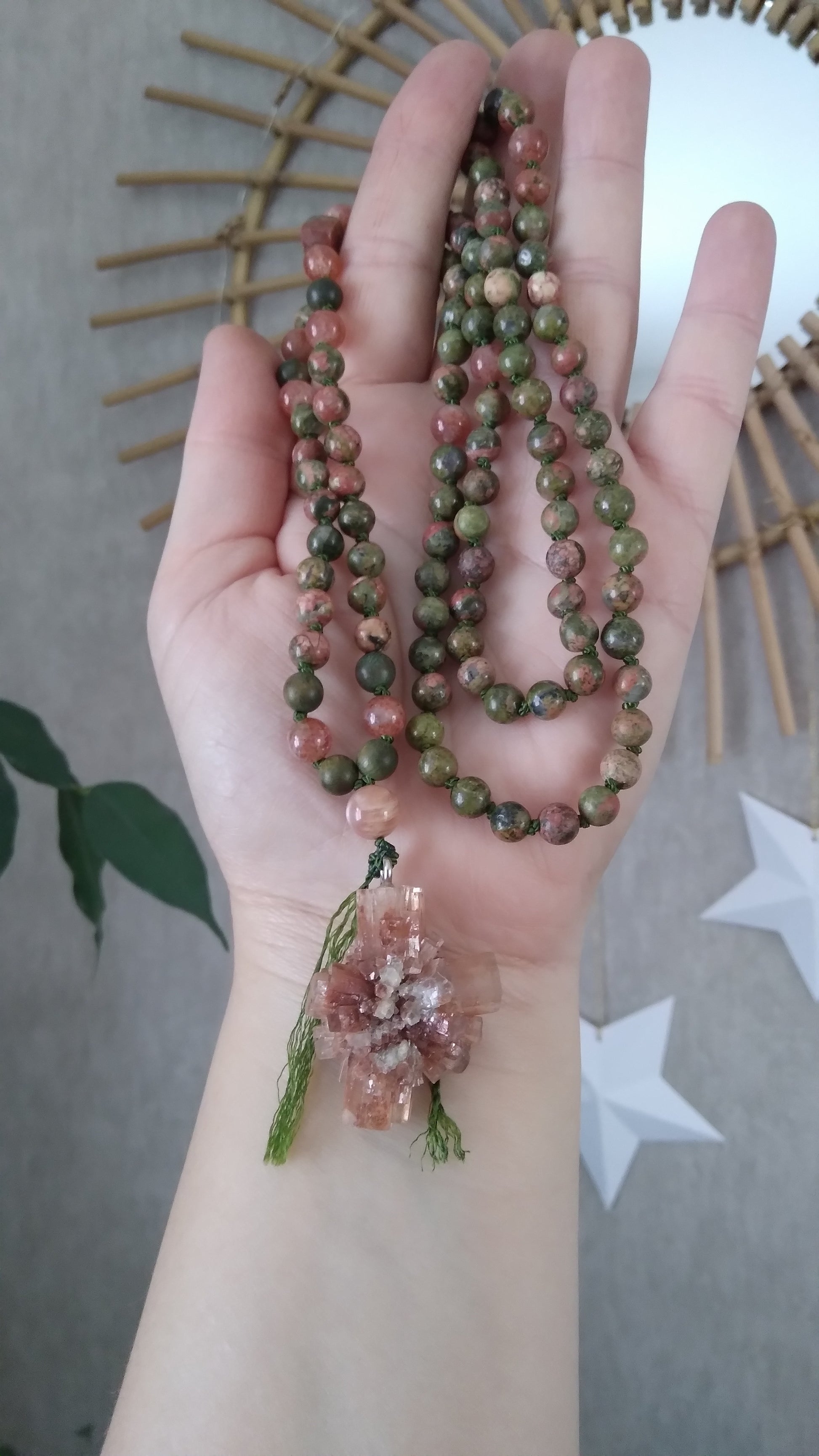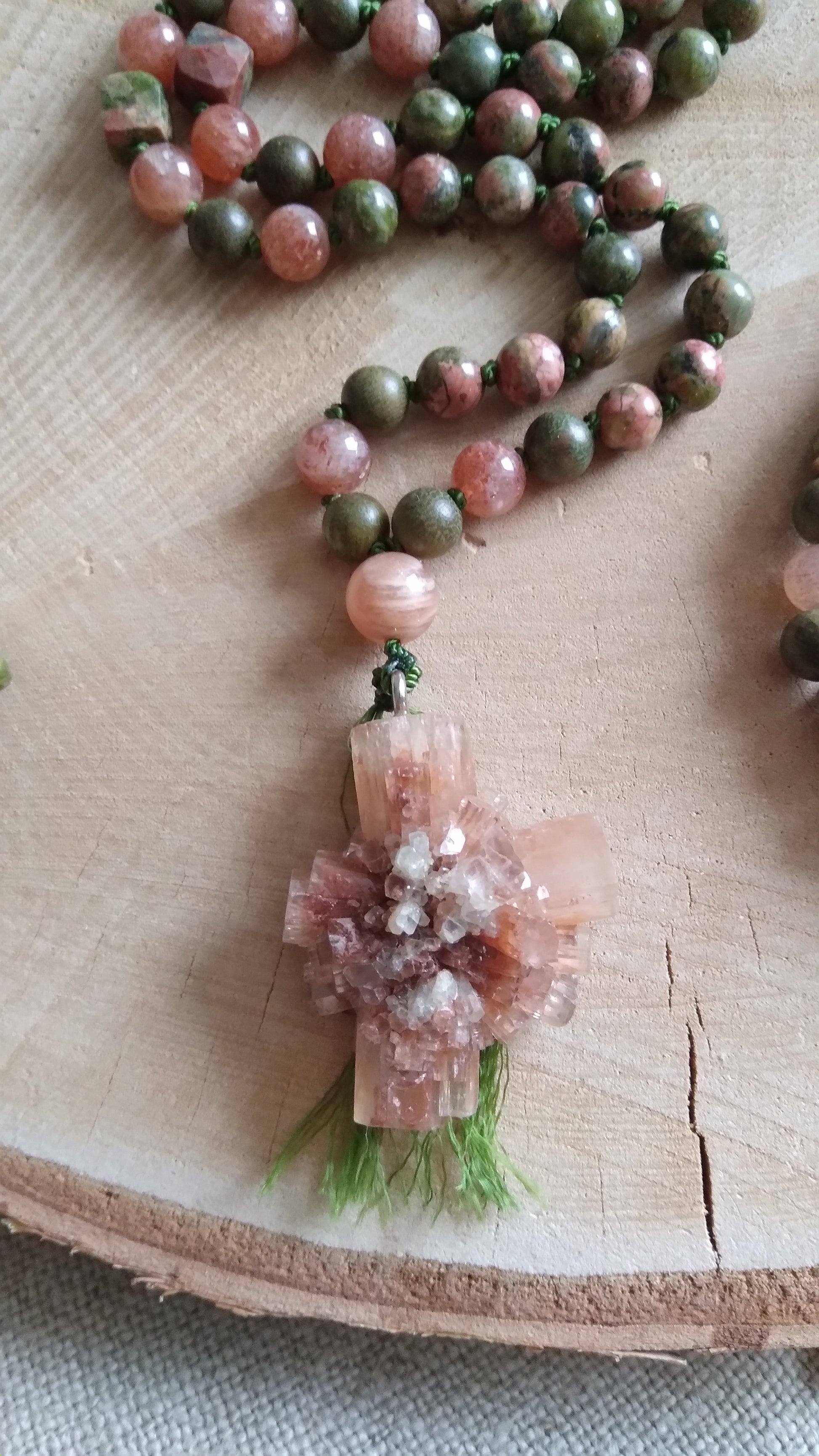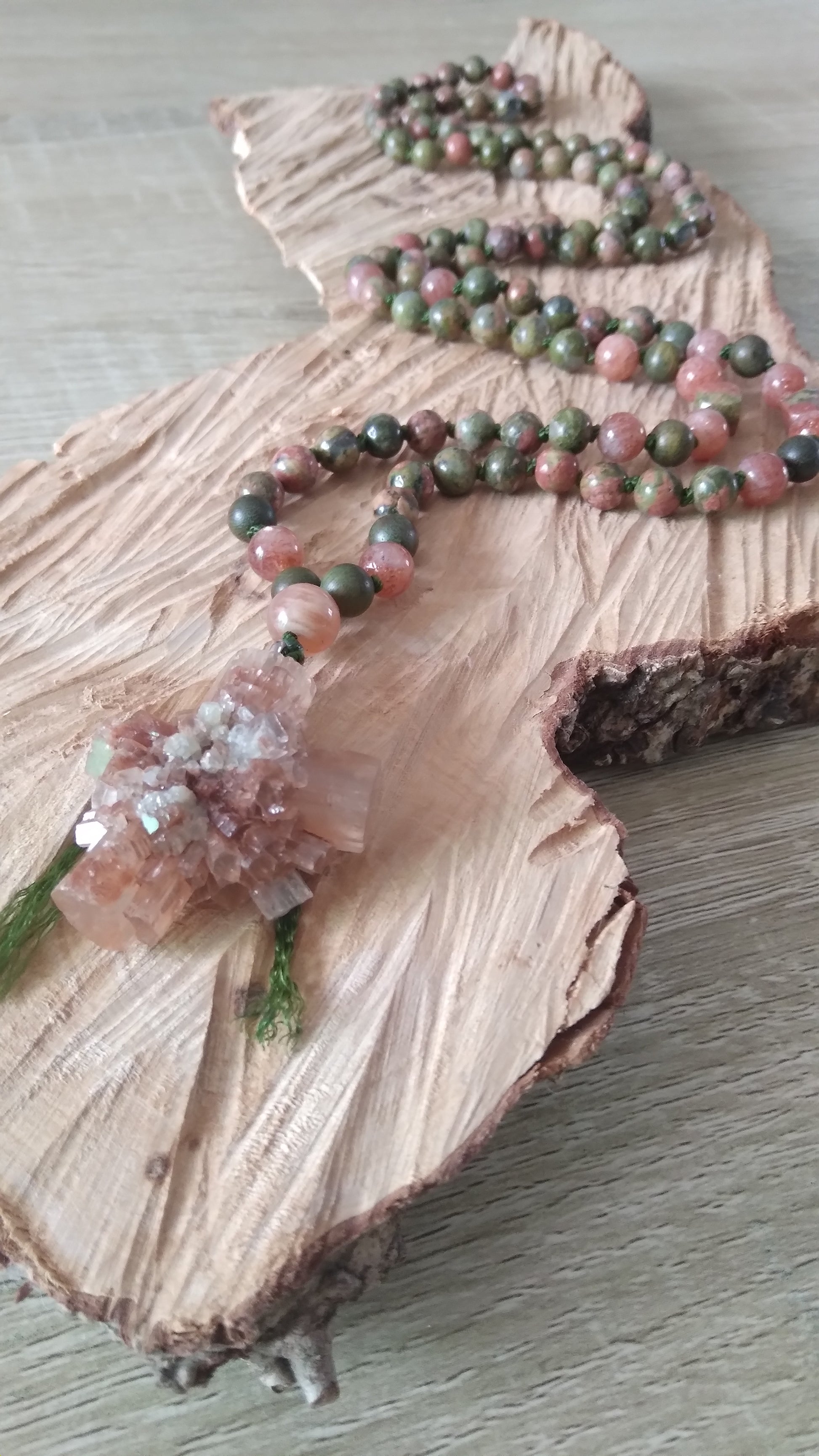 Mala en unakite, pierre de soleil, bois de santal et aragonite