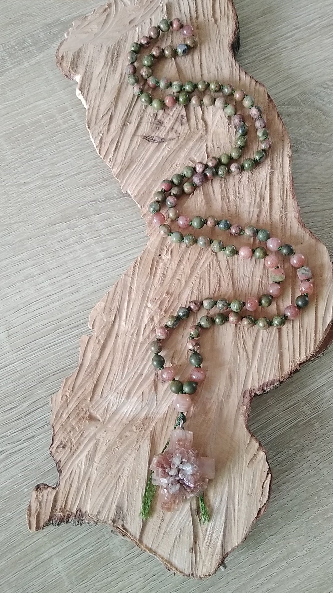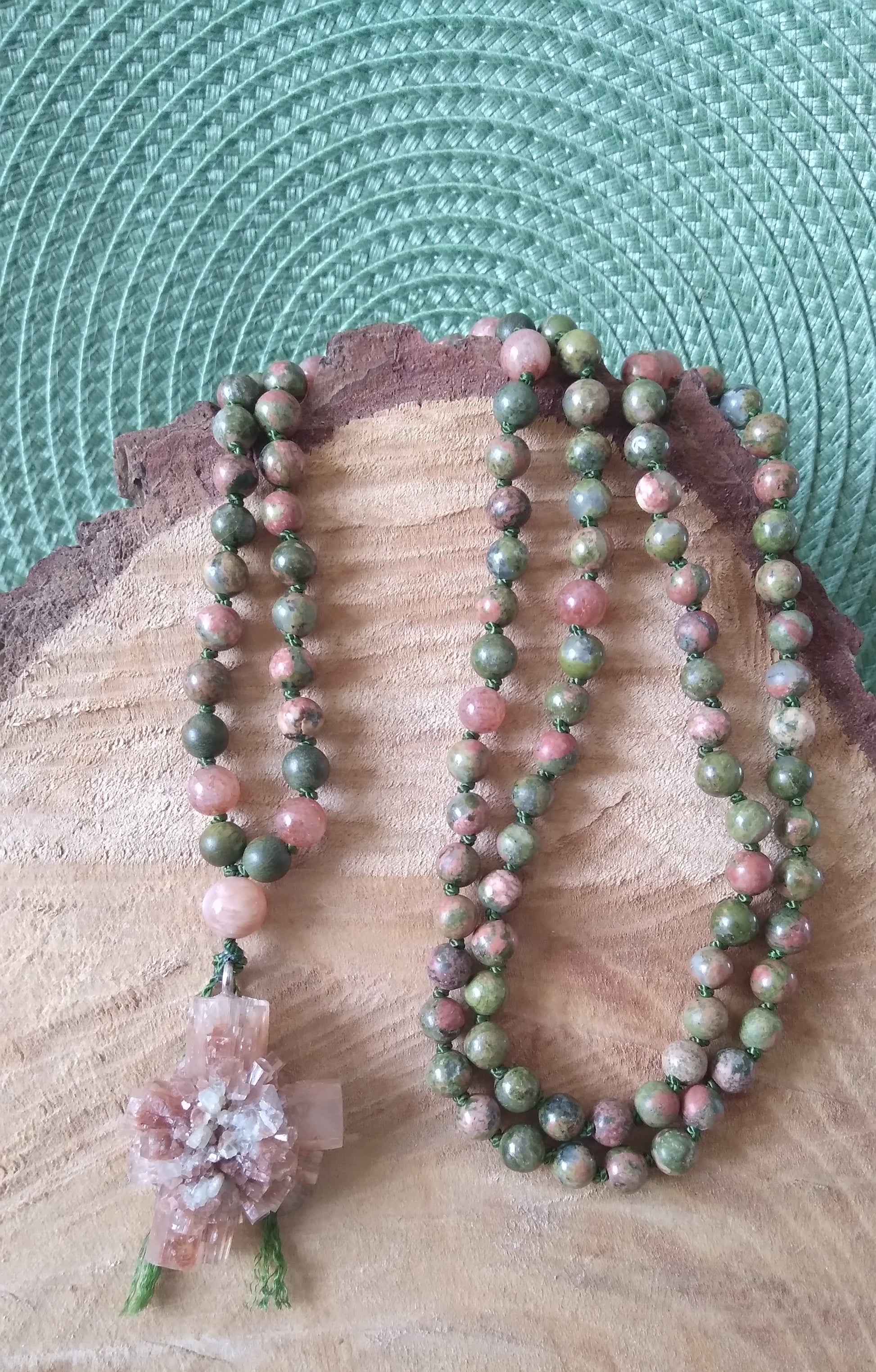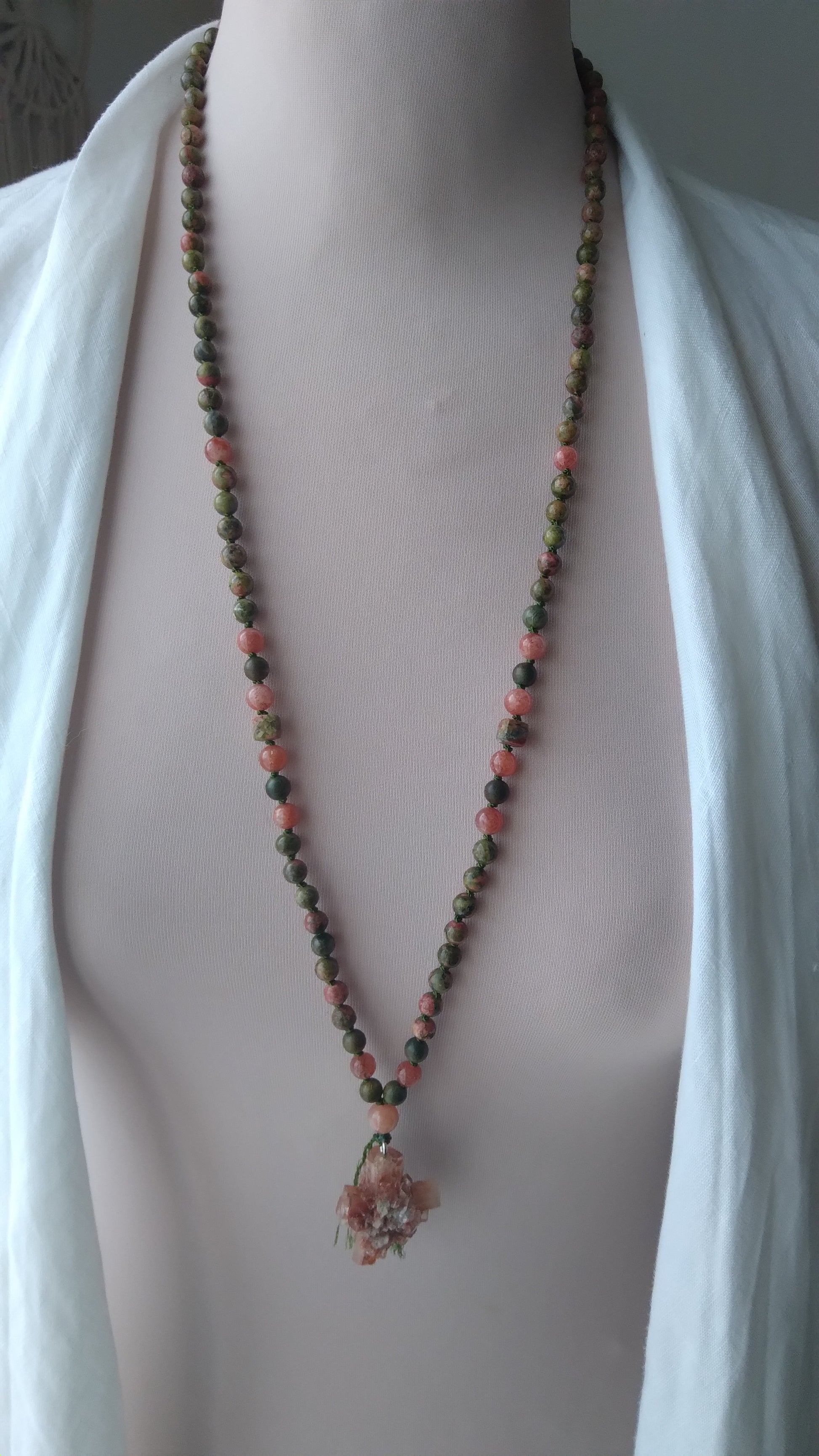 Mala en unakite, pierre de soleil, bois de santal et aragonite