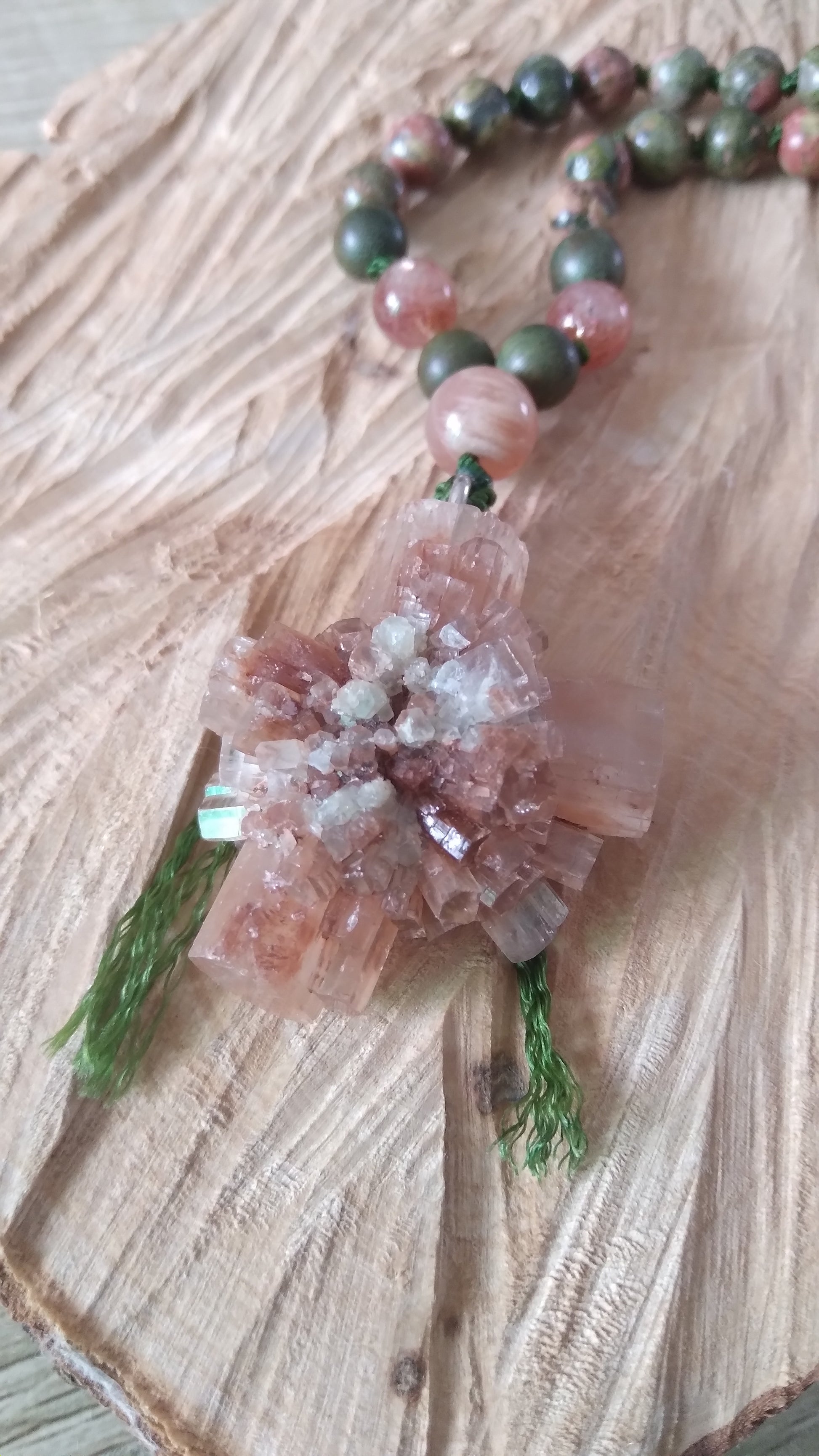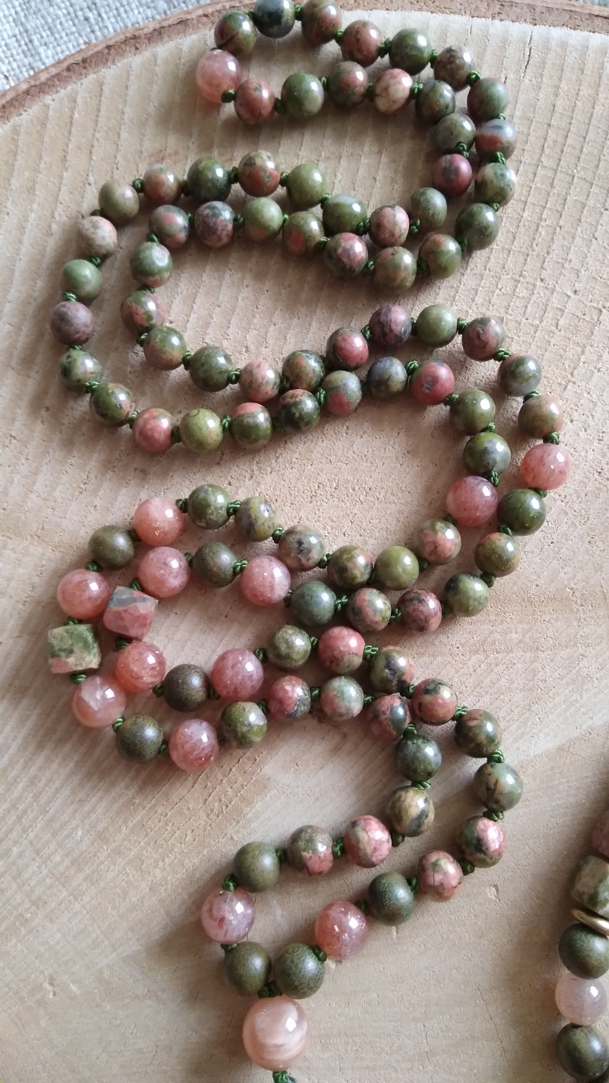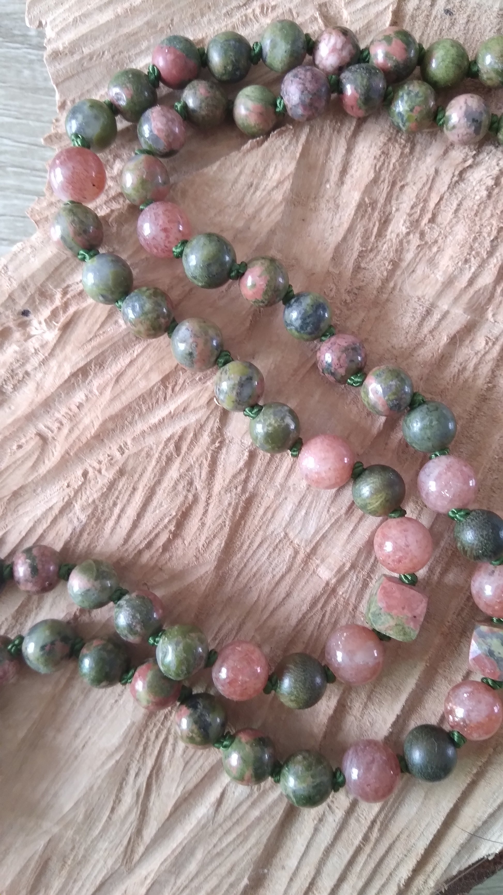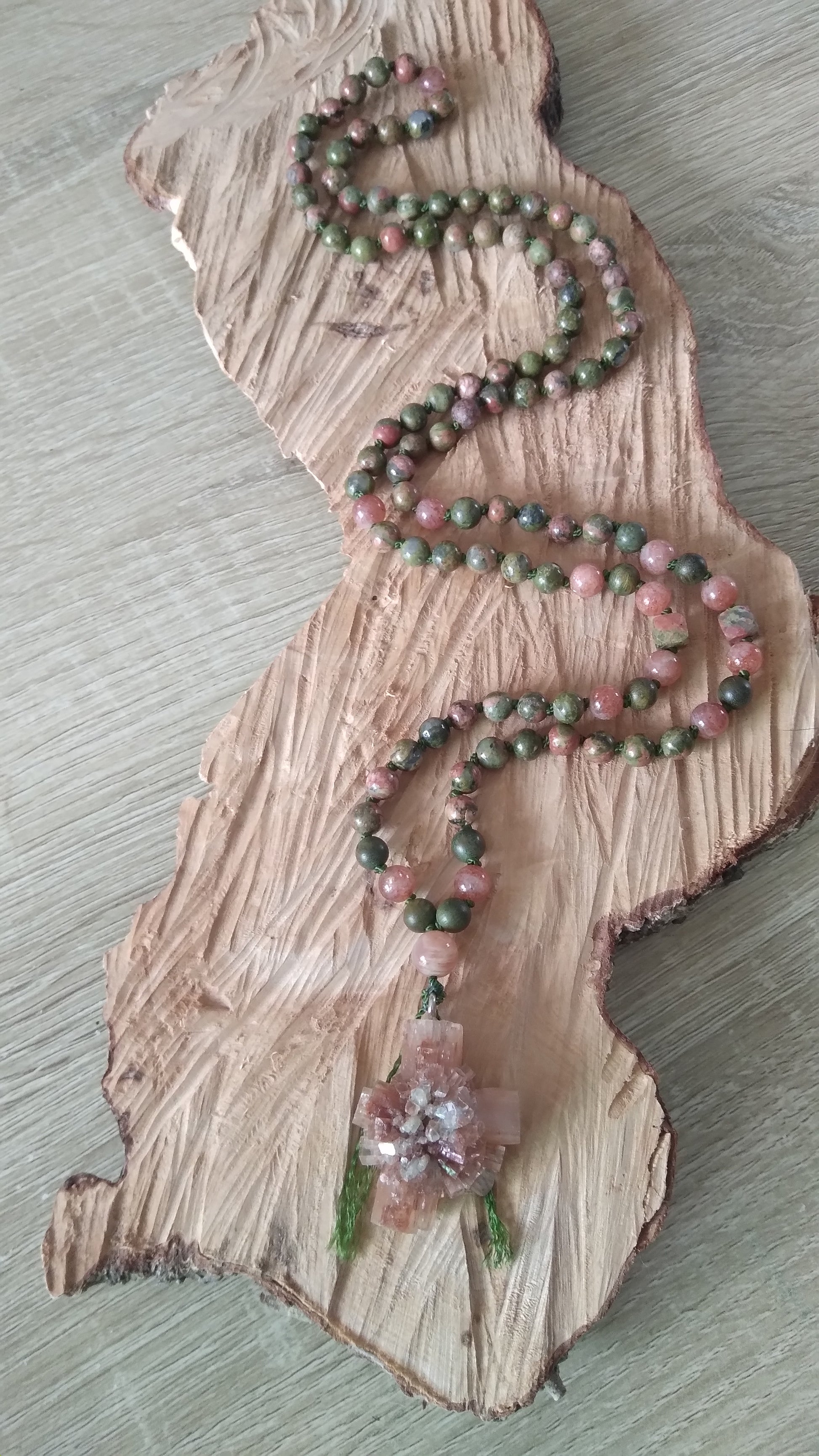 Mala en unakite, pierre de soleil, bois de santal et aragonite