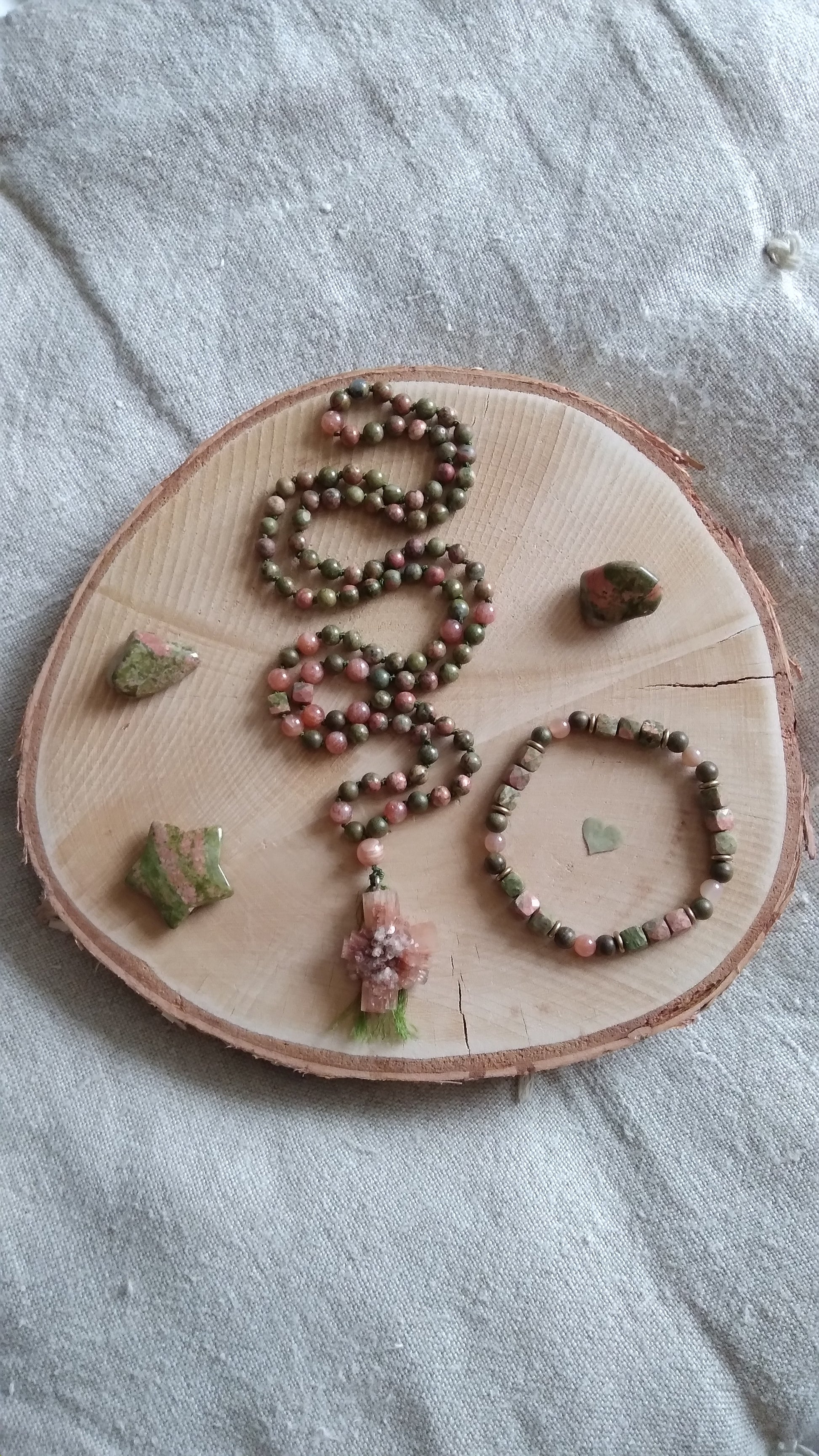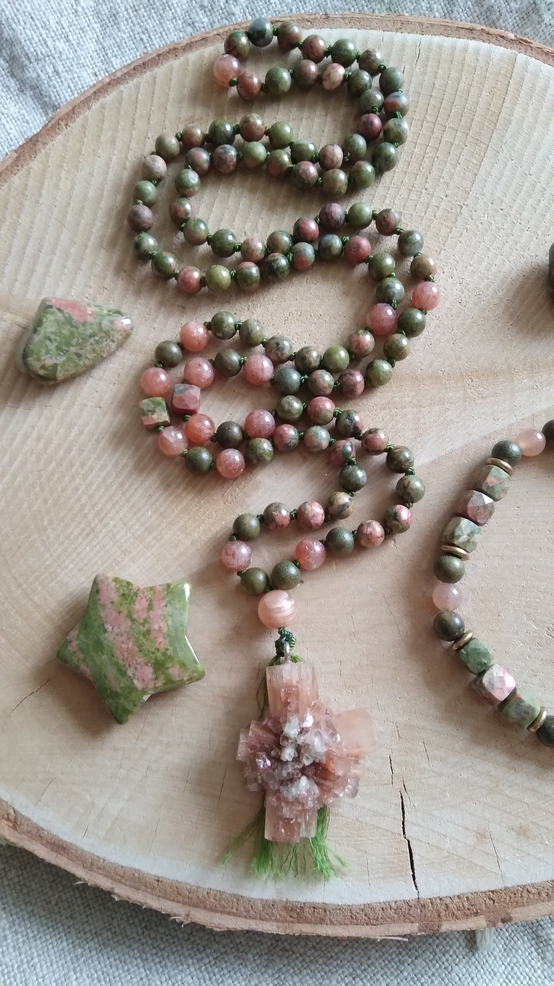 NB : les pierres roulées, l'étoile et le bracelet ne sont pas vendus avec le mala. Si tu souhaites t'offrir le bracelet, rendez-vous par ici : Bracelet en unakite, pierre de soleil et bois de santal "Empuissanceme – Les pierres d'Héloïse (mala-personnalise.com)