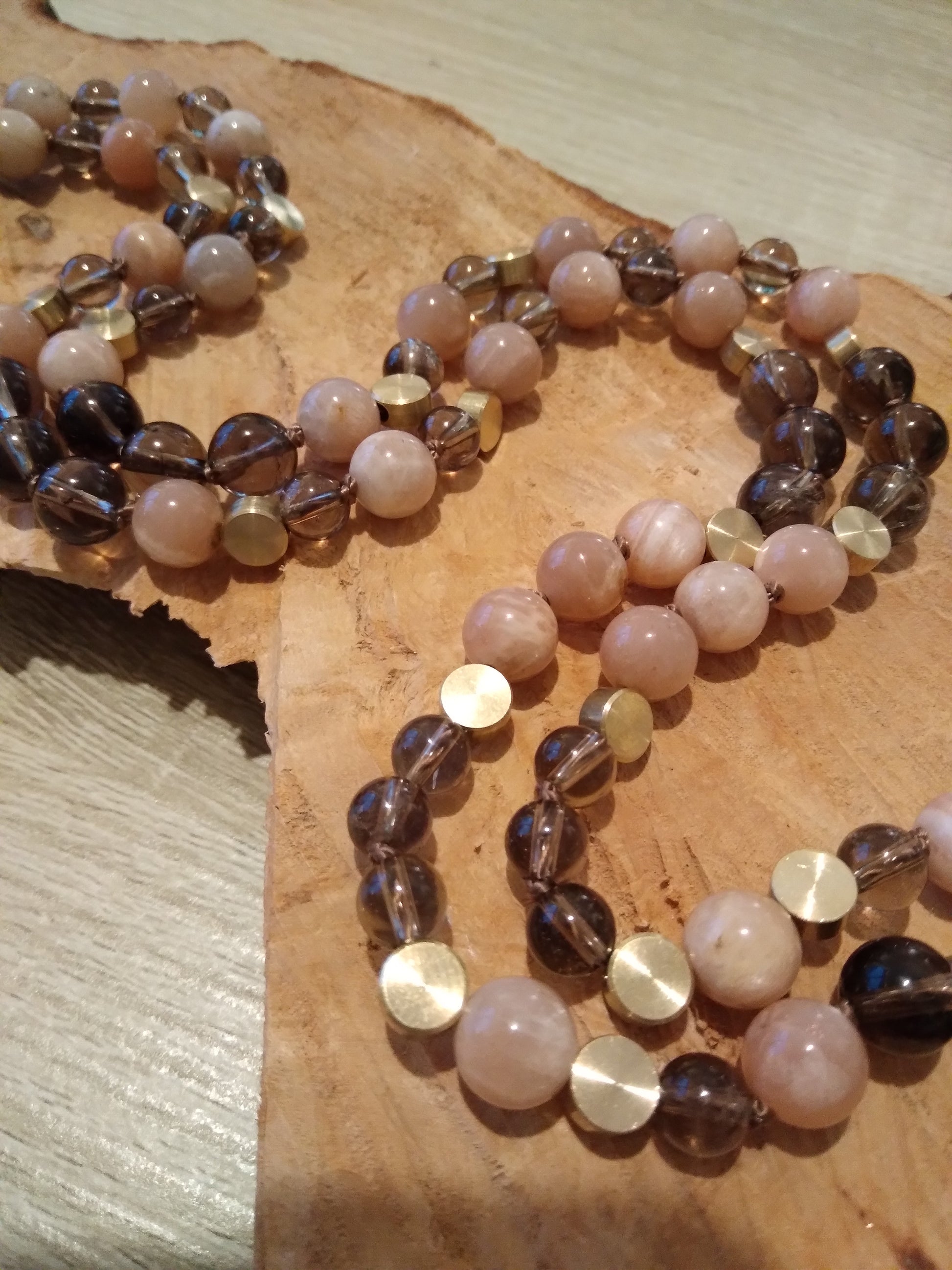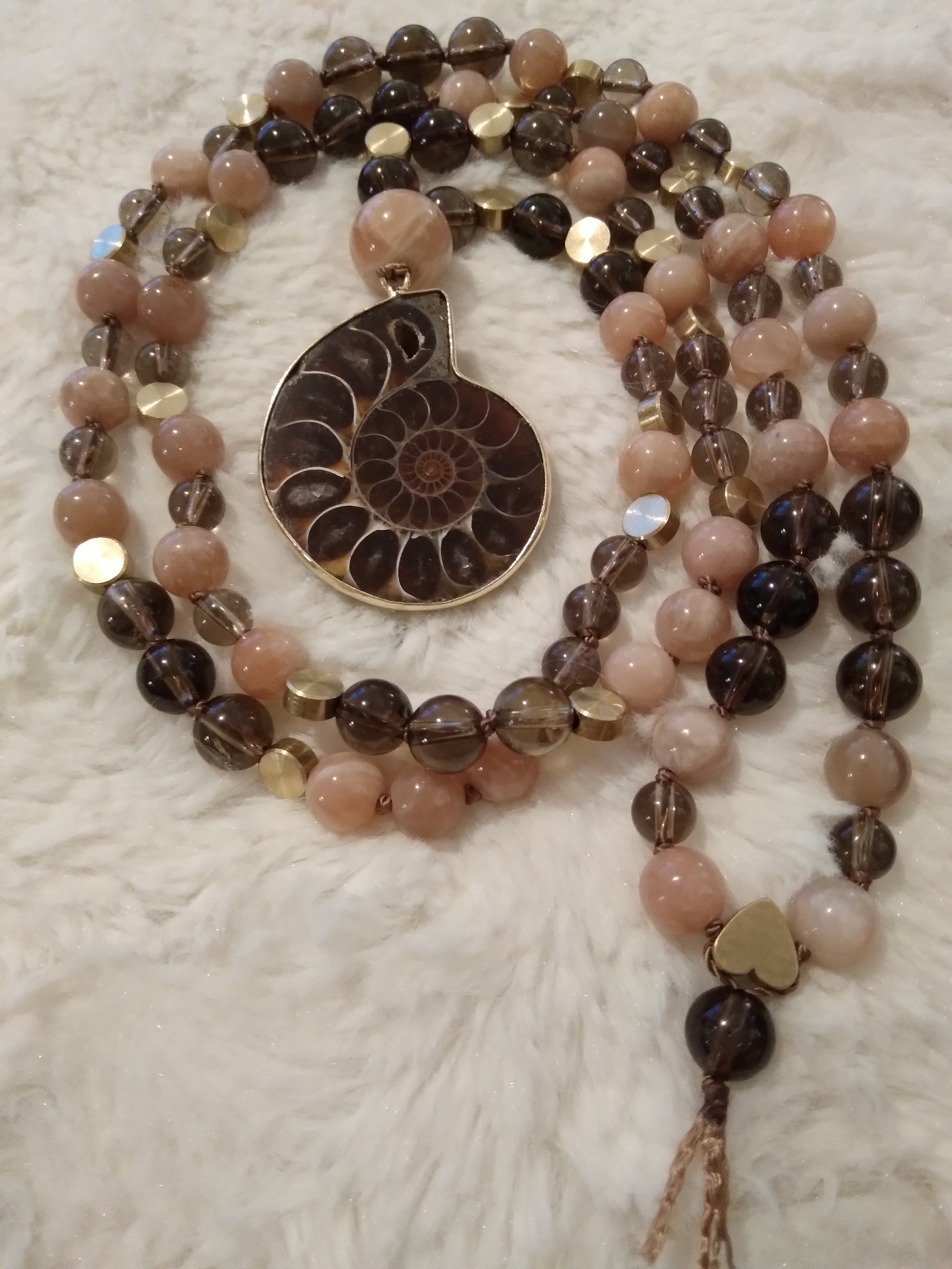 Mala en pierre de lune, quartz fumé et ammonite