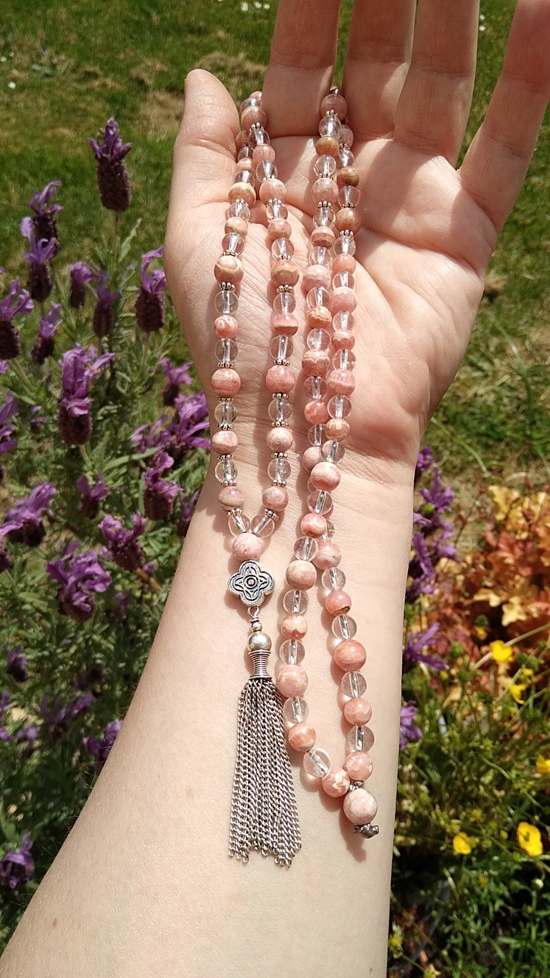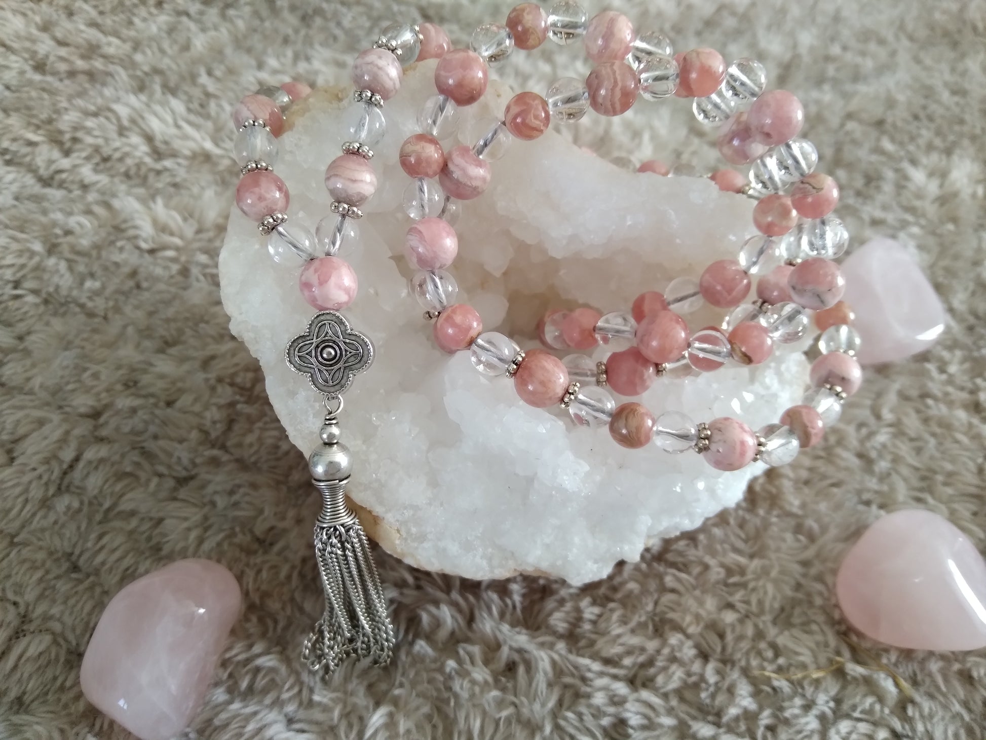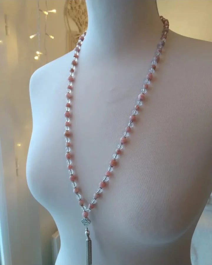 Mala en rhodochrosite et cristal de roche "Expérimente l'amour"