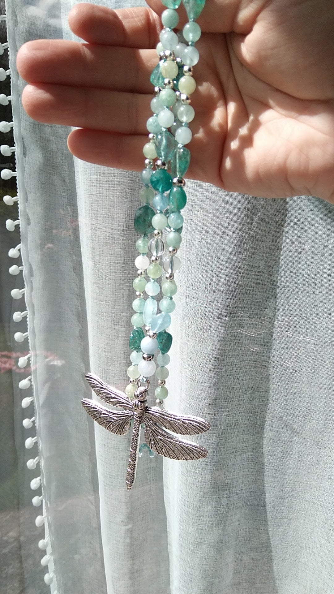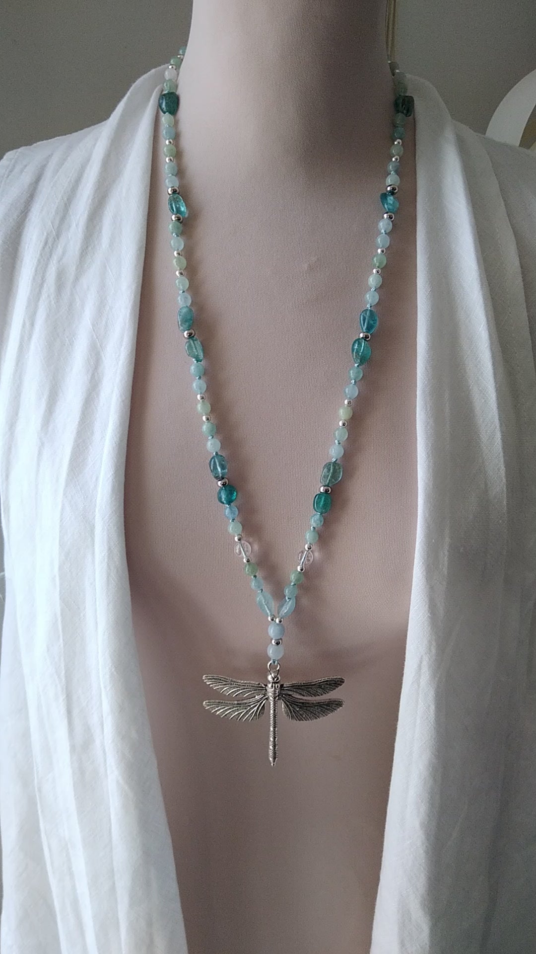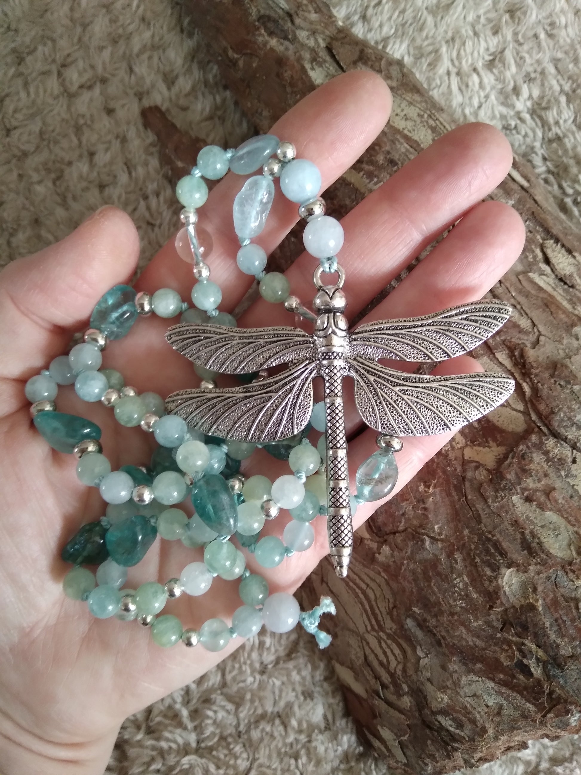 Mala en aigue-marine, apatite bleue et cristal de roche "Fluidance"