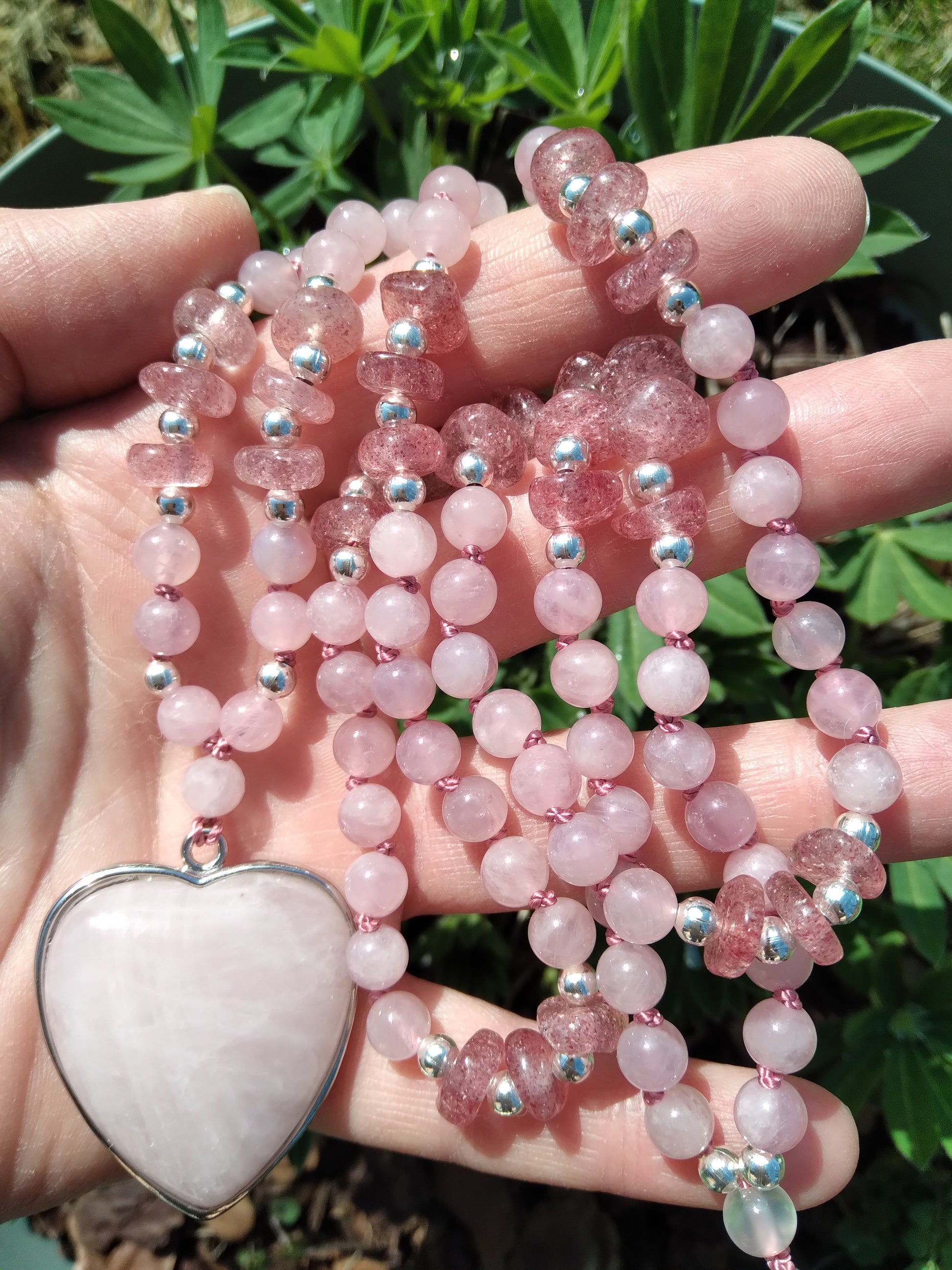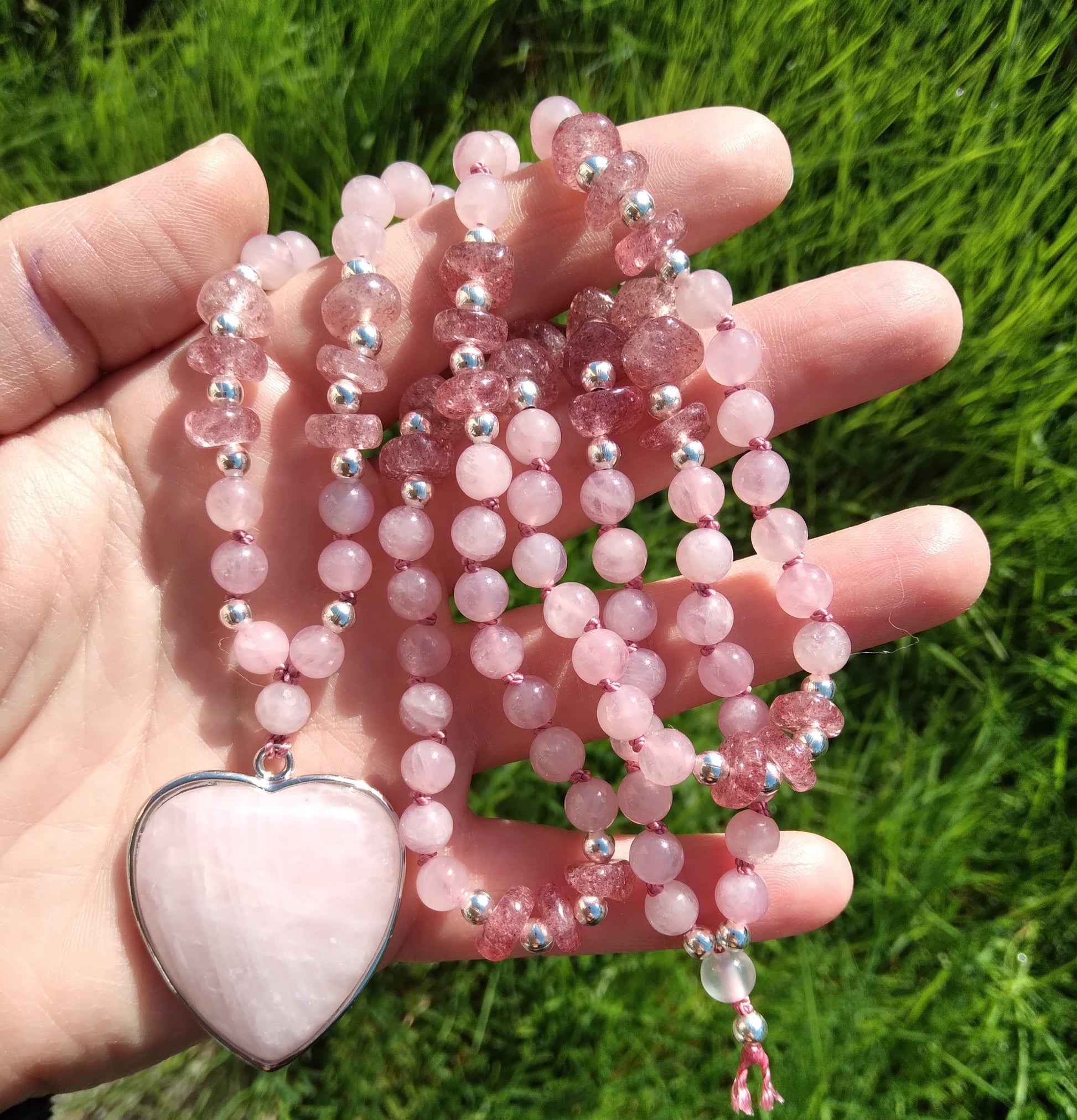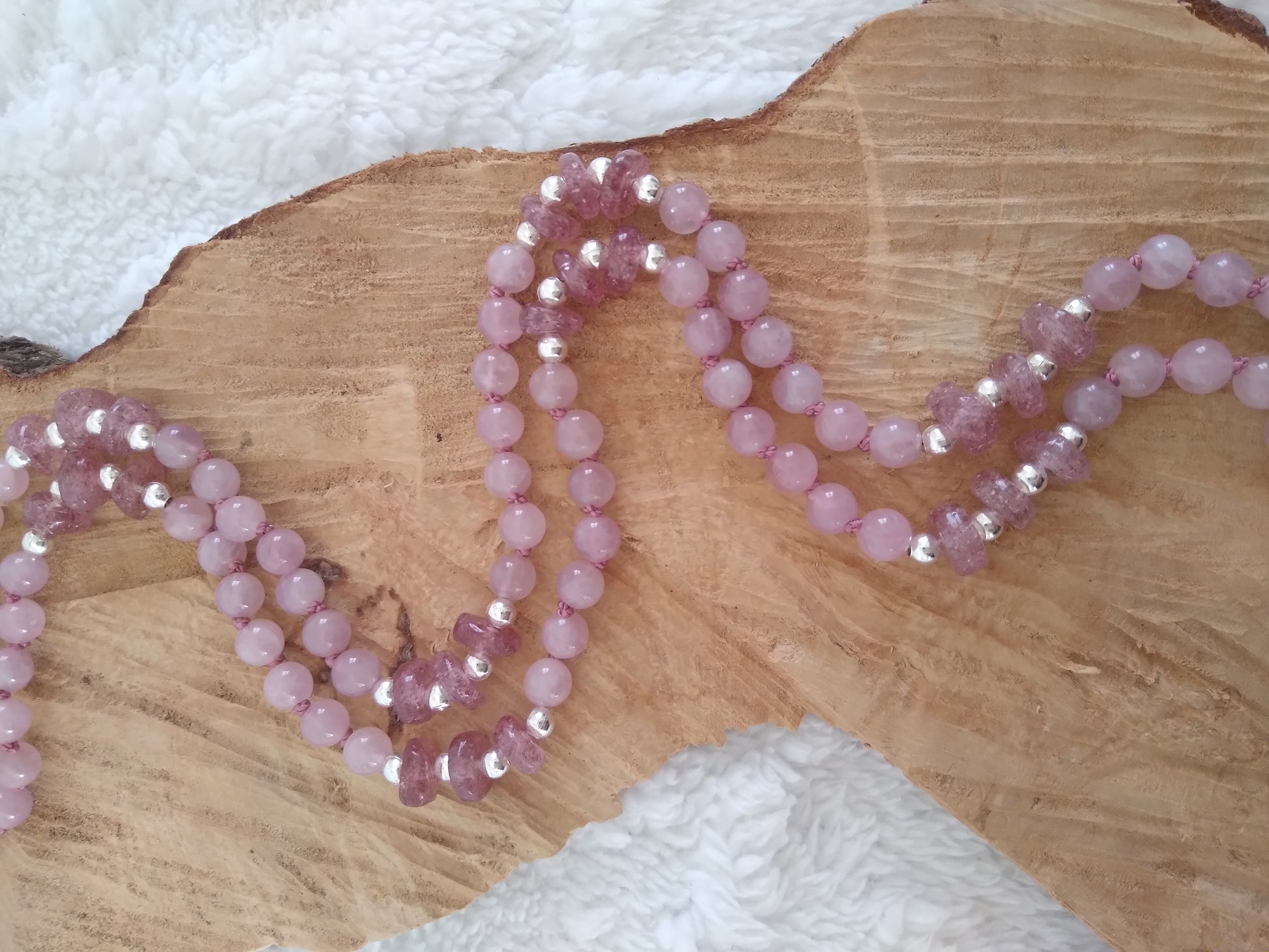 Mala en quartz rose et quartz fraise "Je me chéris"