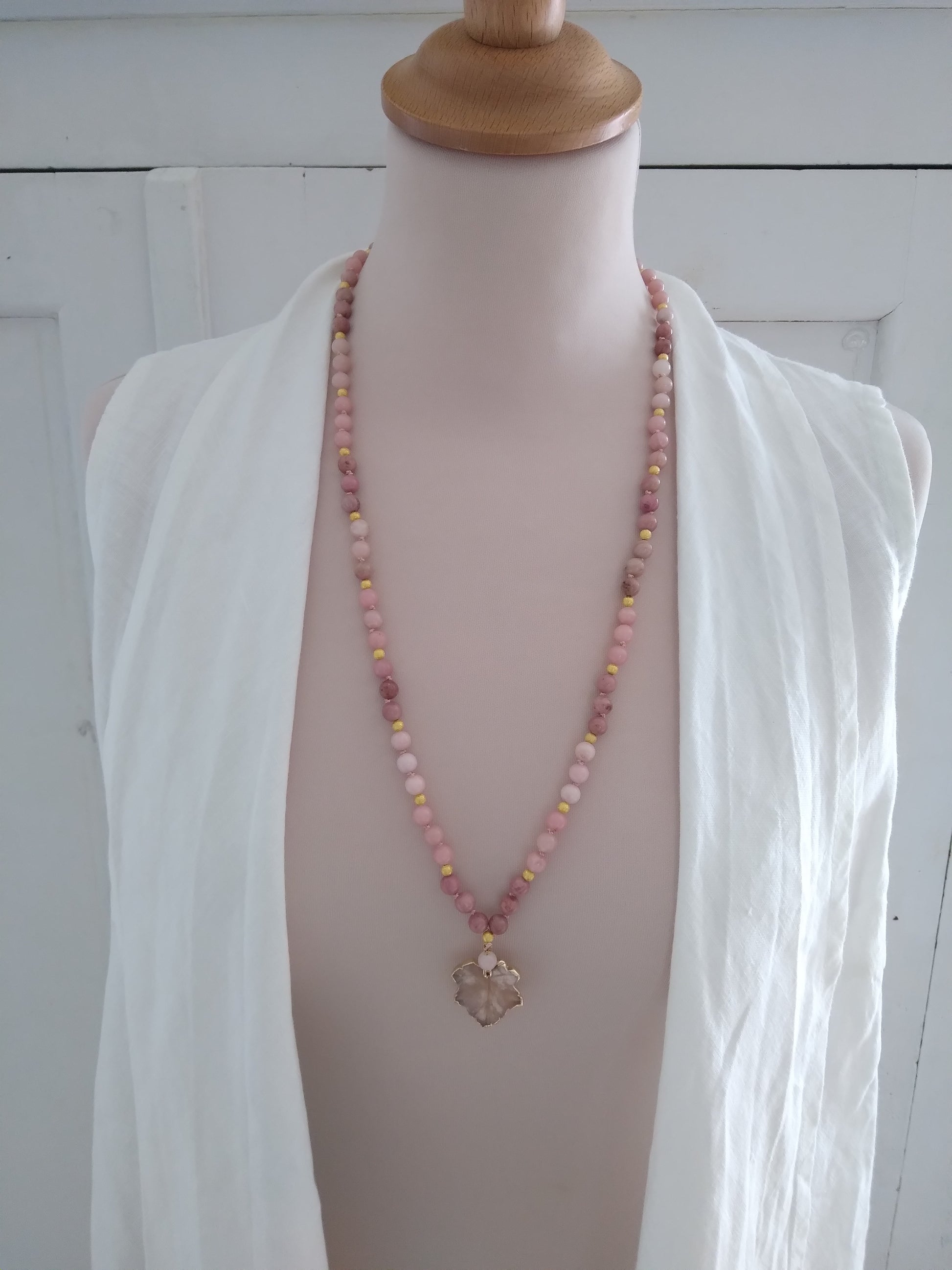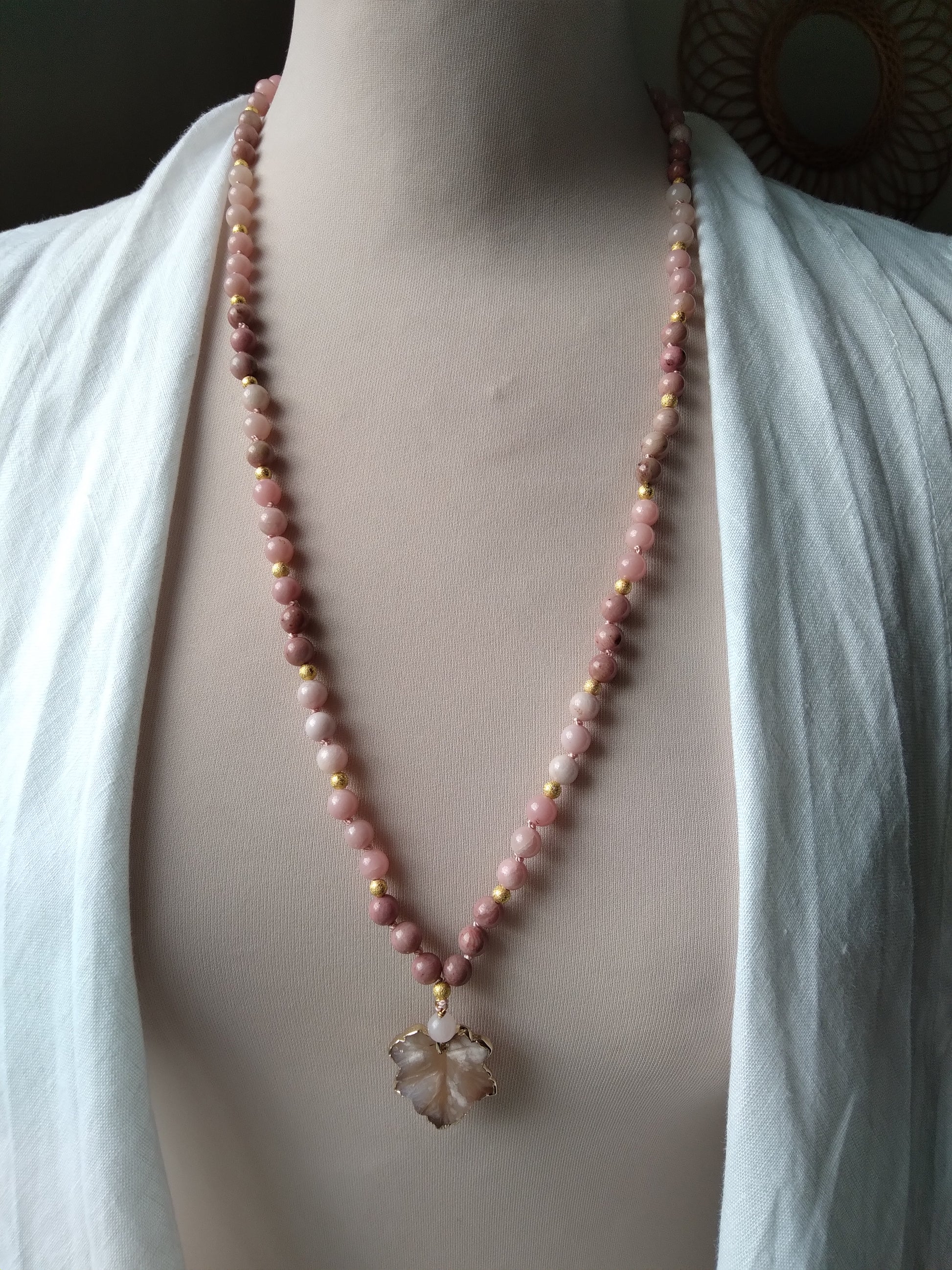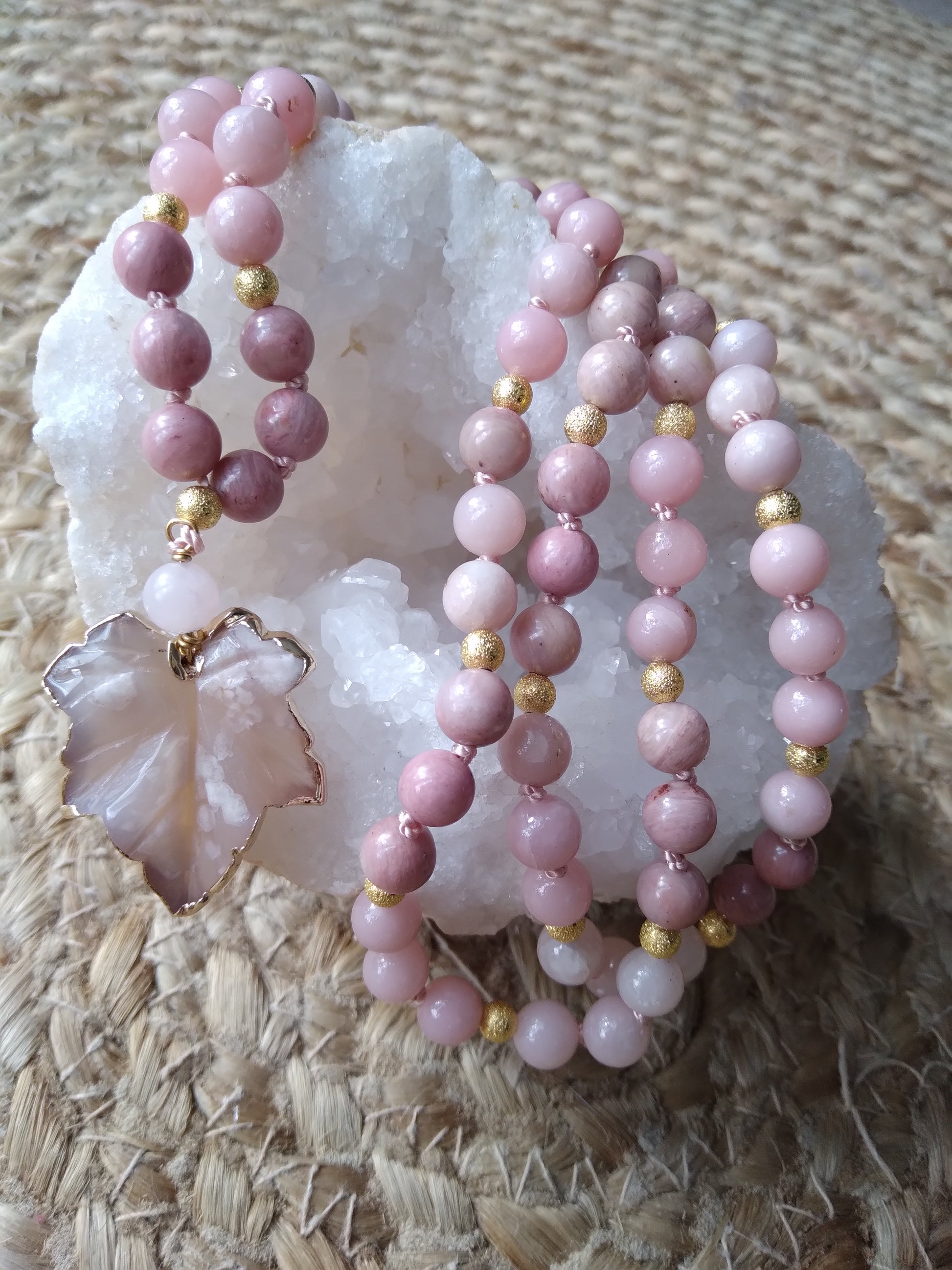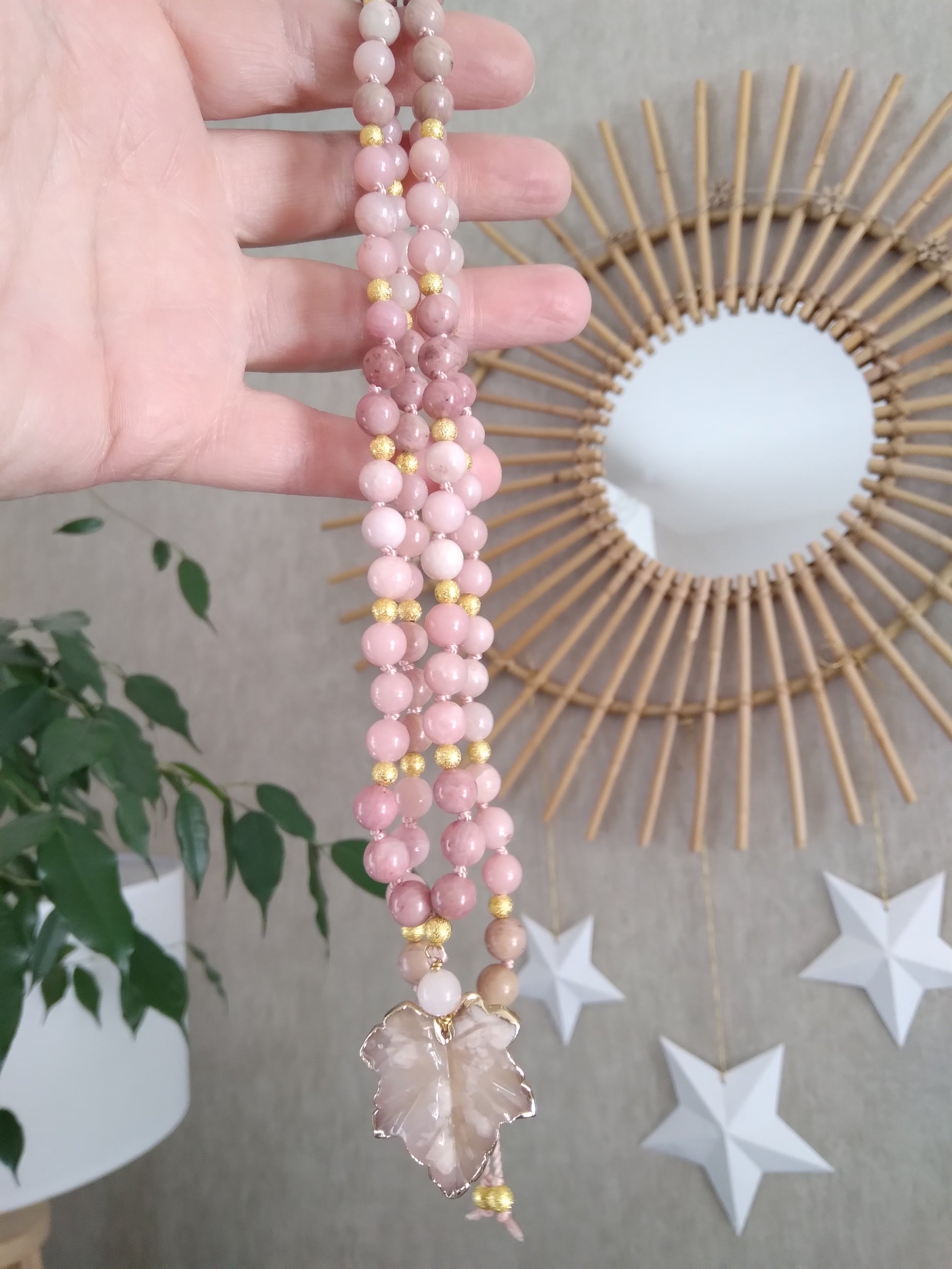 Mala "Je me choisis" en opale rose, rhodonite et fleur de cerisier