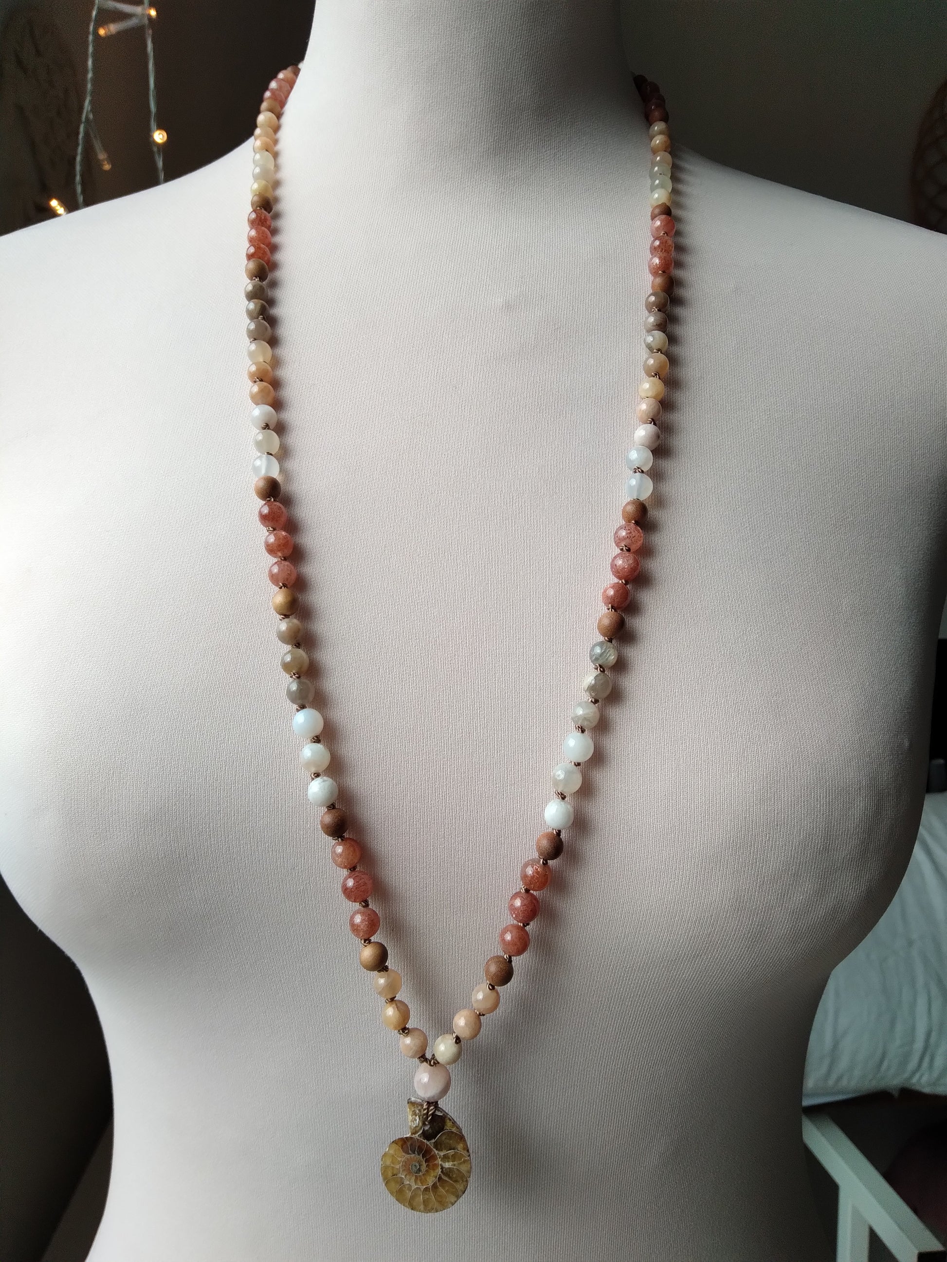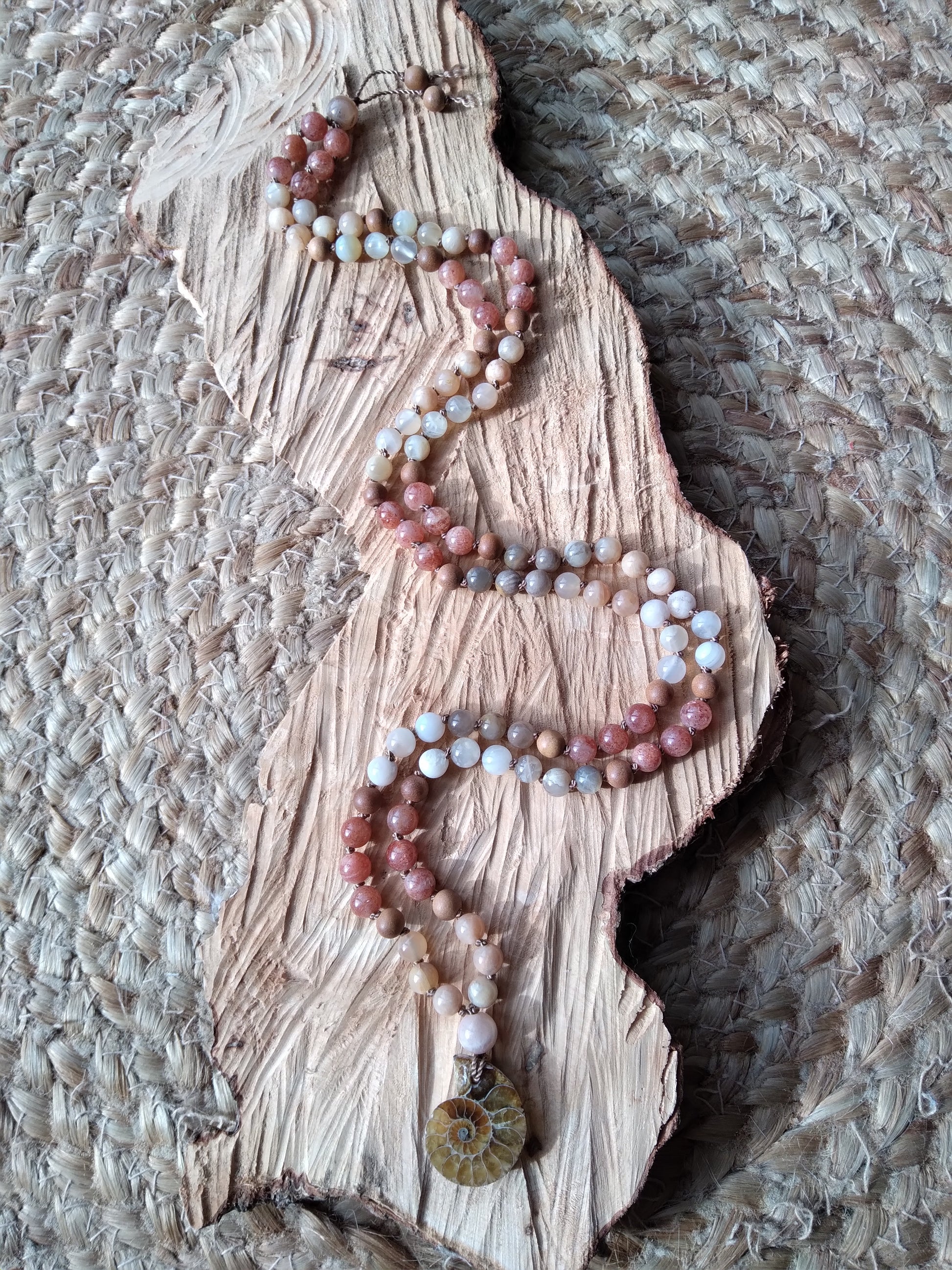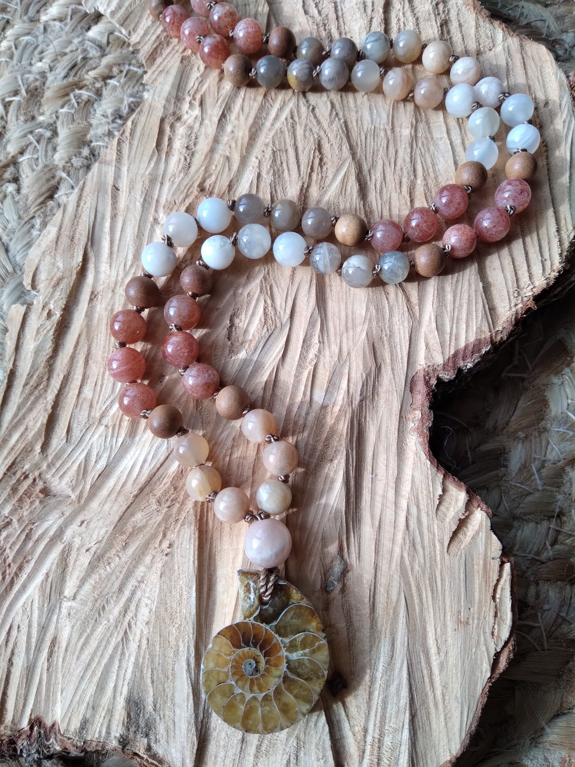 Mala personnalisé "Féminité" en pierre de lune, pierre de soleil et ammonite