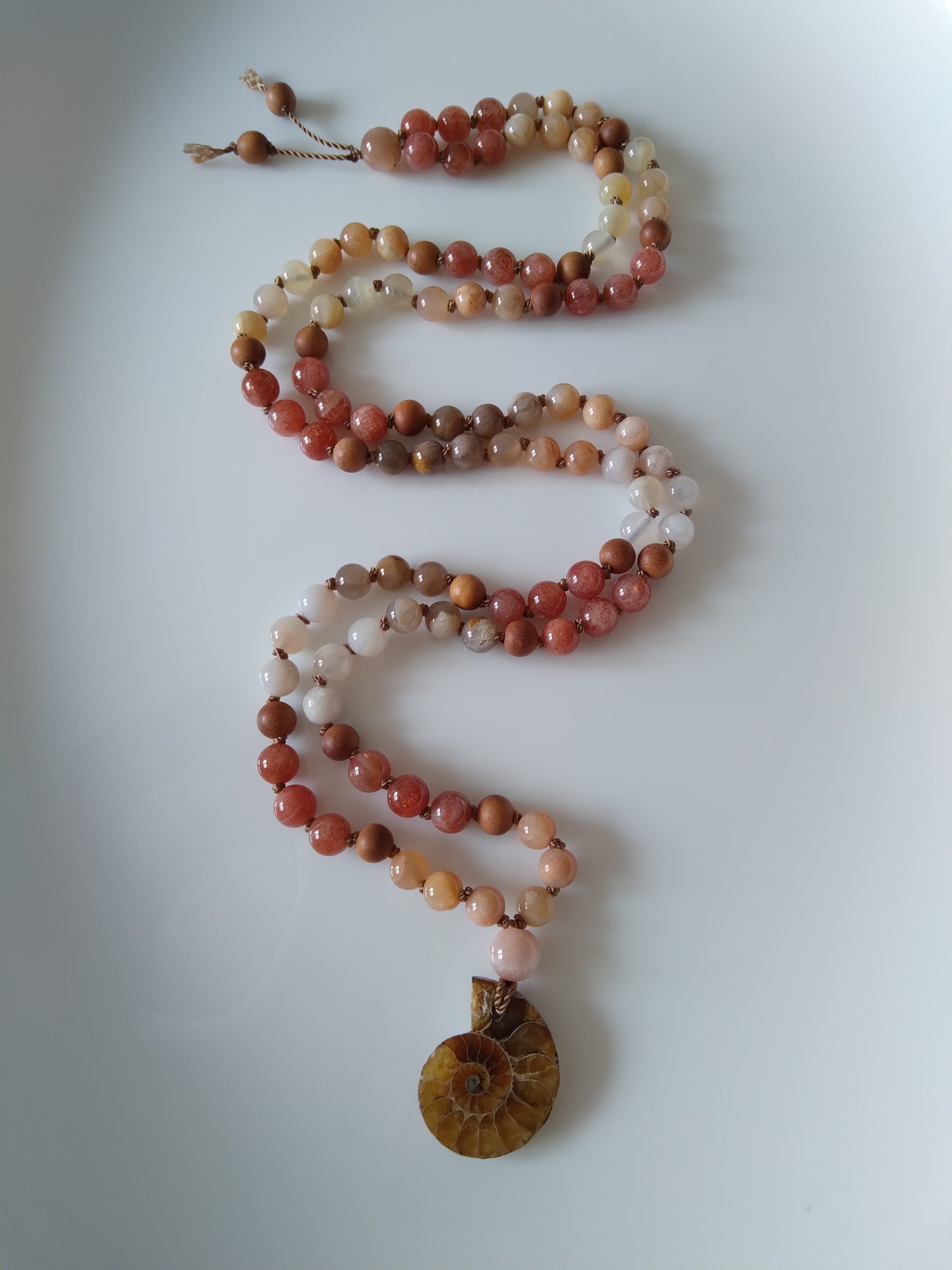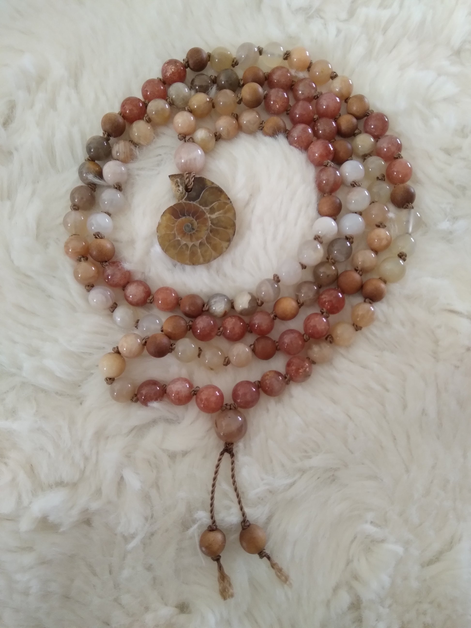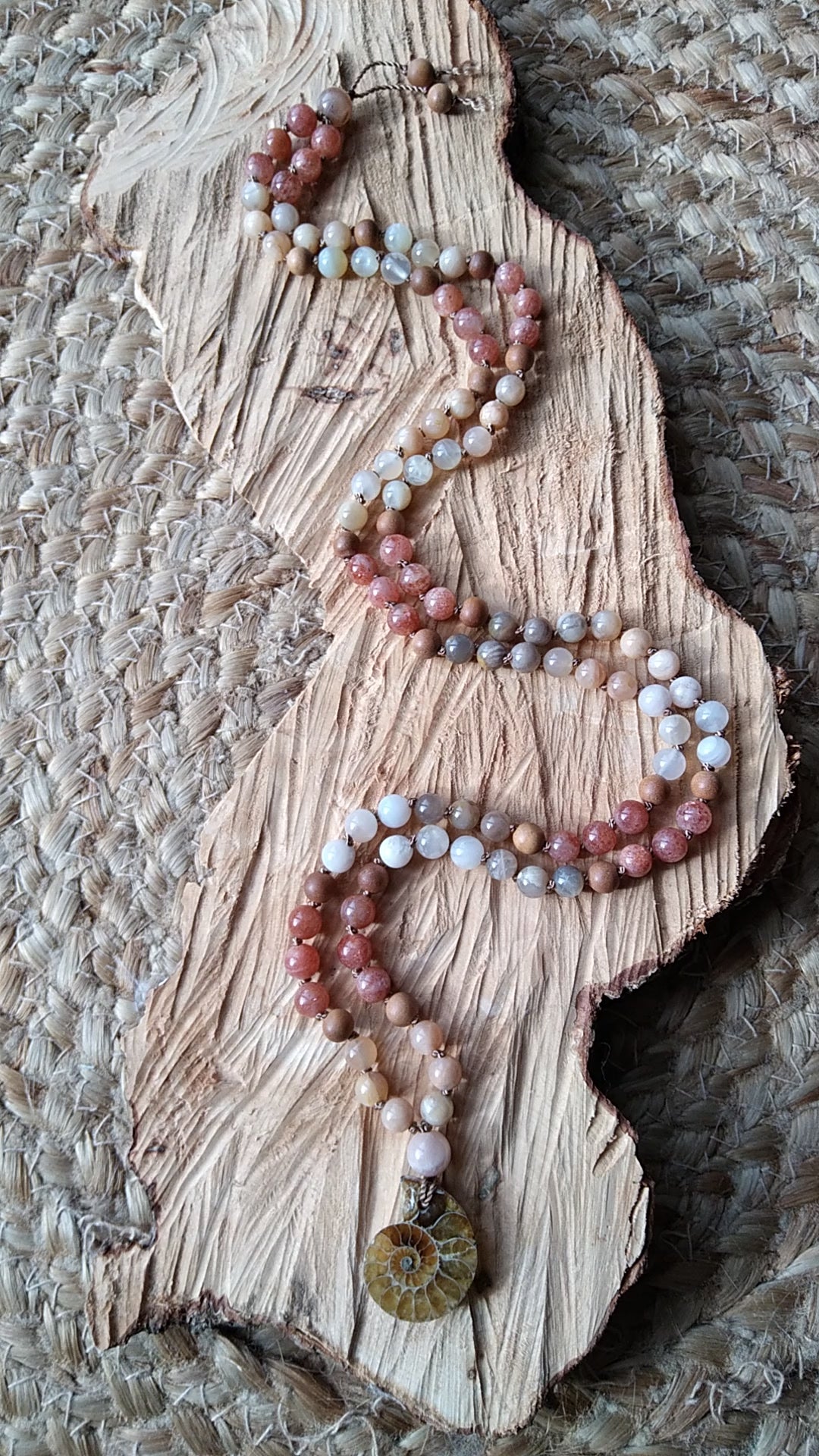 Mala personnalisé "Féminité" en pierre de lune, pierre de soleil et ammonite