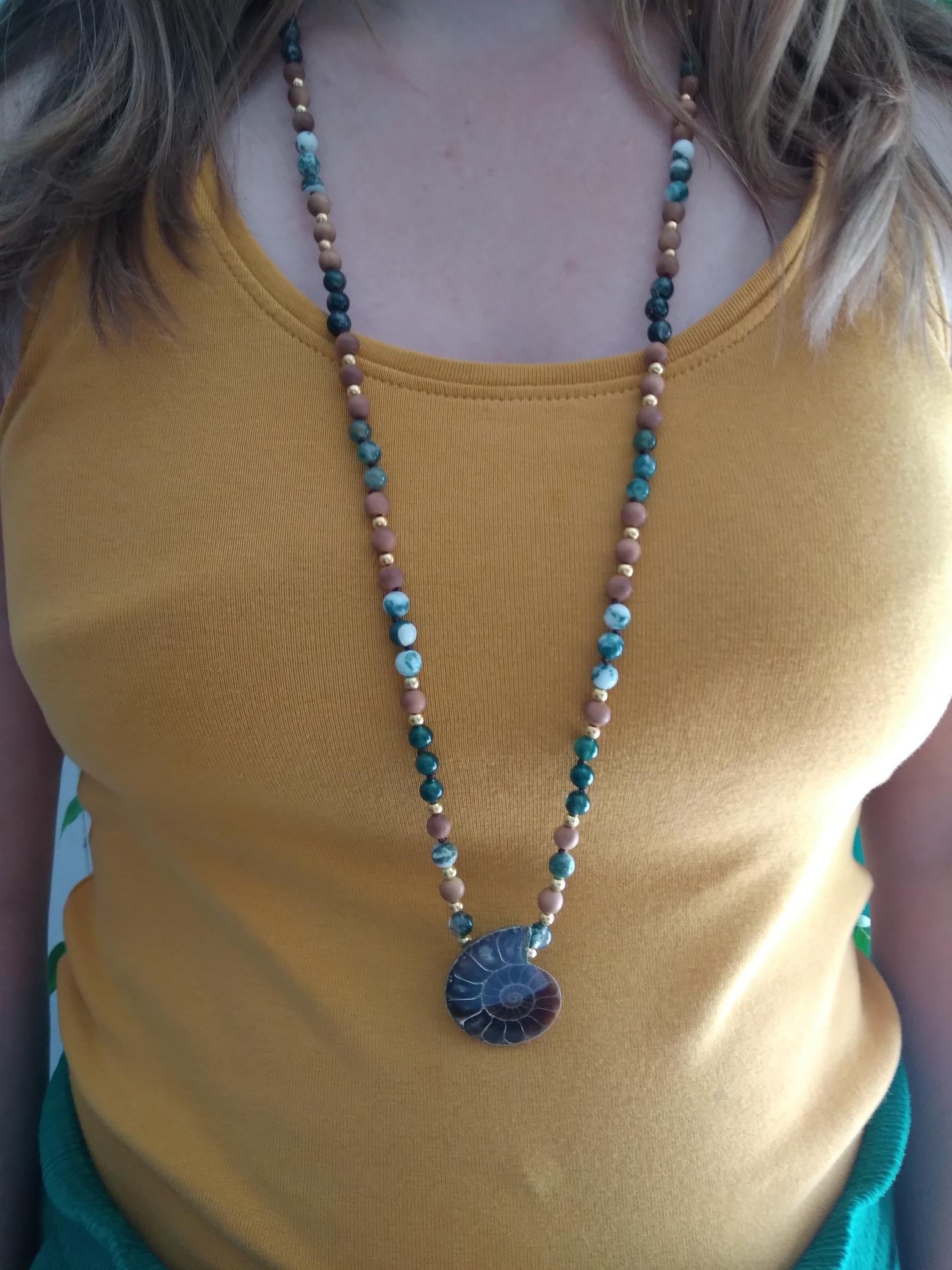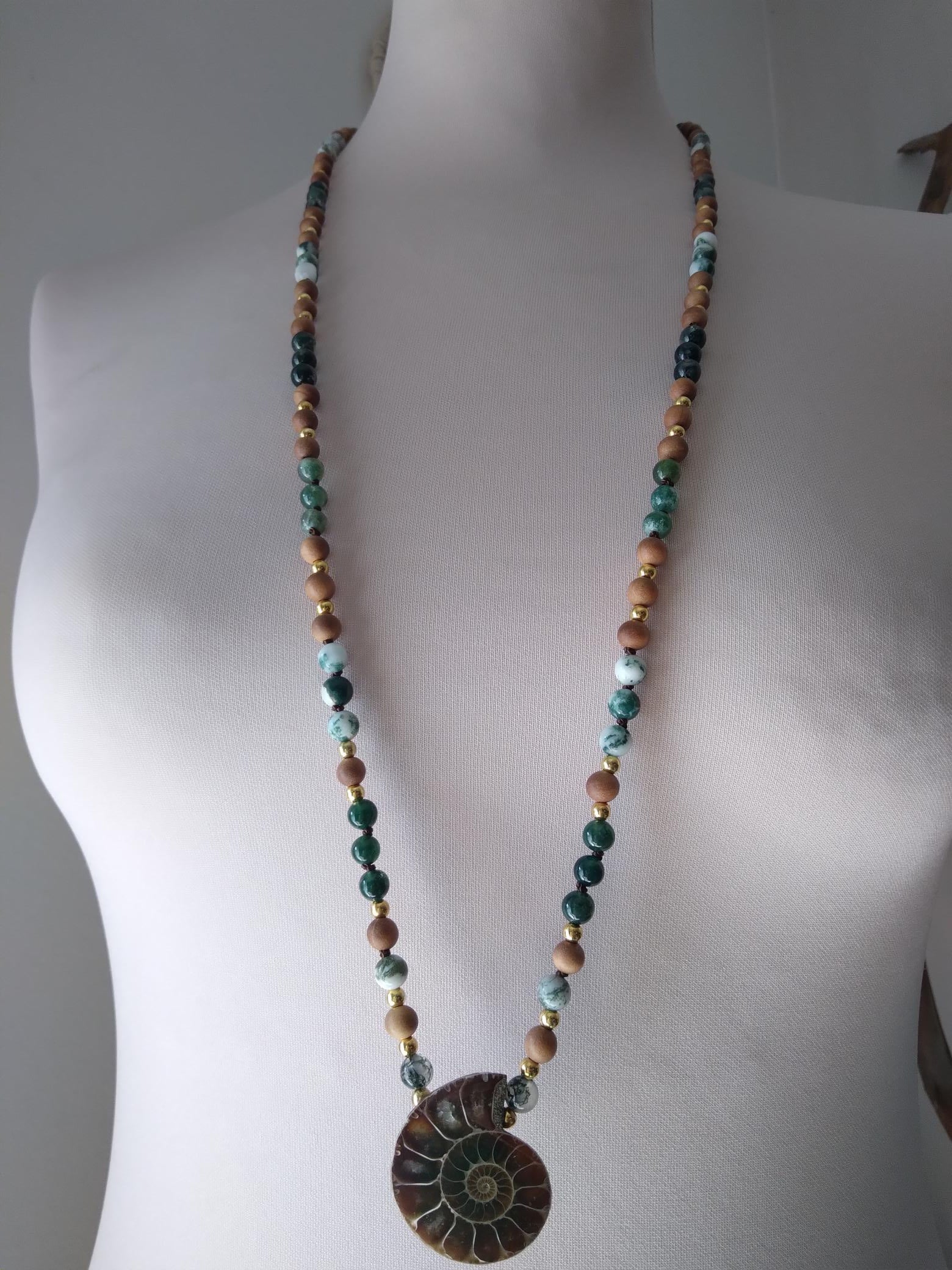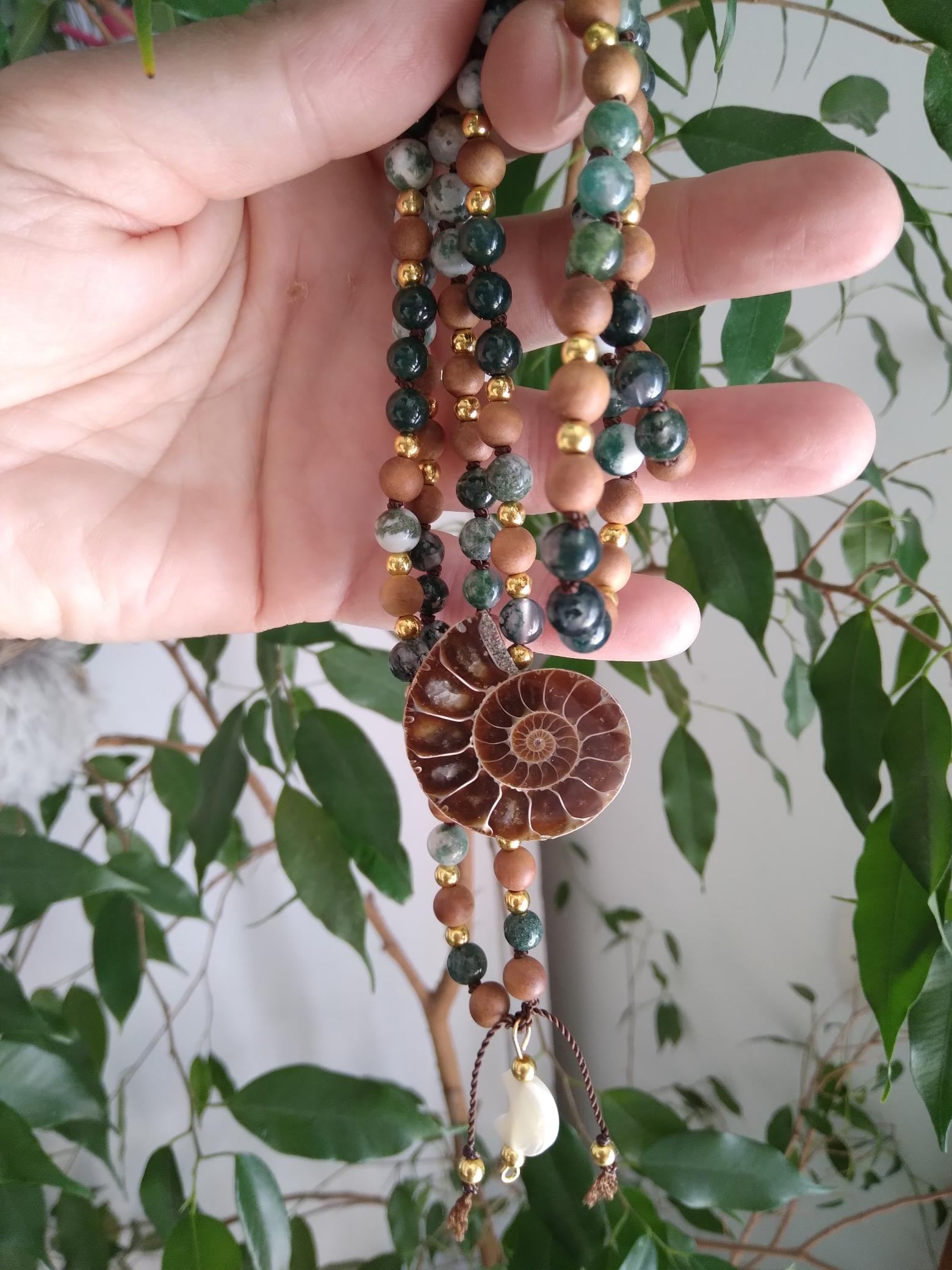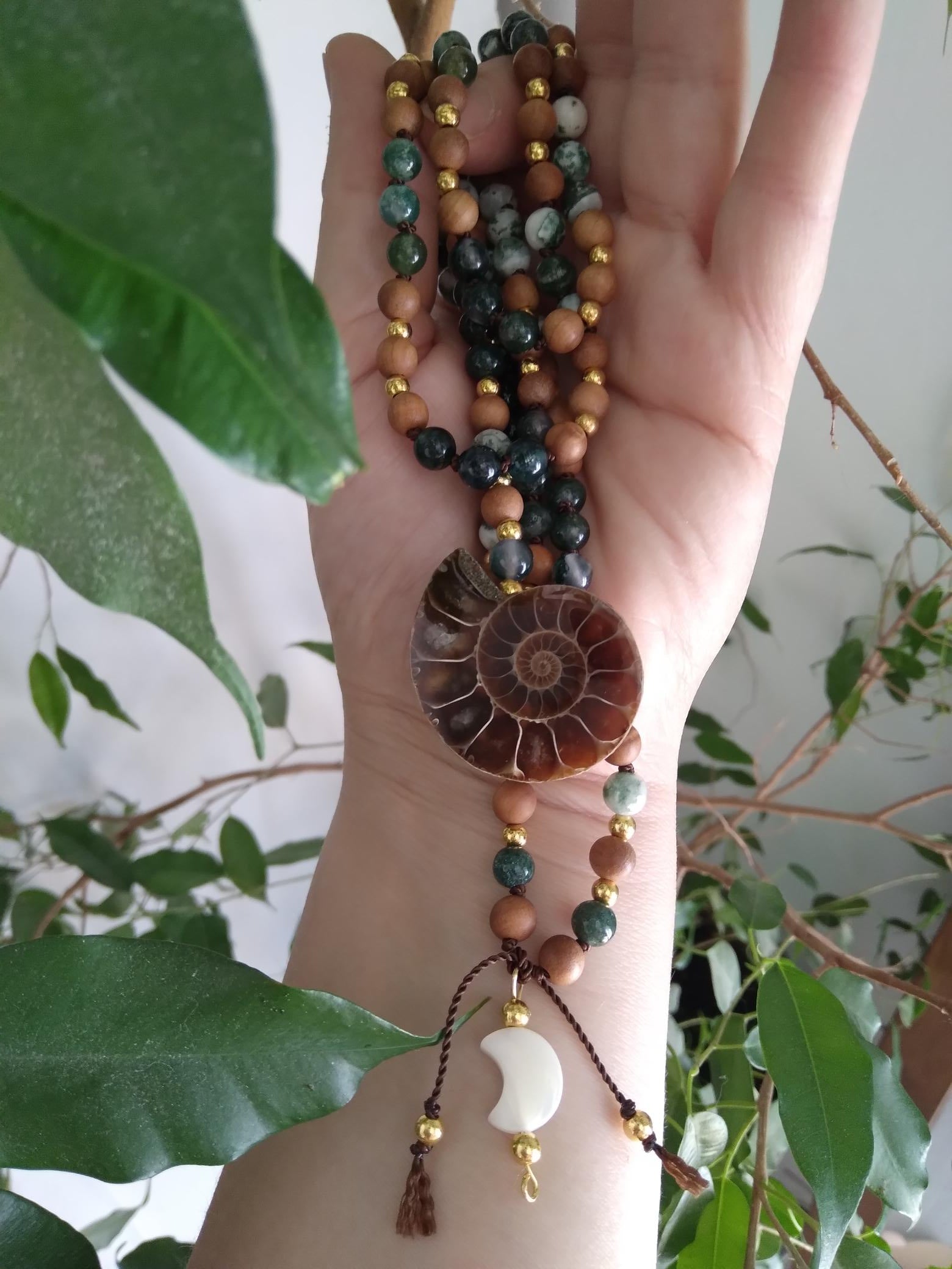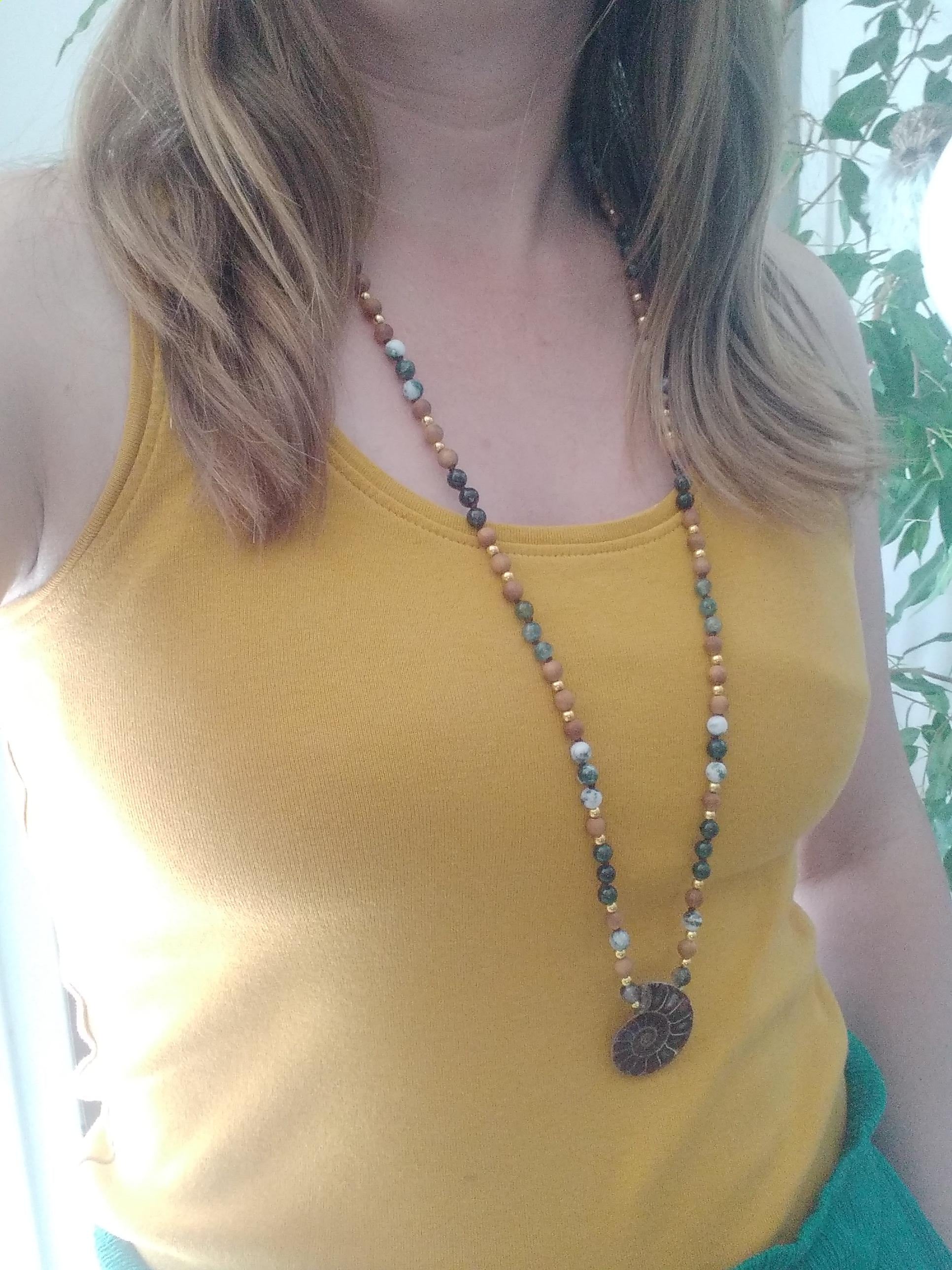 Mala composé de perles en agate mousse, agate arbre, bois de santal et ammonite pour se connecter pleinement à la nature, s'ancrer et s'apaiser