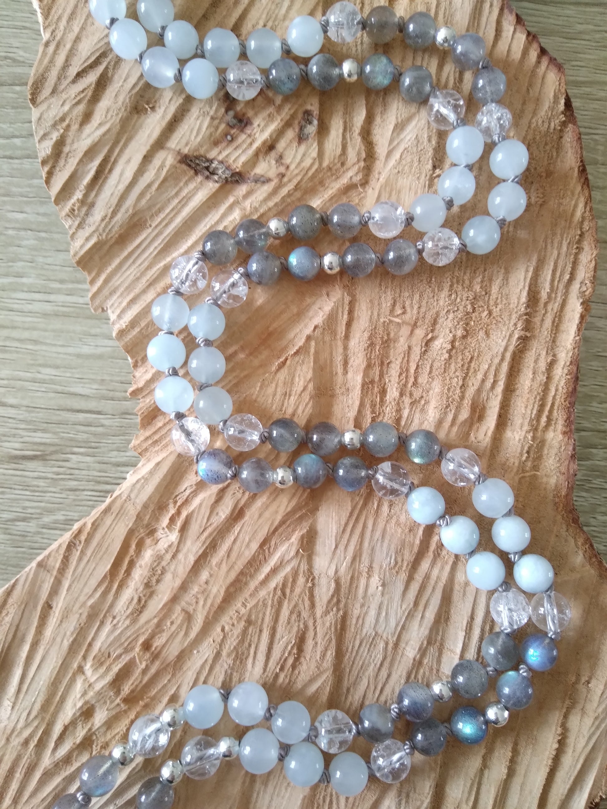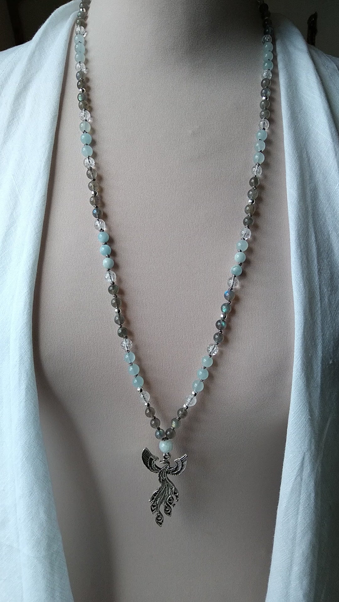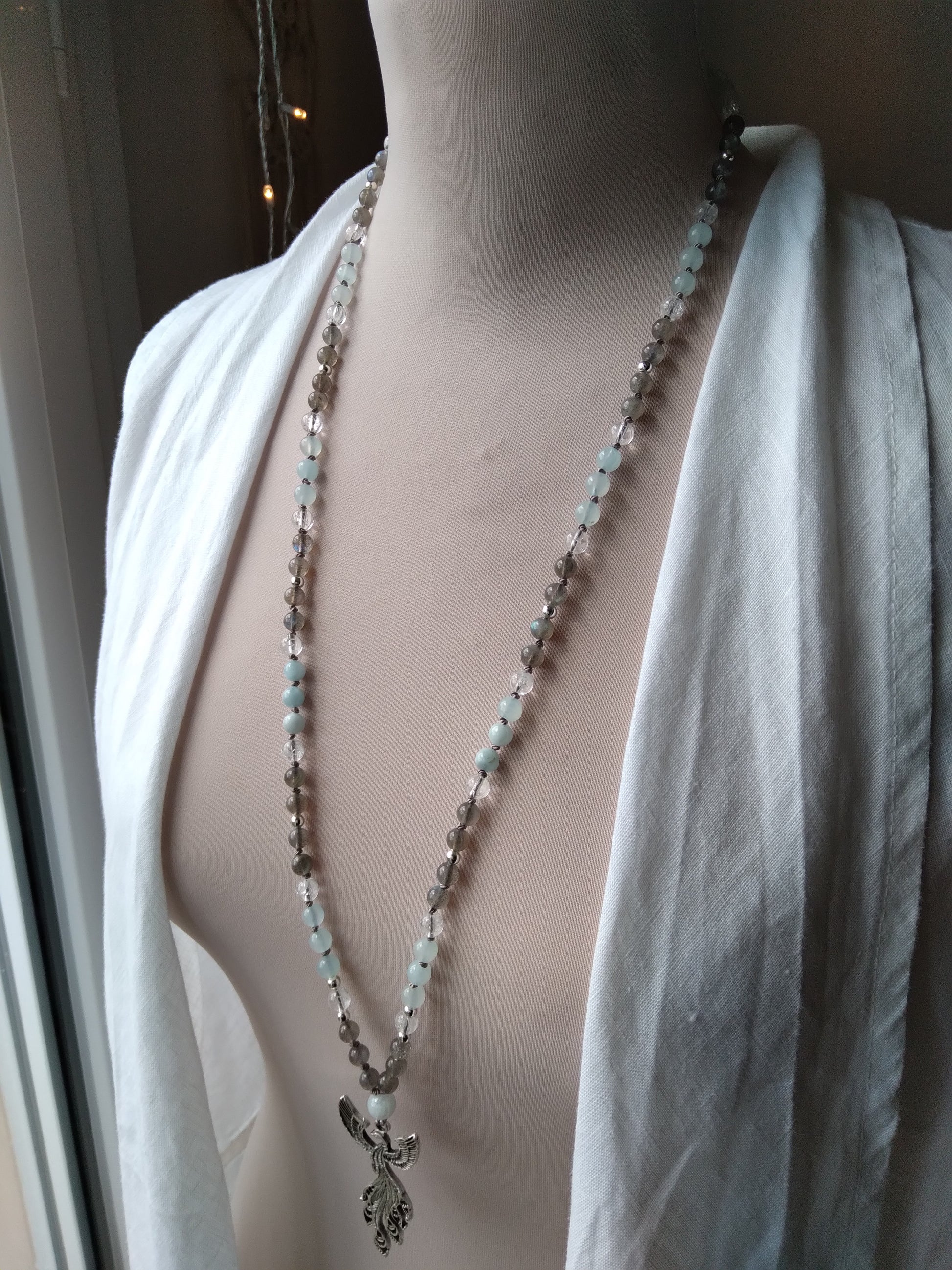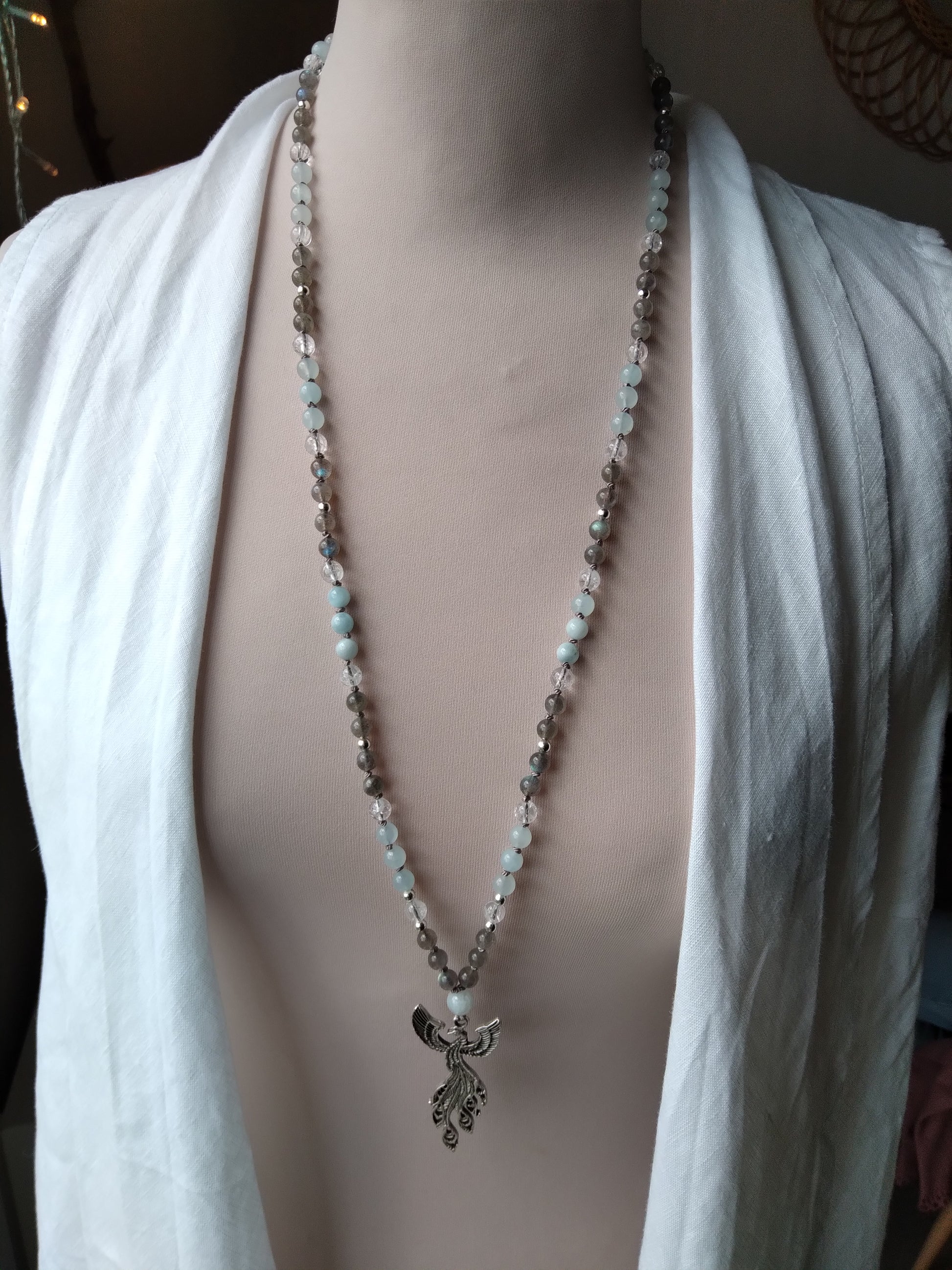 Mala phénix en aigue-marine, labradorite, jade blanc et cristal de roche