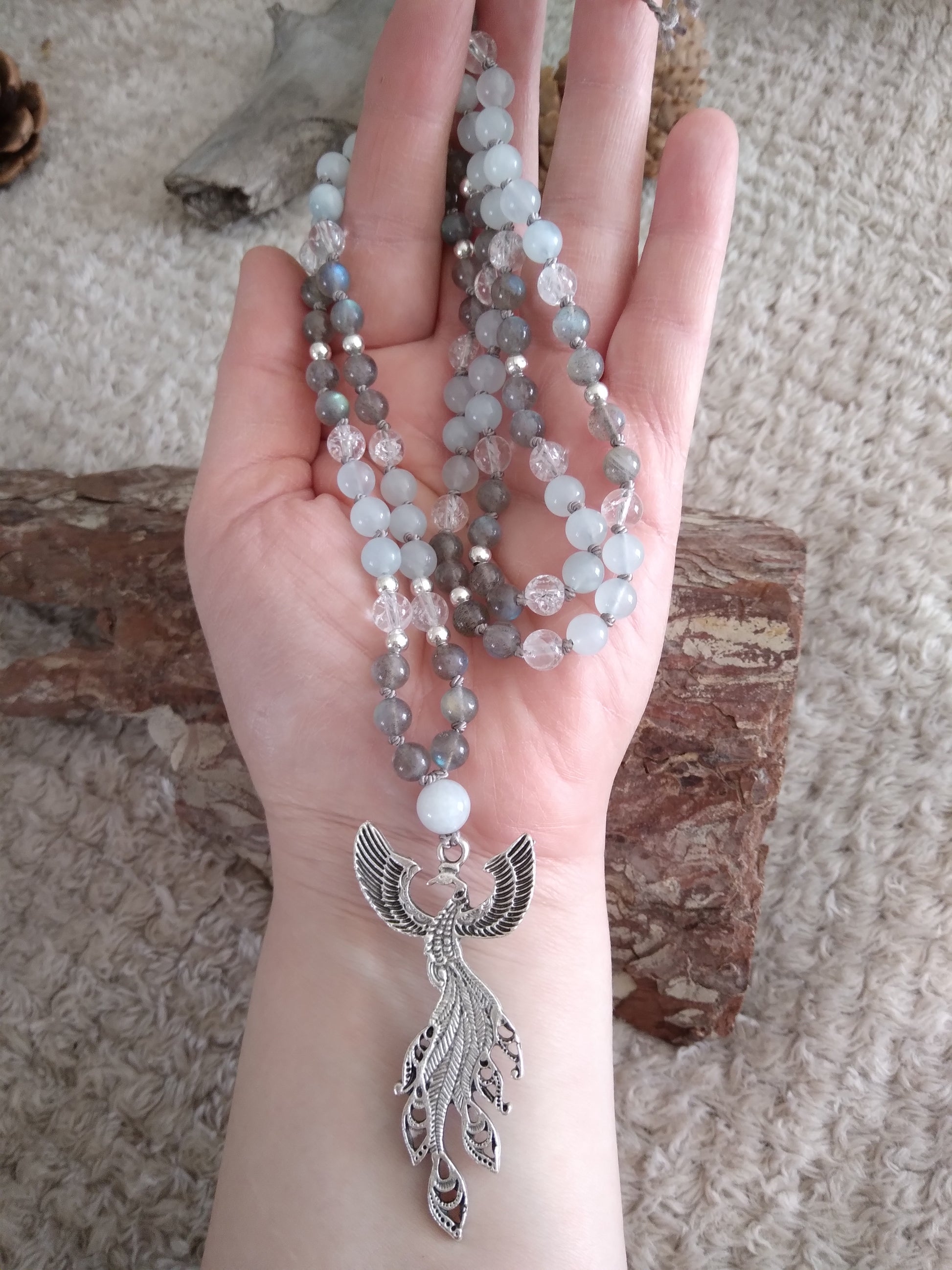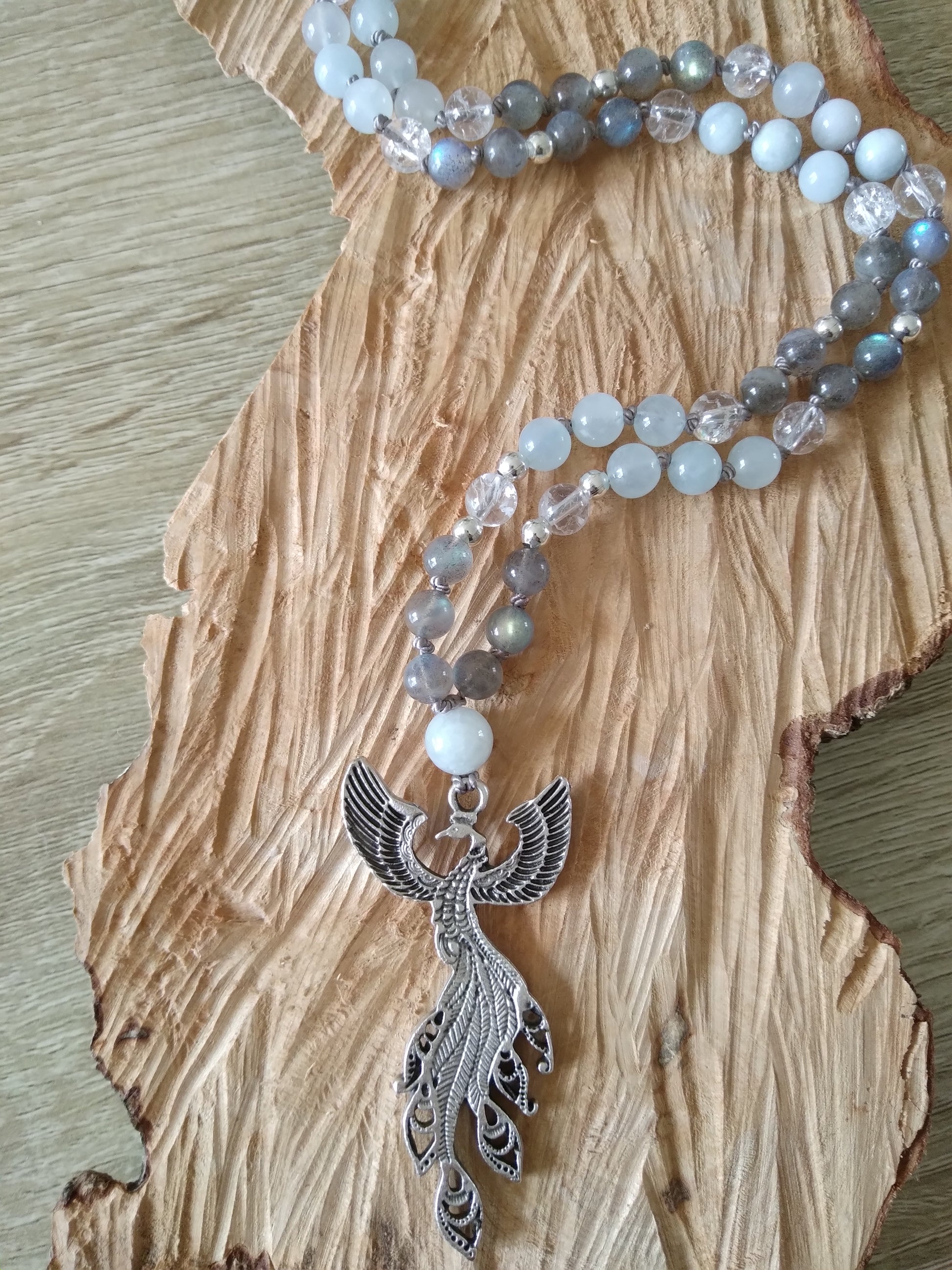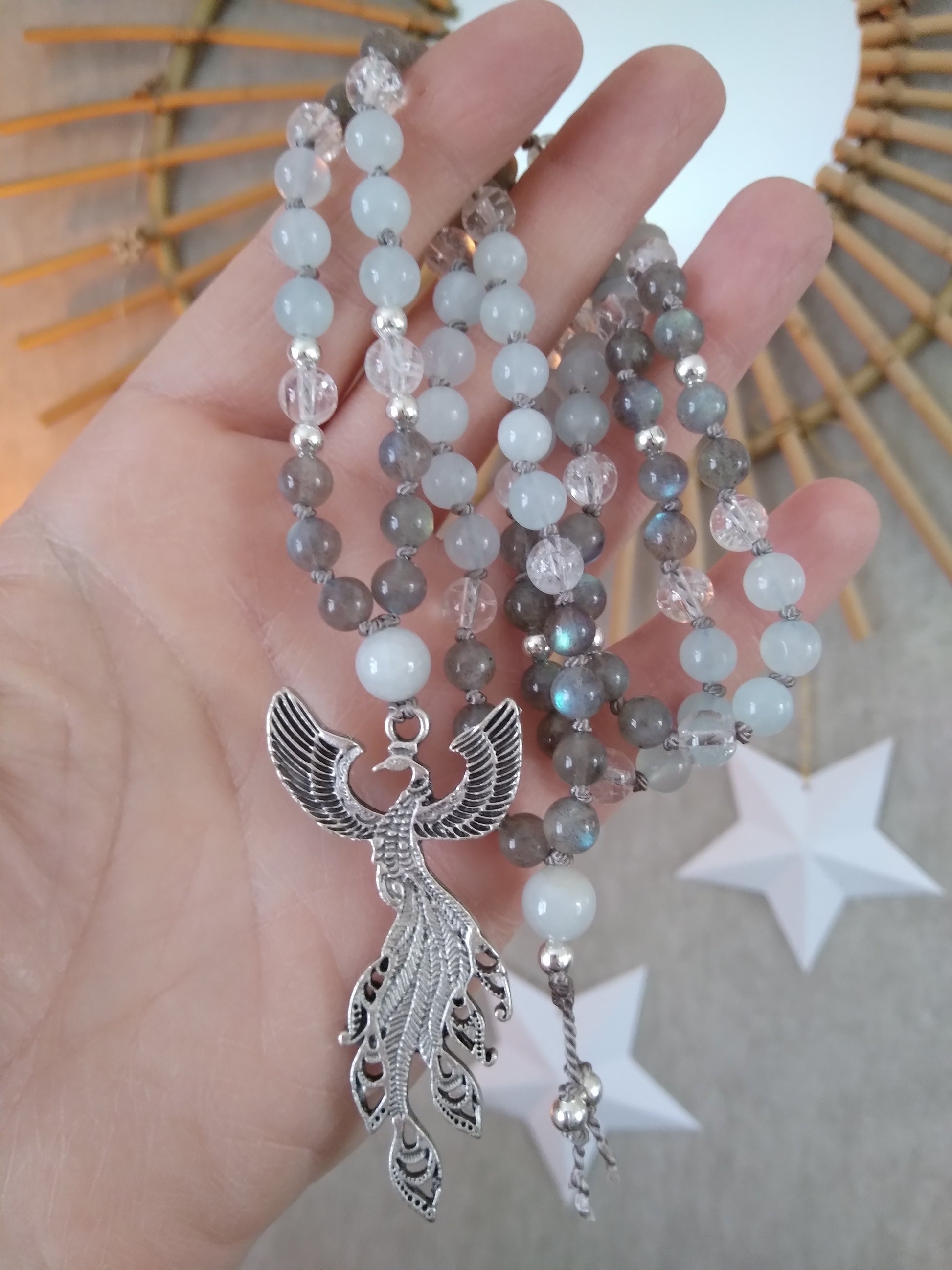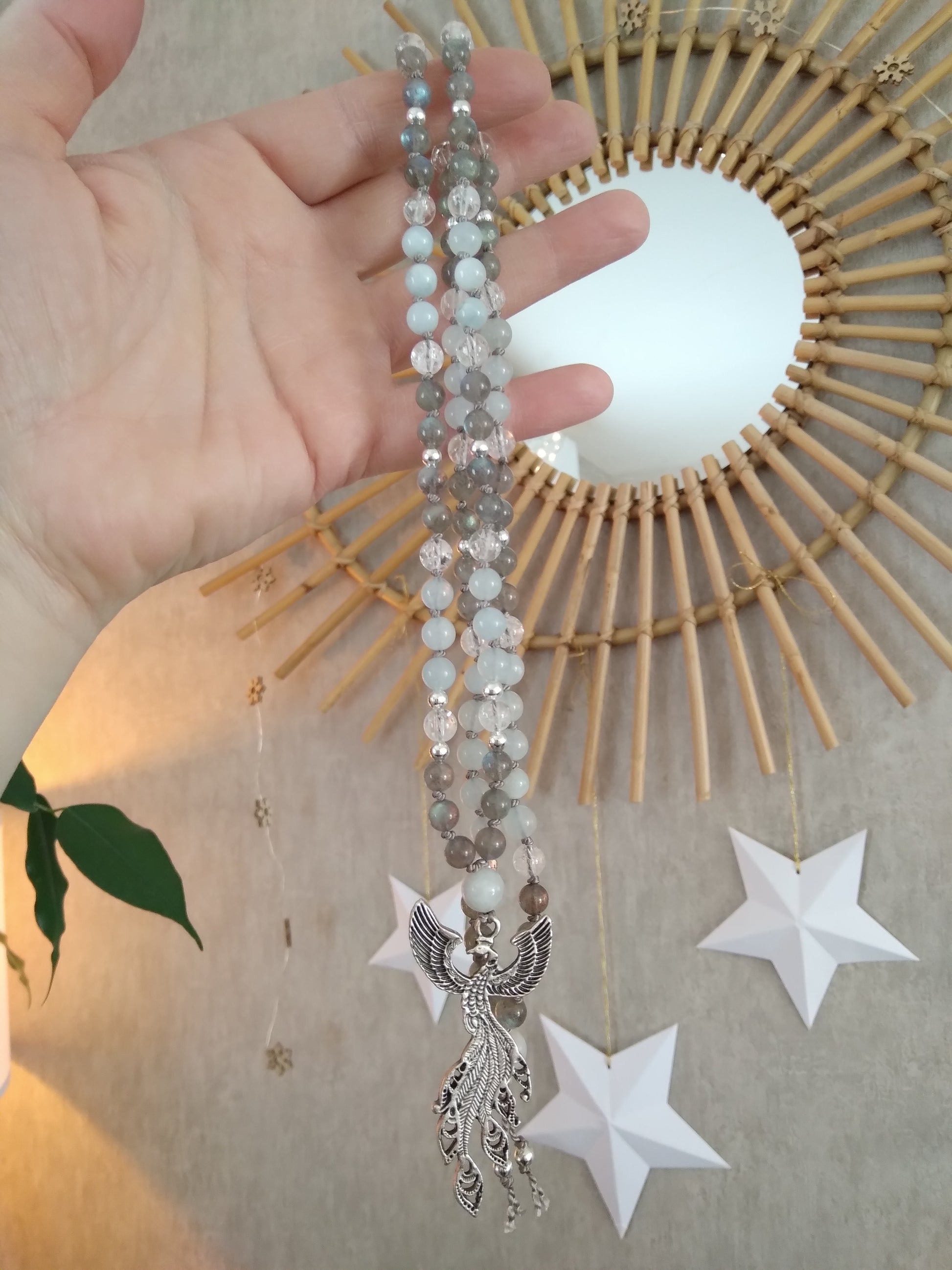 Ce mala comporte des pierres naturelles sélectionnées pour leur qualité. Il a été associé à un pendentif phénix. Les finitions ont été réalisées avec de délicates perles argentées.