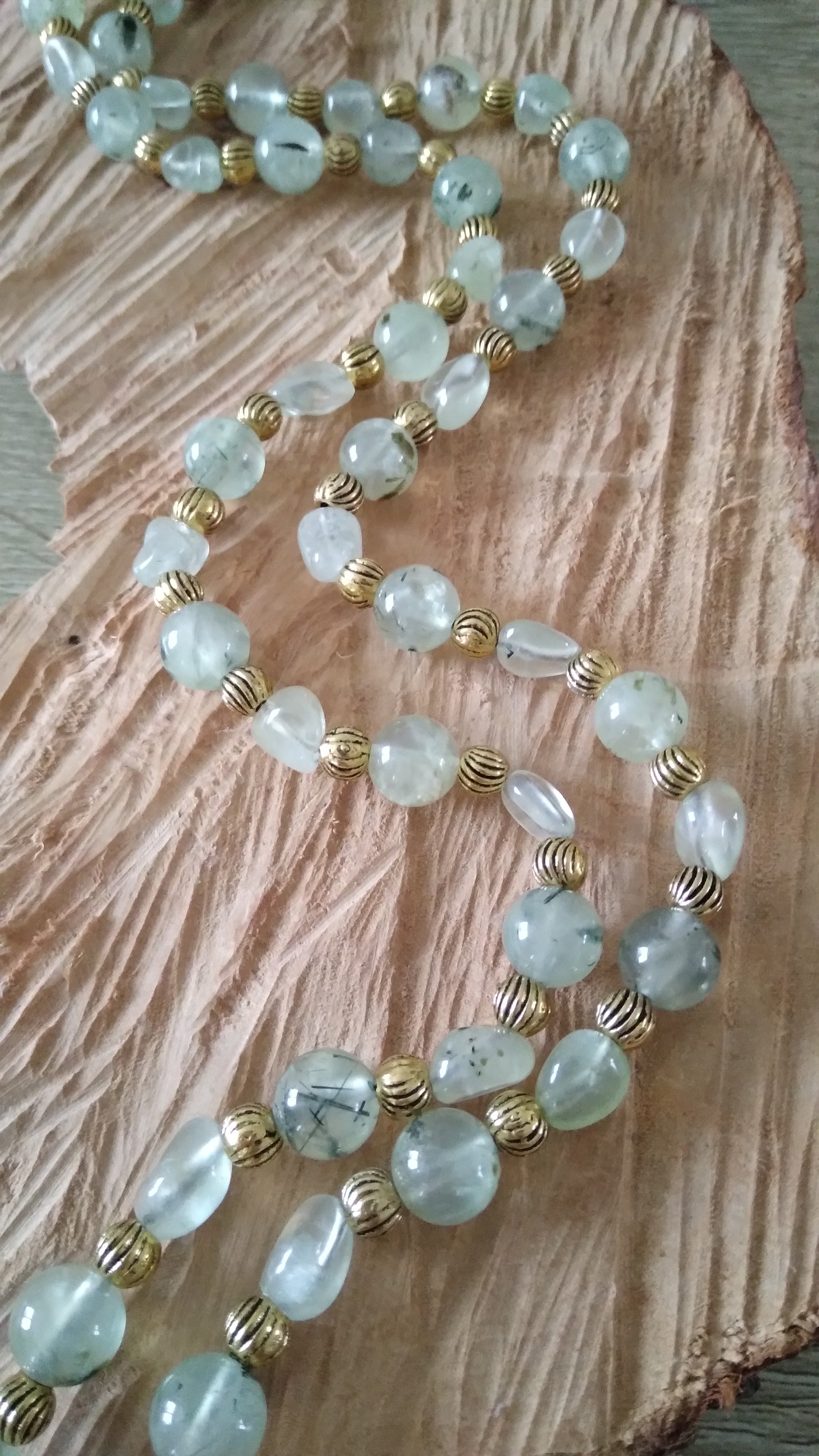 Ce mala est composé de perles rondes et de nuggets en préhnite.