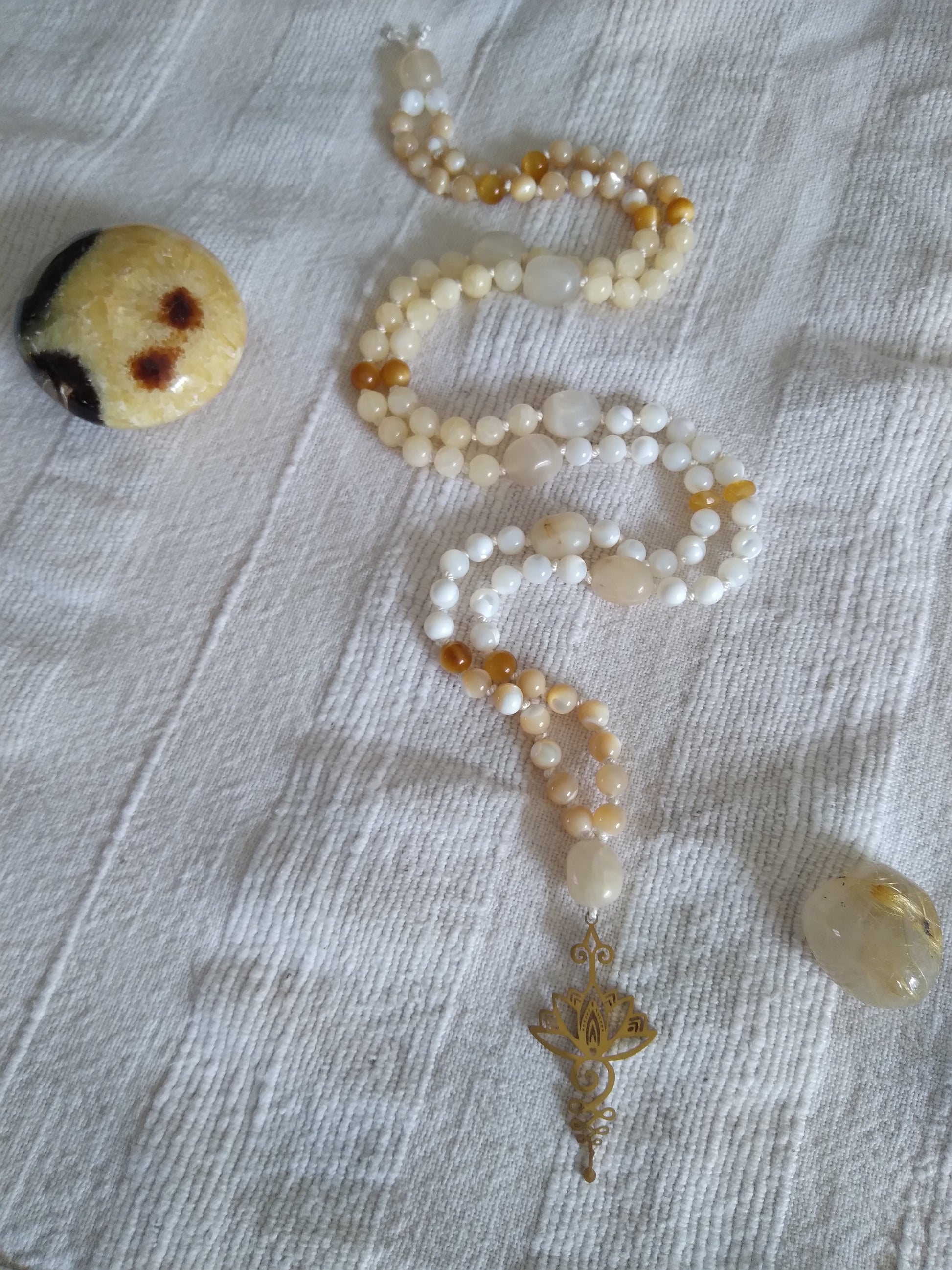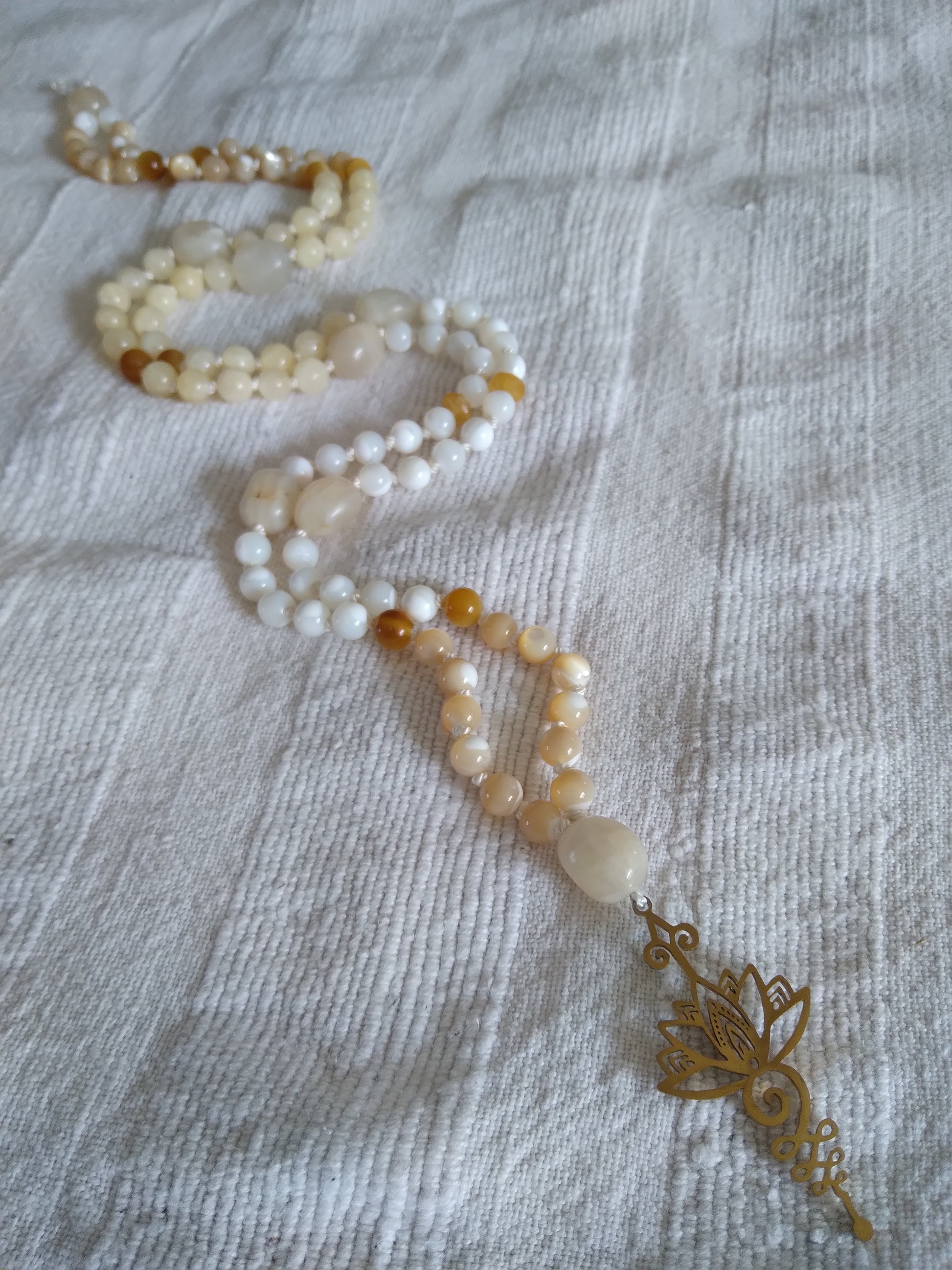 Mala unalome "Le chemin vers l'éveil" en nacre, pierre de lune, calcite jaune, œil de tigre doré et héliodore