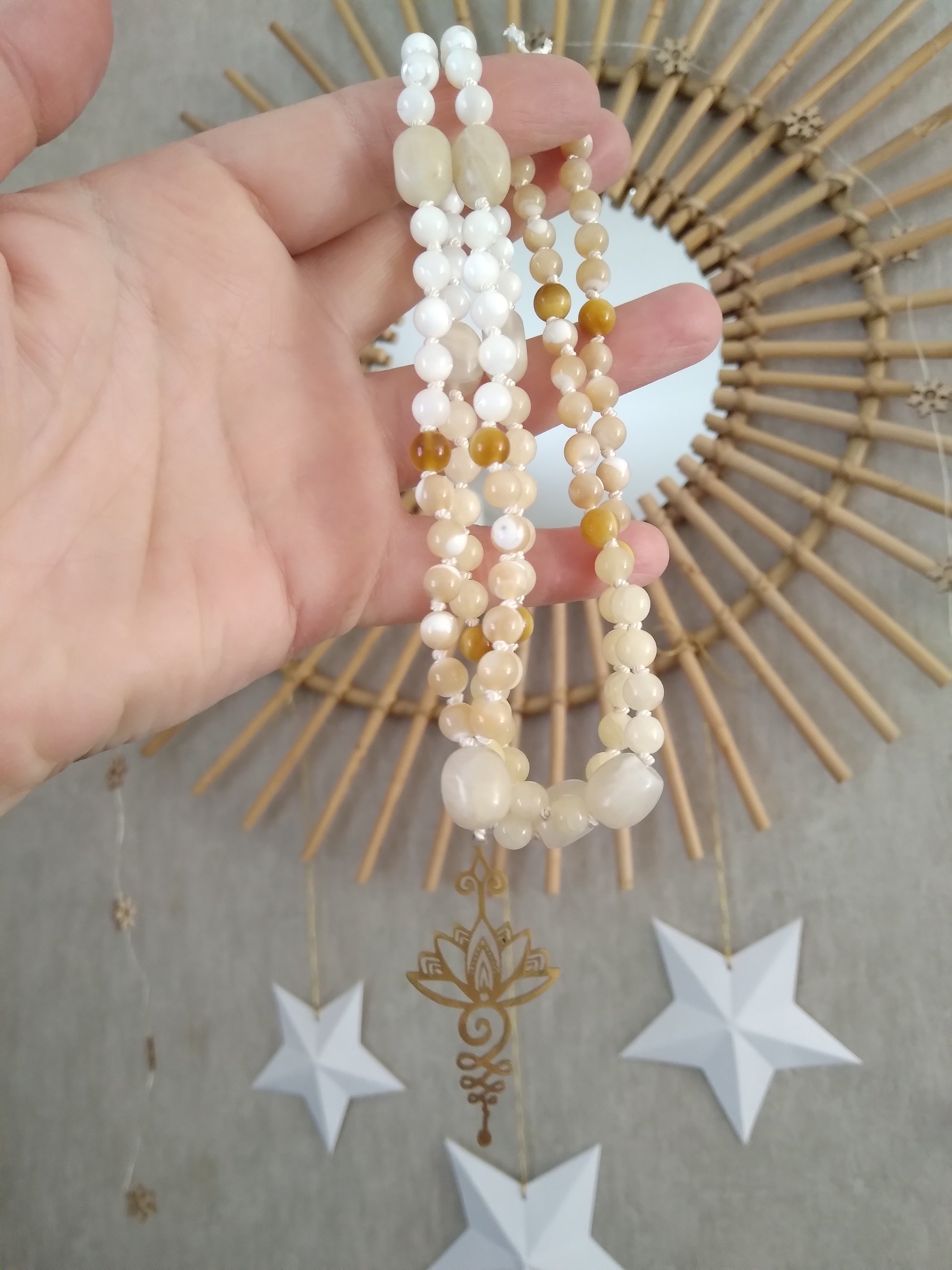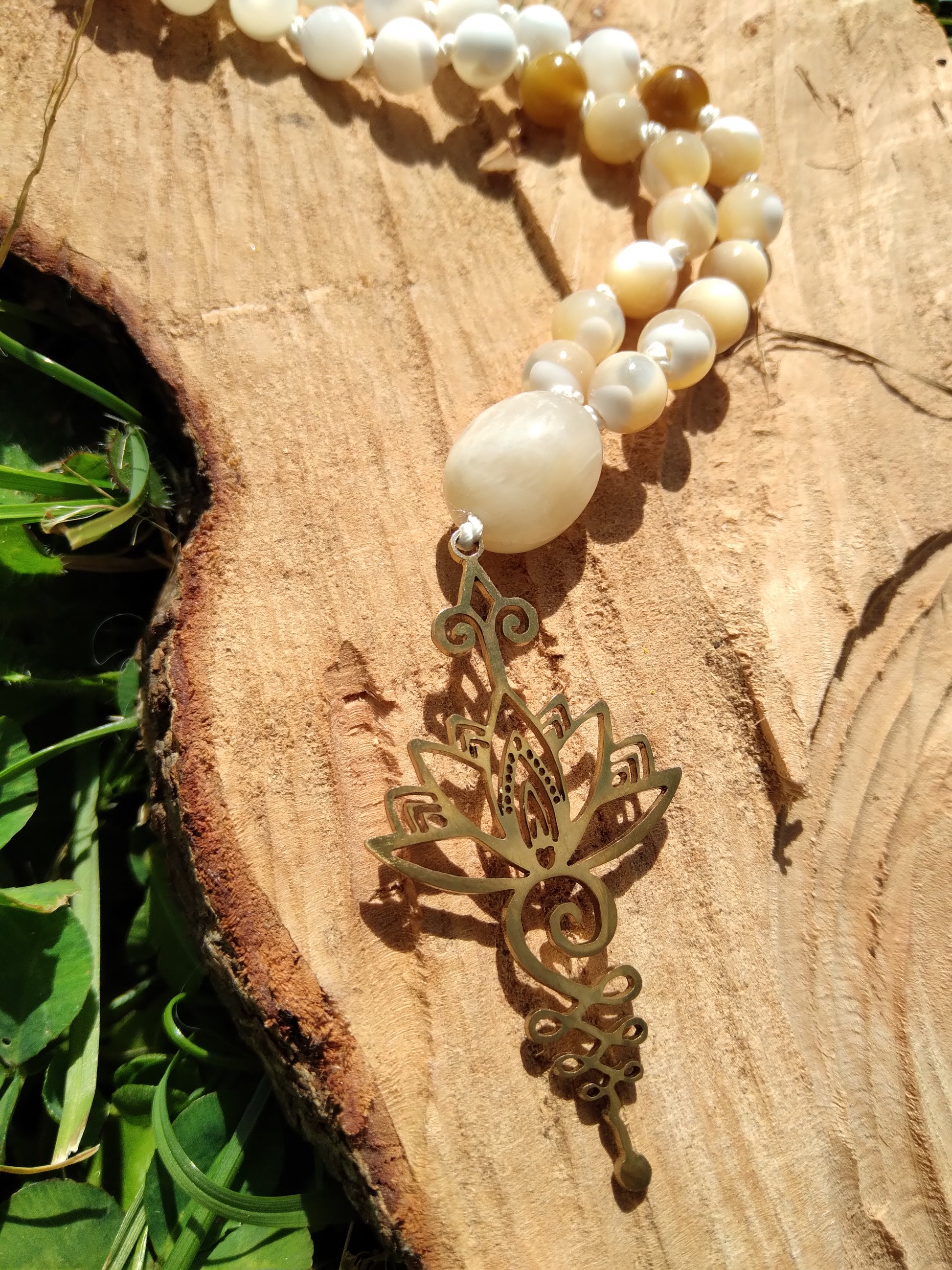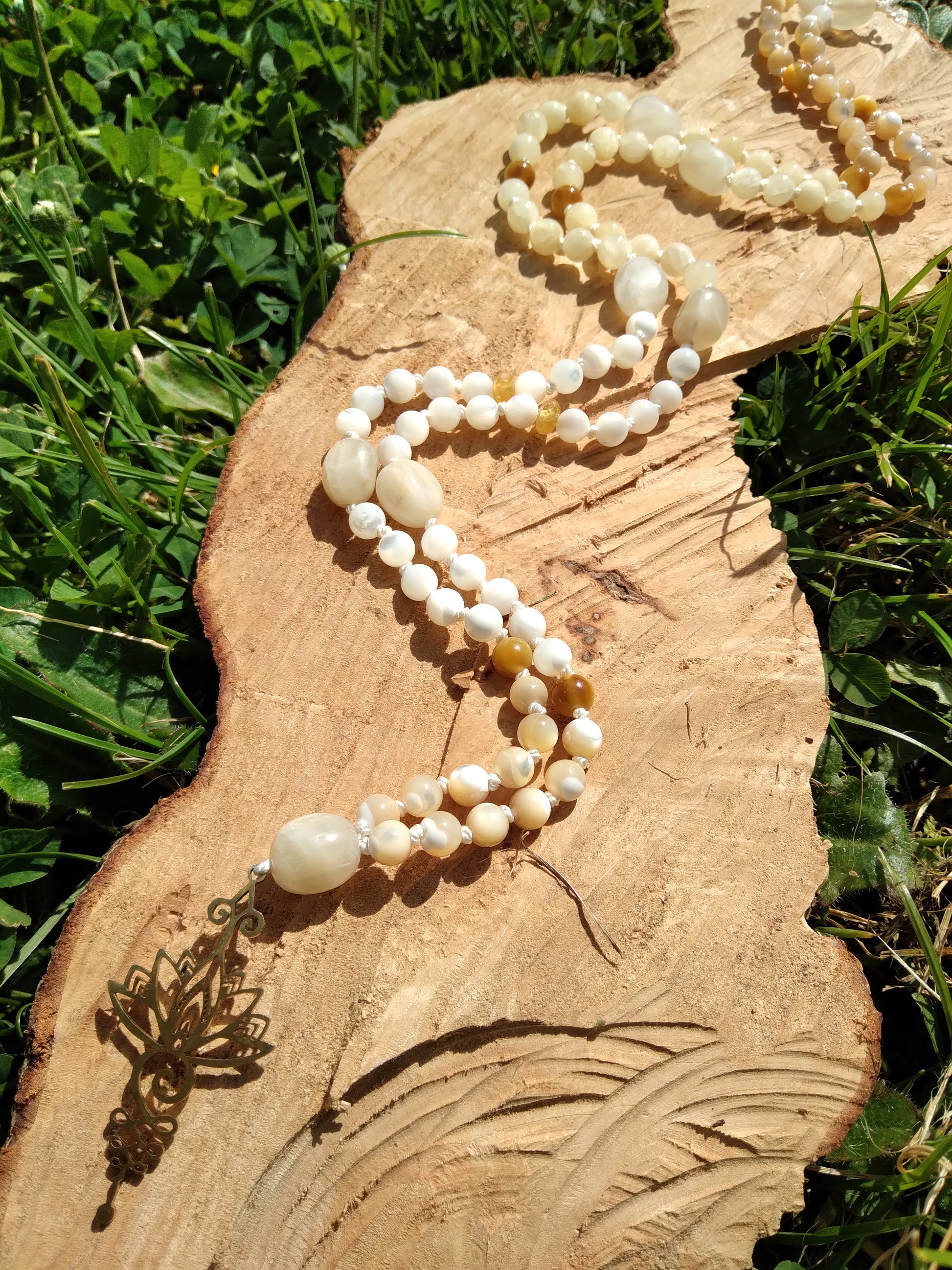 Mala Unalome "Le chemin vers l'éveil" en nacre, pierre de lune, calcite jaune, œil de tigre doré et héliodore