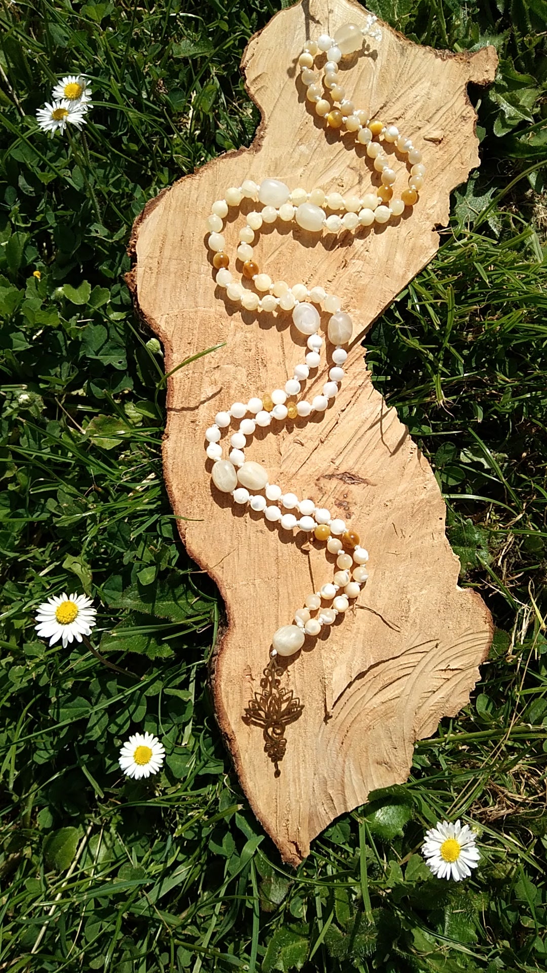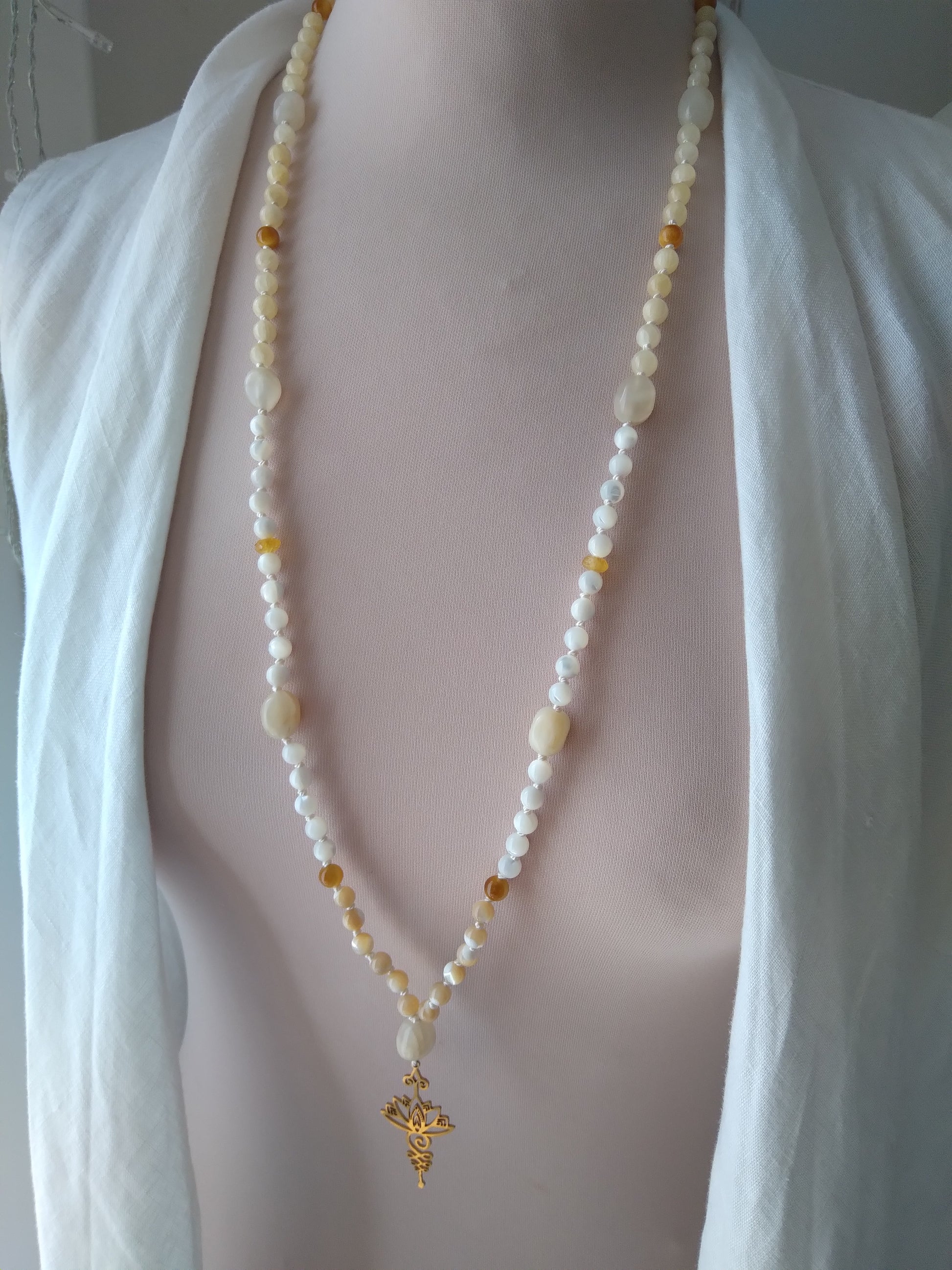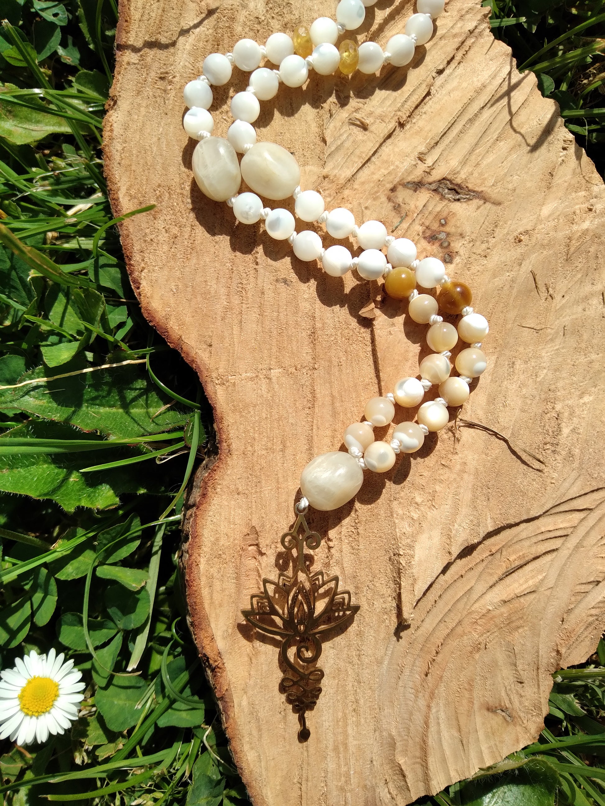Mala Unalome "Le chemin vers l'éveil" en nacre, pierre de lune, calcite jaune, œil de tigre doré et héliodore