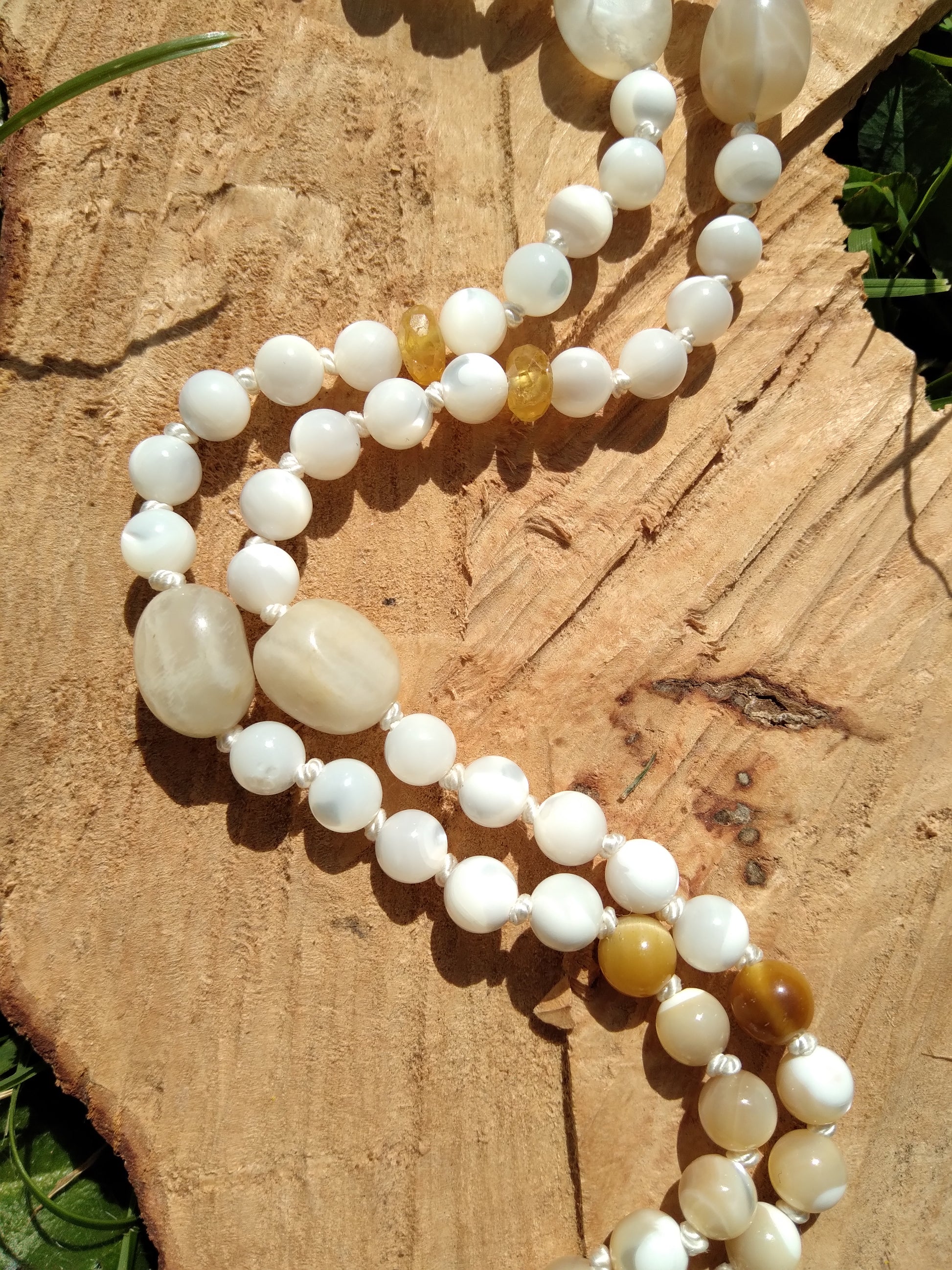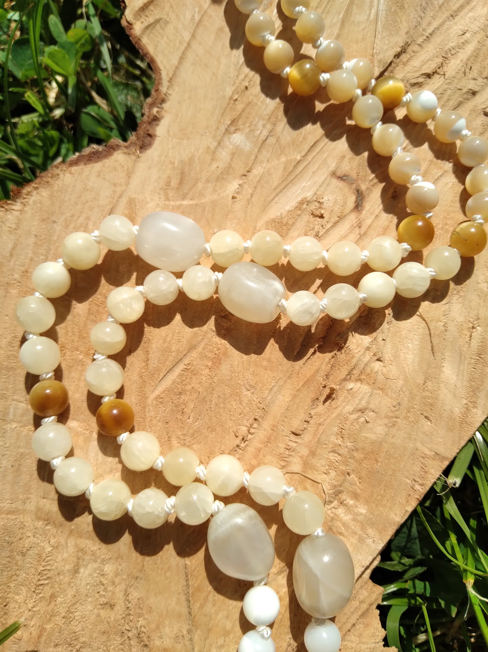 Perles en nacre, calcite jaune, œil de tigre doré et pierre de lune