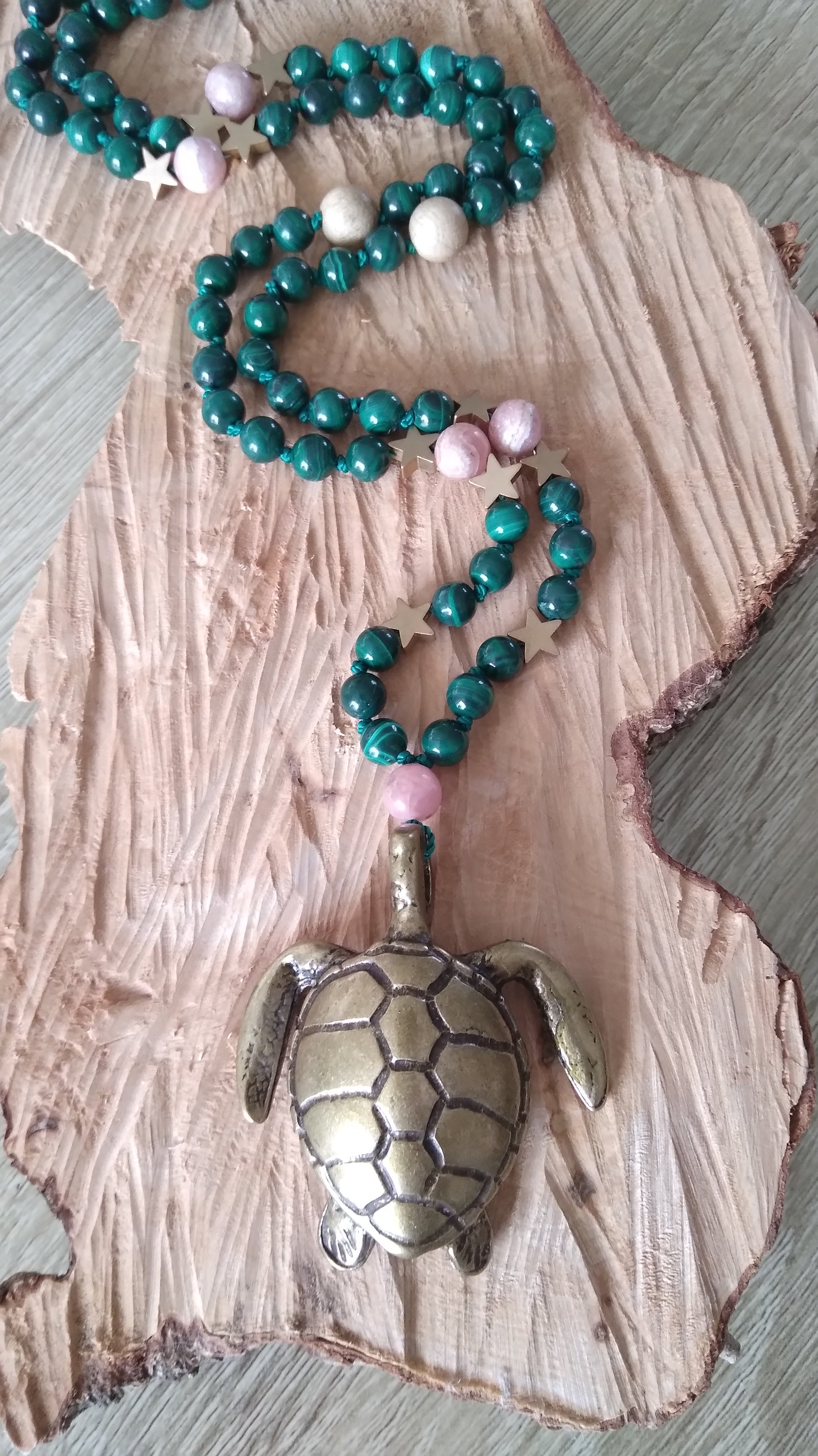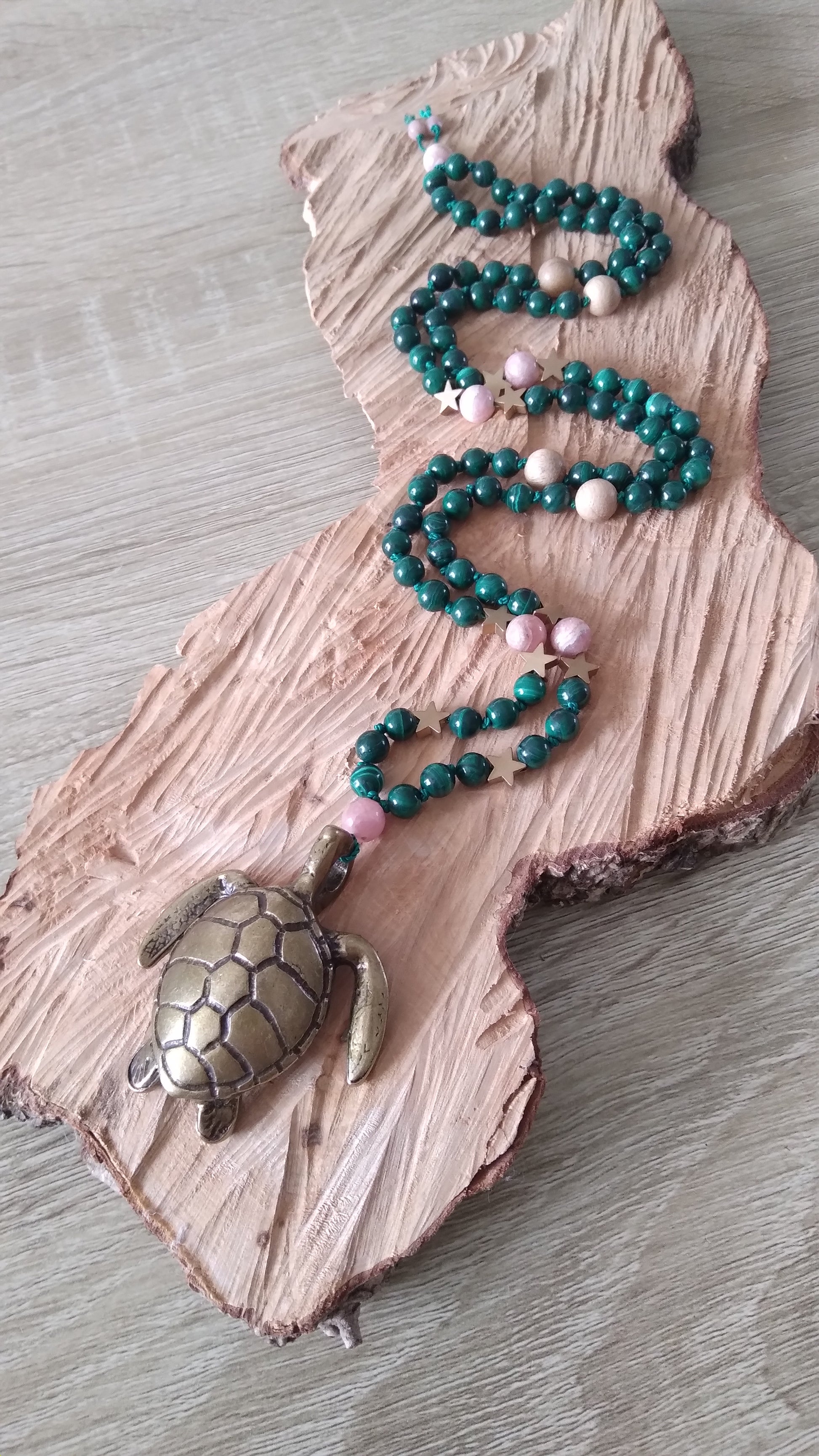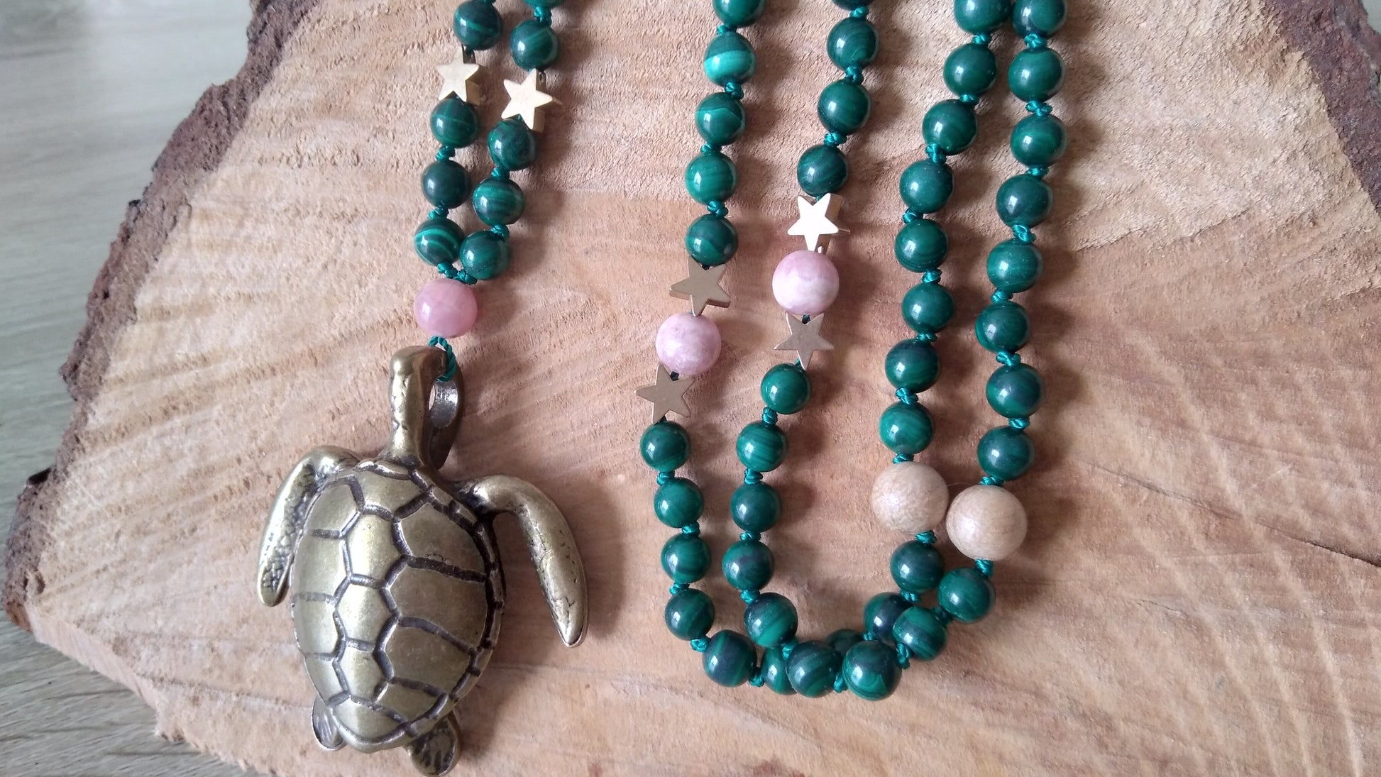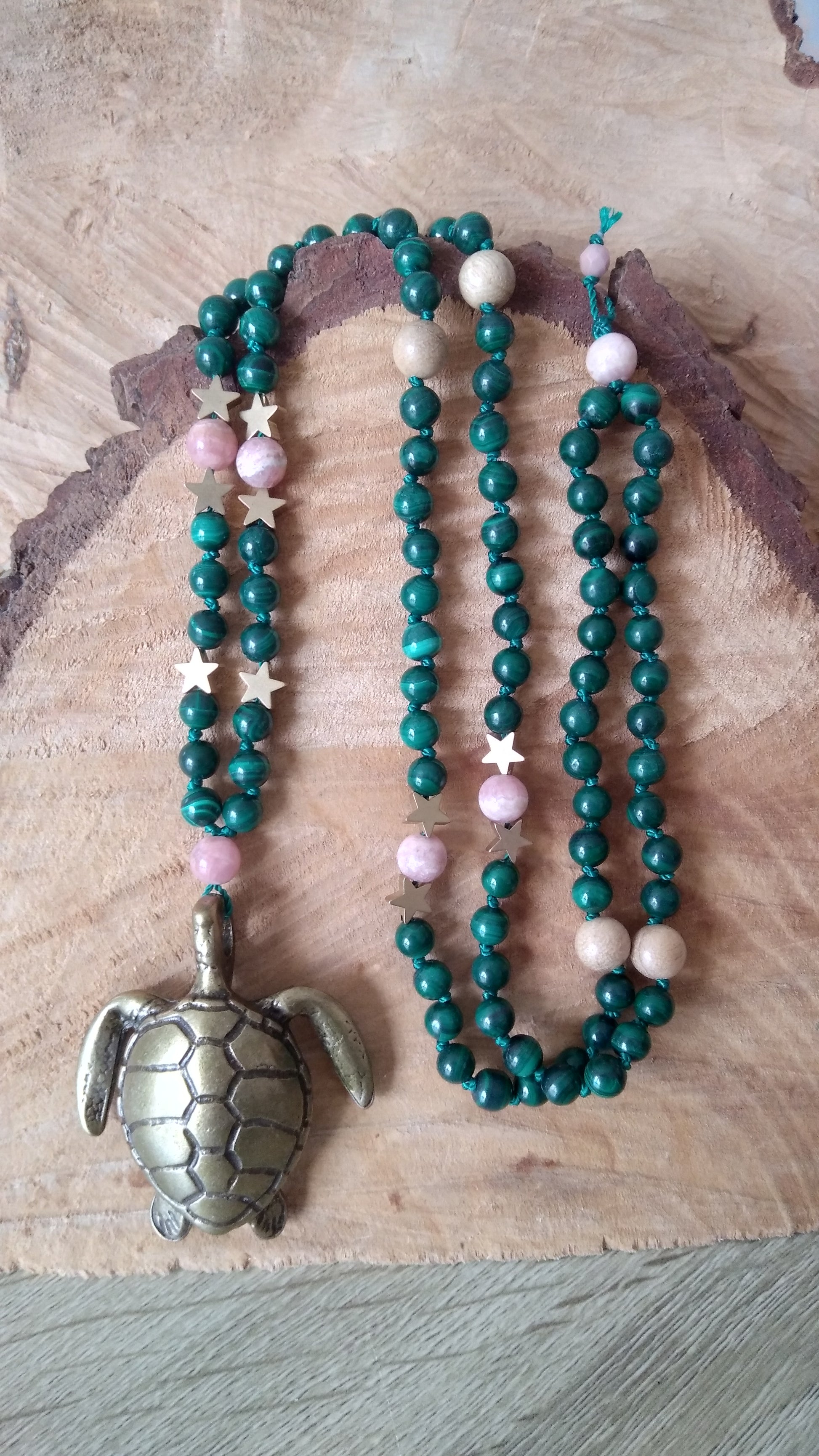 Mala "Tortue" en malachite, rhodochrosite, rhodonite et camphre