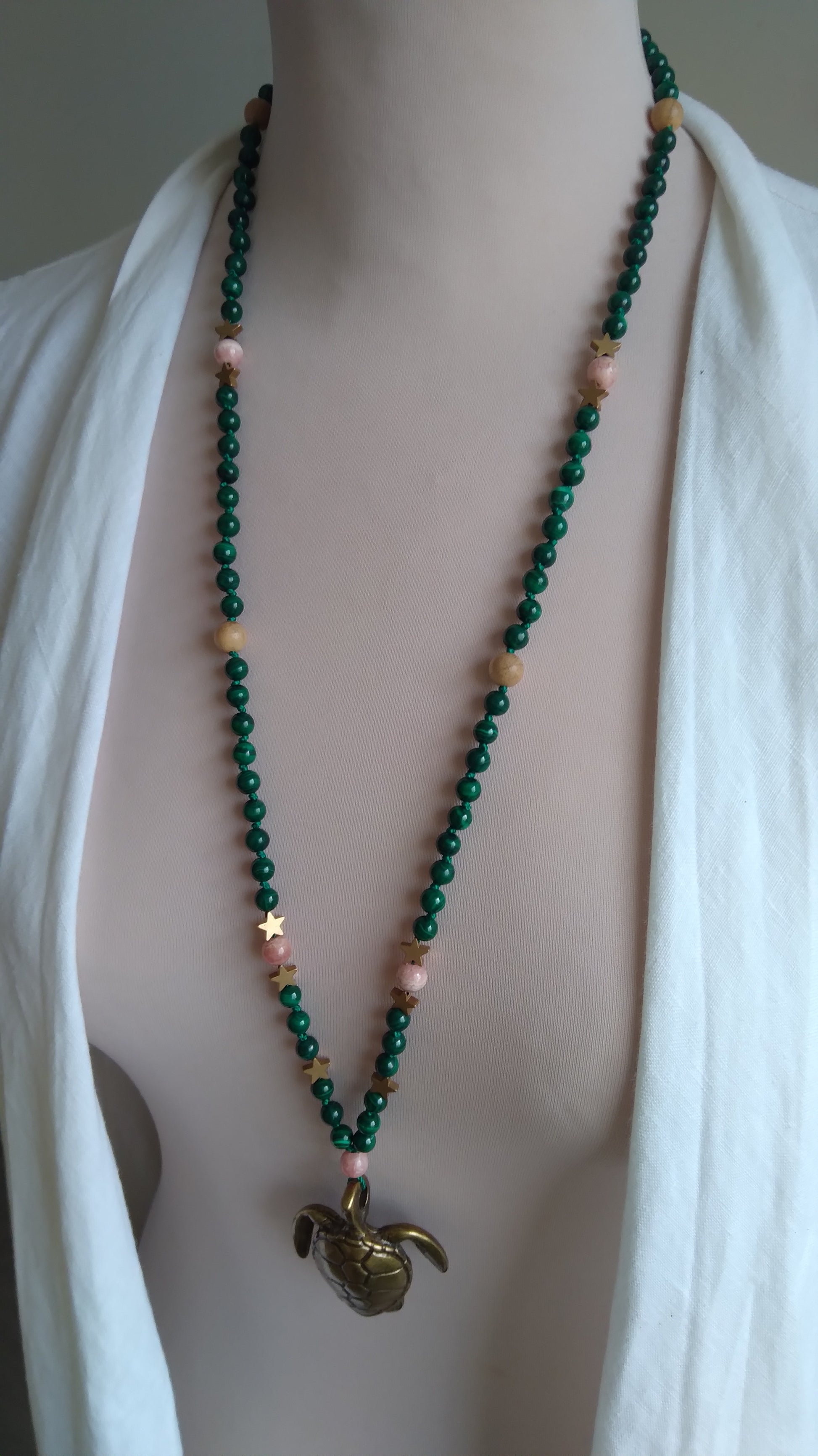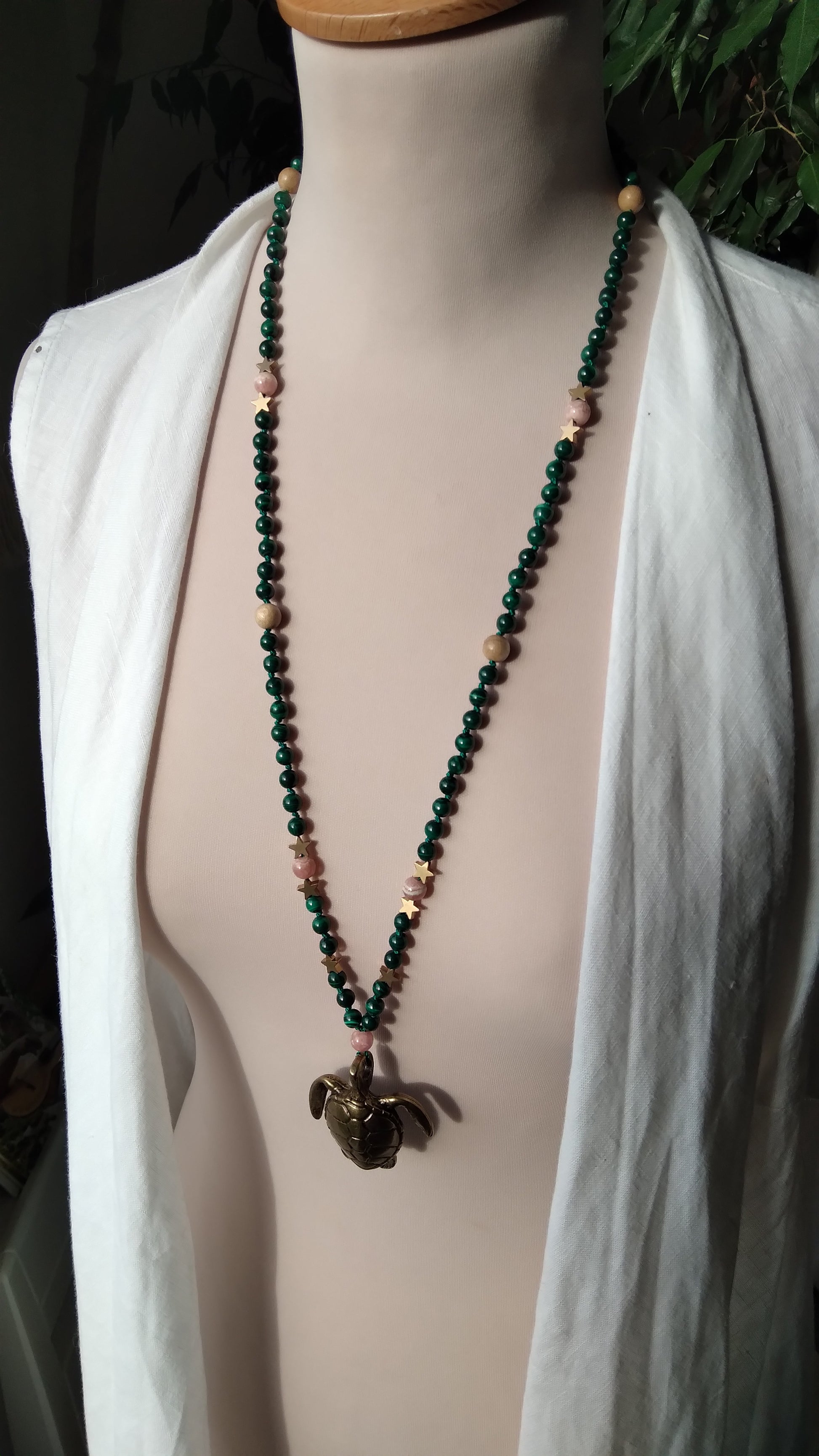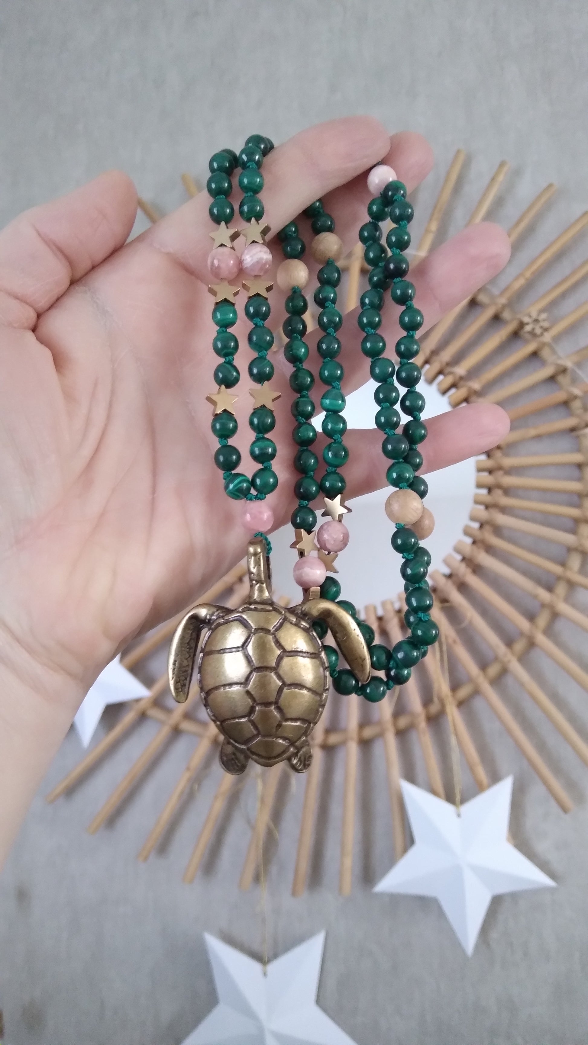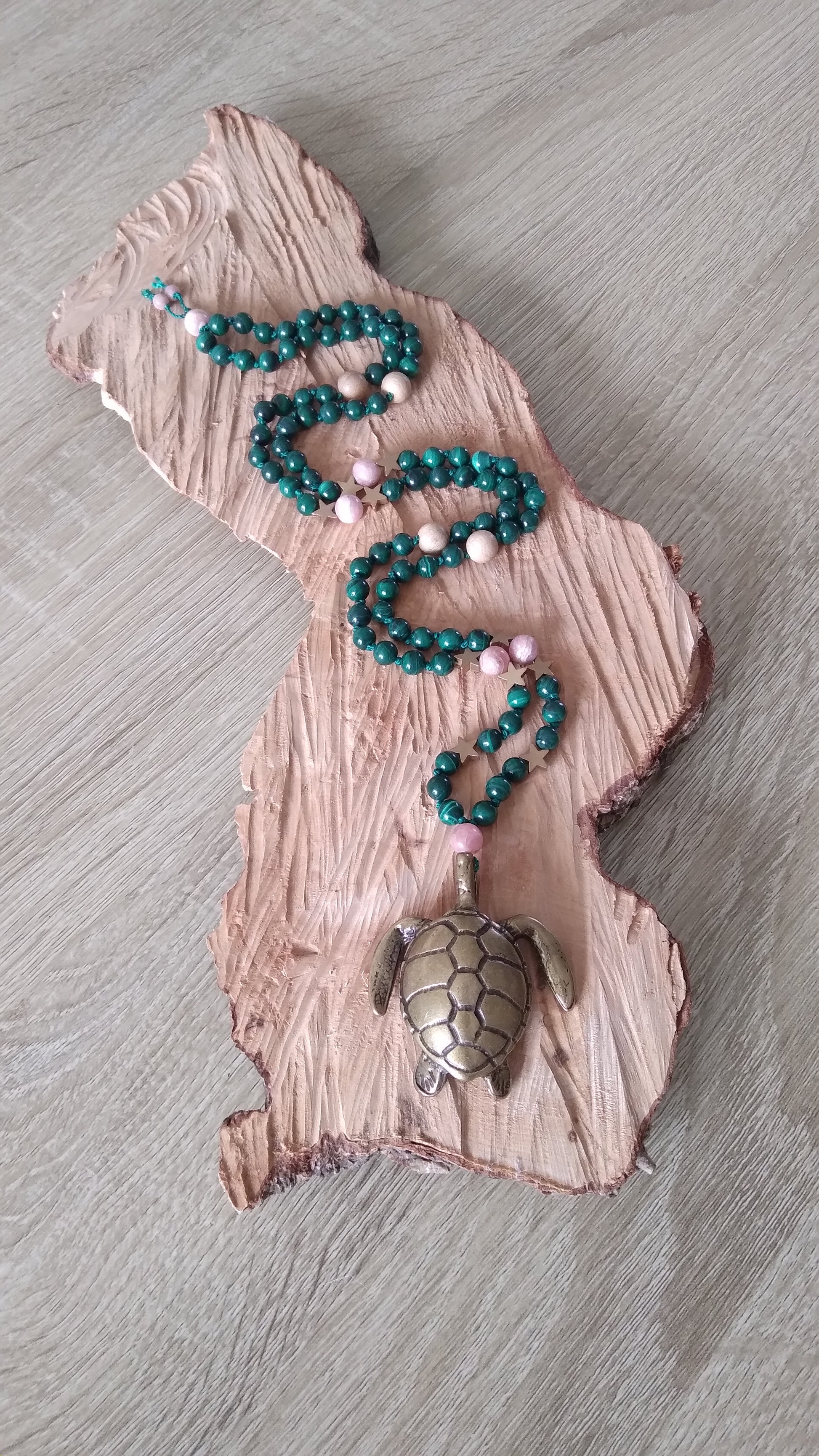 Mala "Tortue" en malachite, rhodochrosite, rhodonite et camphre